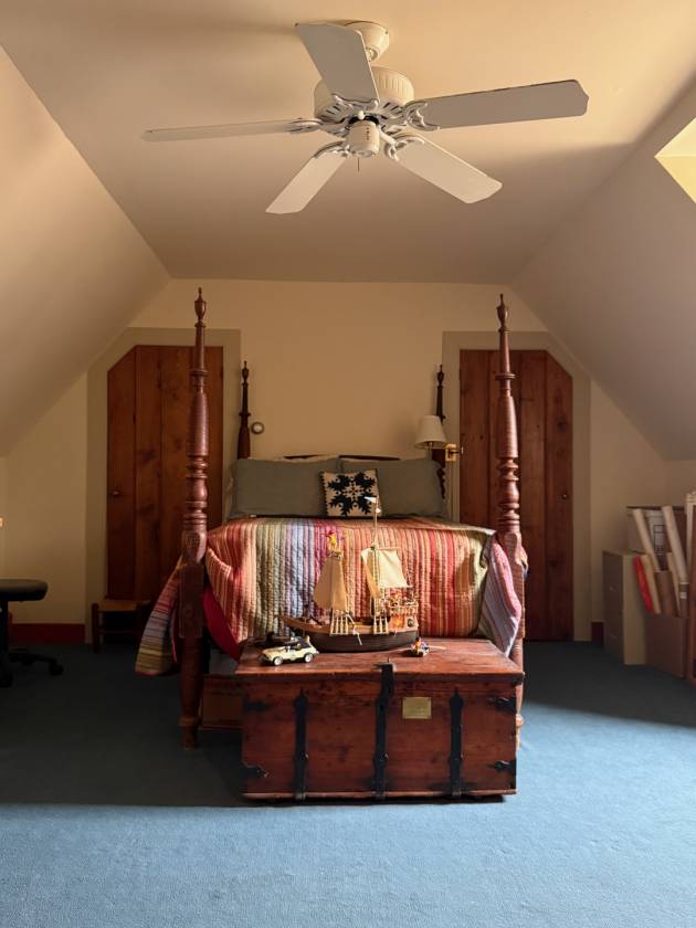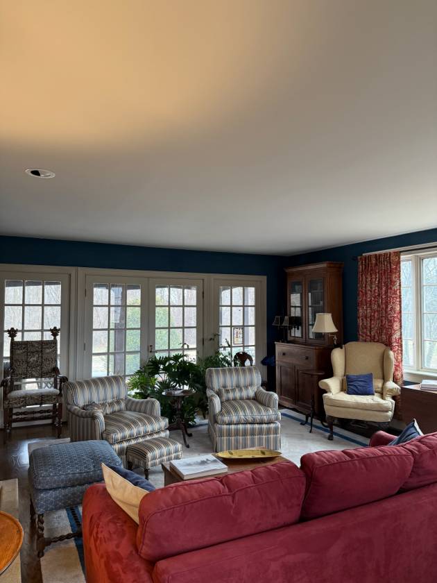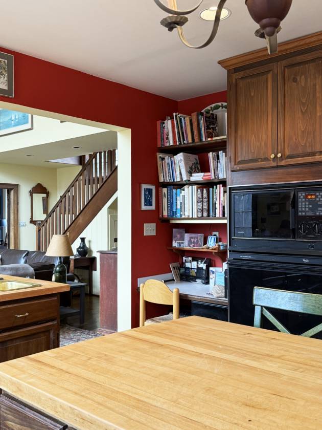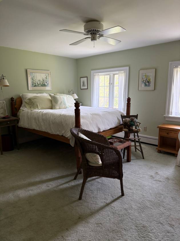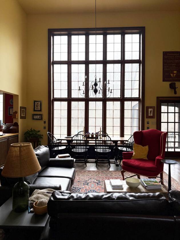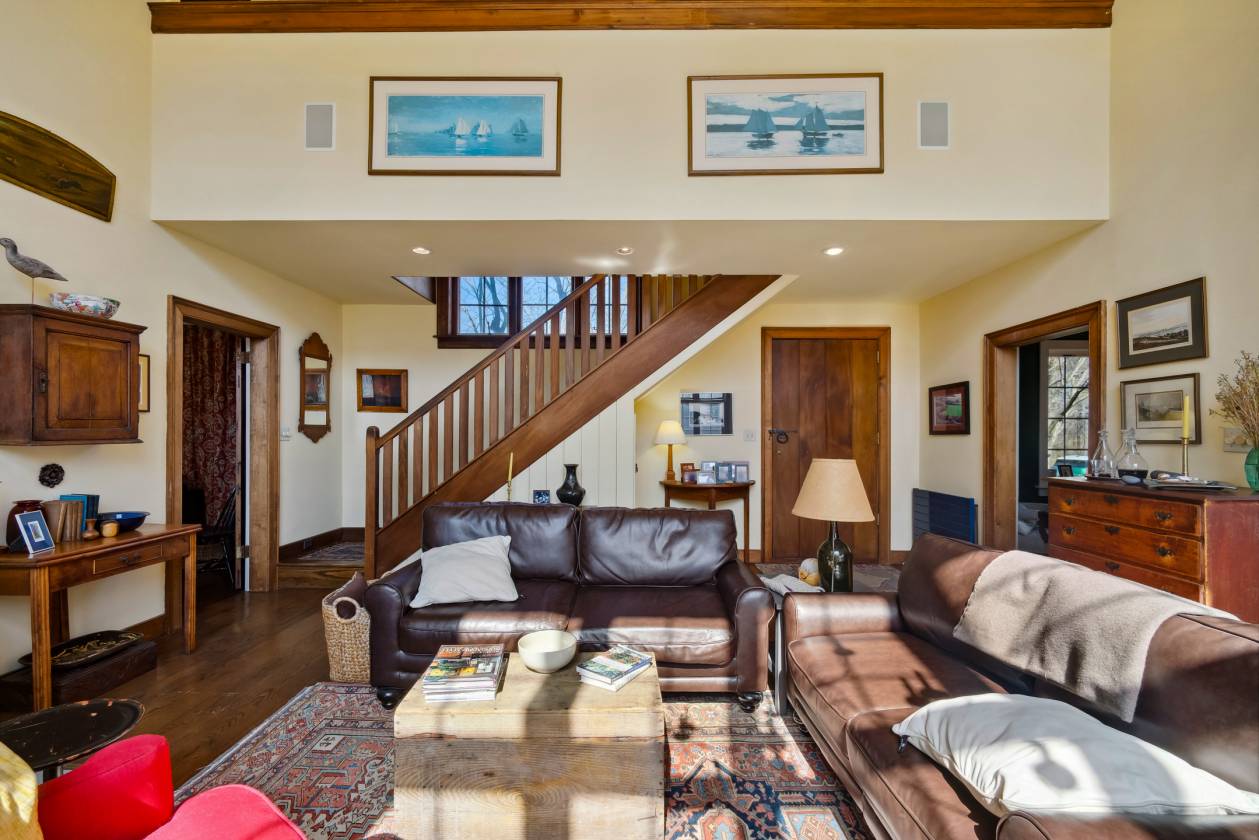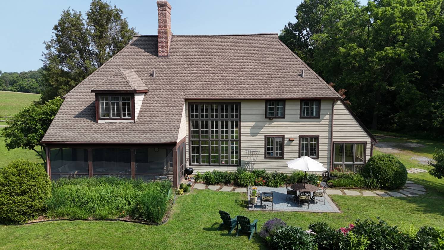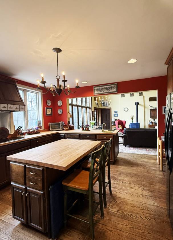 - The handsome two-story, many-paned window of the Great Room faces SSE. While looking out over a stone patio and well-established perennial beds, it provides a significant amount of passive solar gain keeping energy costs low – a compliment to the six-zone heating system. As a design and practical feature, a blue enameled Lange wood stove stands proudly in the Great Room. A more formal Living Room offers windows on the west gable that afford views of the surrounding fields, expansive grounds and woods. French doors on the south side lead to an ample screened flagstone-floored porch. Additionally, the first floor includes the large open Chef’s Kitchen, Den/Office, Mudroom, and half-bath.