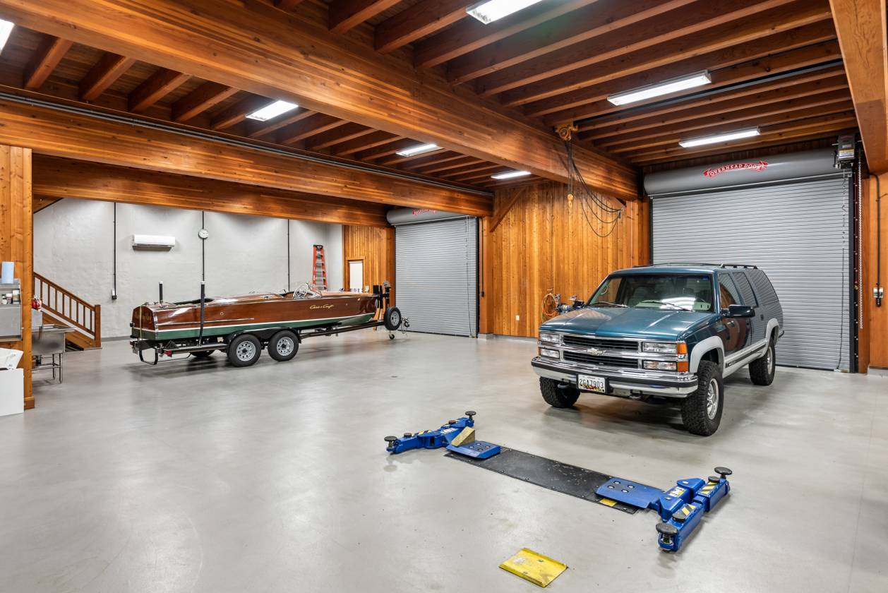 - Detached three-car garage with covered porch and workroom