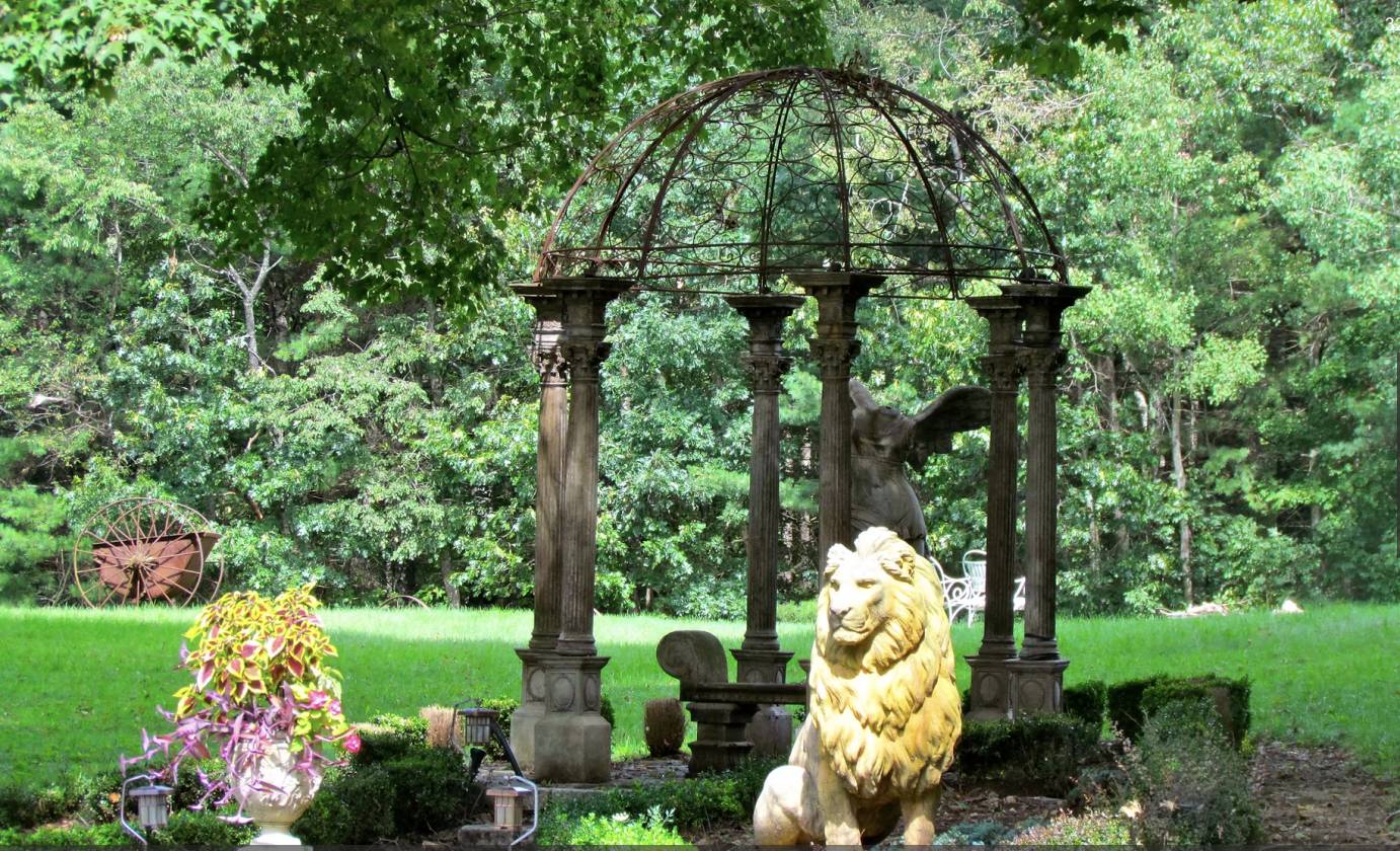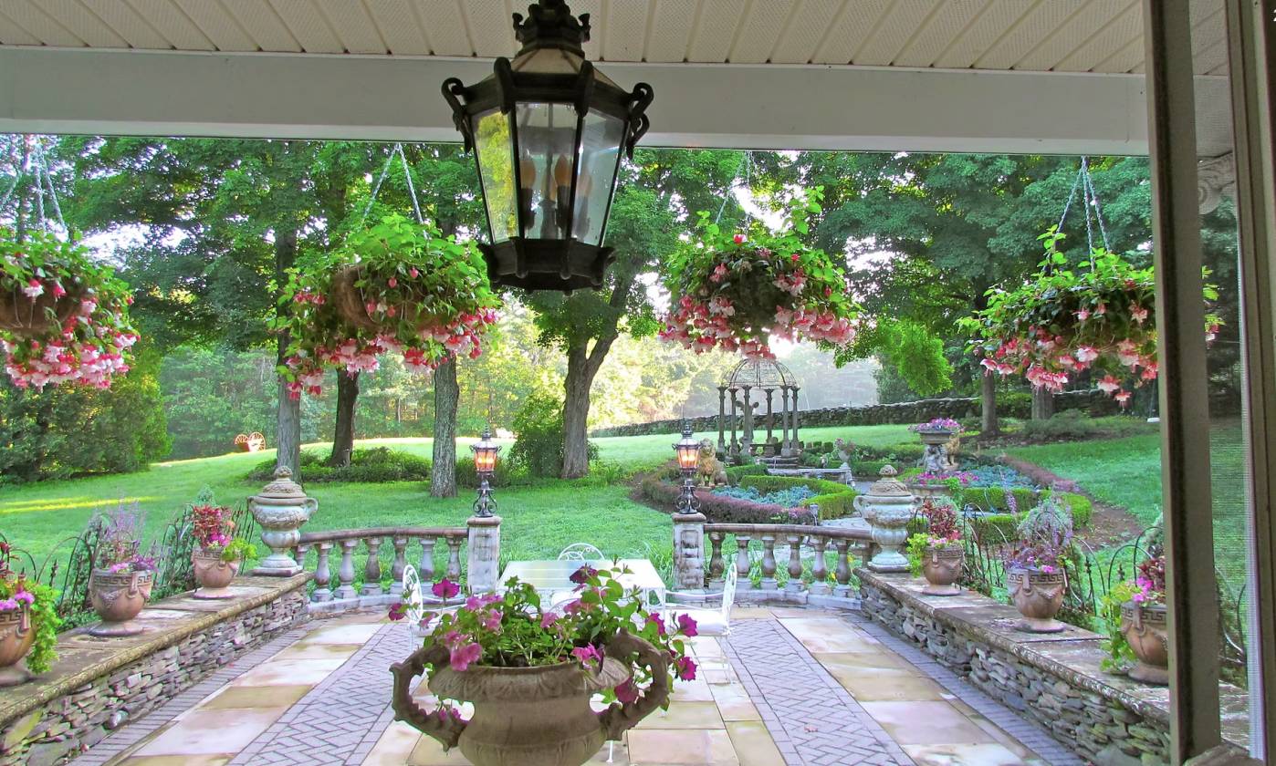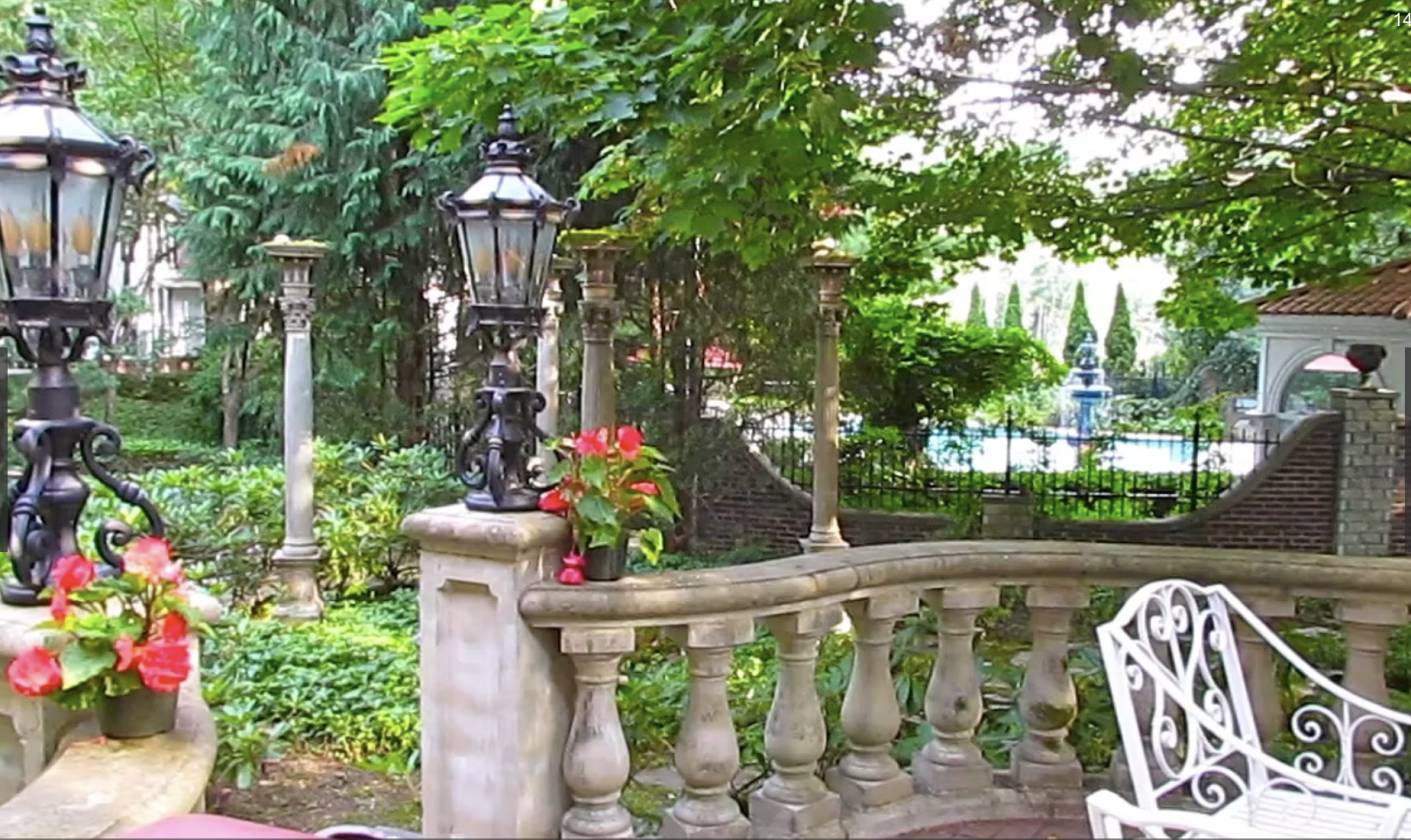 - Patio off of Dining room (accessed by 8’h X 16’w French doors)— balustrade and stone wall surround, patterned Tennessee stone and brick paver surface