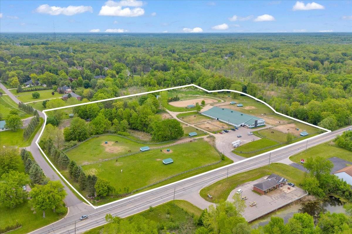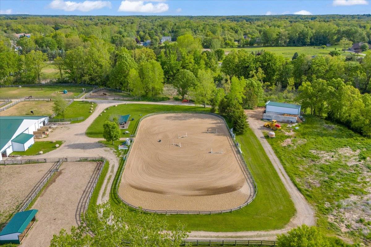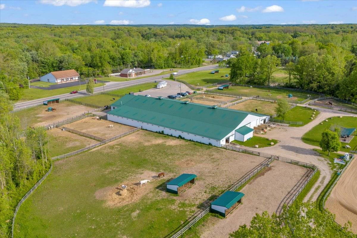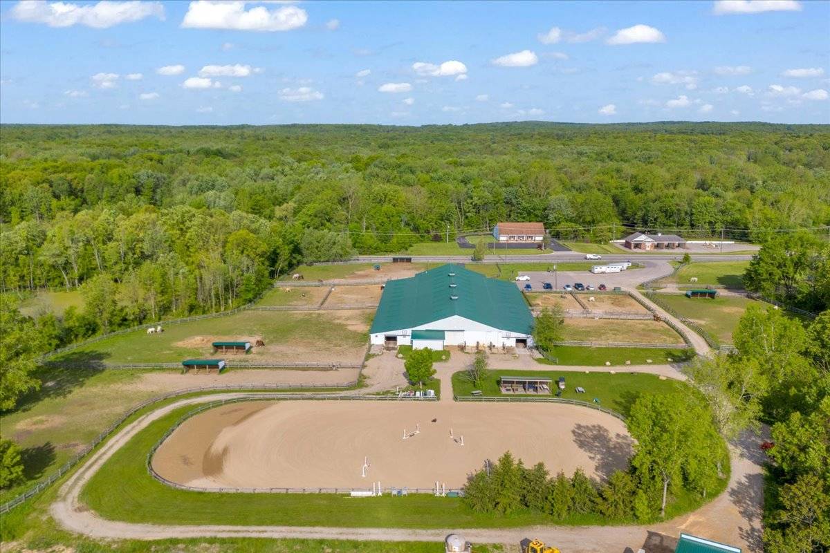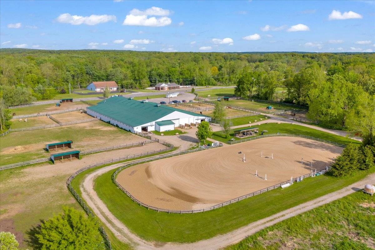 Set on over 24 beautifully maintained acres, this premier boarding facility—formerly a renowned hunter/jumper barn—has been completely renovated to meet the needs of modern equestrians. The mixed usage property combines both residential property and commercial zoning. Featuring expansive riding spaces, including a 110' x 240' outdoor arena and a spacious indoor arena. Recent upgrades include newly installed outdoor wash racks and perimeter fencing to elevate the functionality and safety of the grounds. There are 14 well-appointed paddocks, each equipped with water, electricity, run-in sheds, and hay huts. Additional amenities include a pole barn for hay storage and a large enclosed shed that accommodates over 100 yards of shavings. A designated concrete manure collection area ensures clean and efficient waste management, while a new drainage system has been installed throughout the property for optimal land care. Inside the barn, you'll find tack bays conveniently located in each aisle, multiple tack rooms, matted stalls with operable windows, and a spacious grain room. Recent additions include a brand-new observation room equipped with modern comforts such as heating, air conditioning, a washer/dryer, full kitchen, coffee bar, cozy lounge area, stone fireplace, and a flat-screen TV. The facility also offers a professional reception area and a generously sized back office. Throughout the barn and arena, paneled ceilings with new LED lighting create a bright and inviting atmosphere, complemented by a state-of-the-art sound system for seamless communication and entertainment. Current tenants run the business completely seperate from the real estate sale of the property and would love to continue successfully running the full barn. Any future buyer would act as the land lord and would only need to cover insurance and taxes if this so appeals to them.