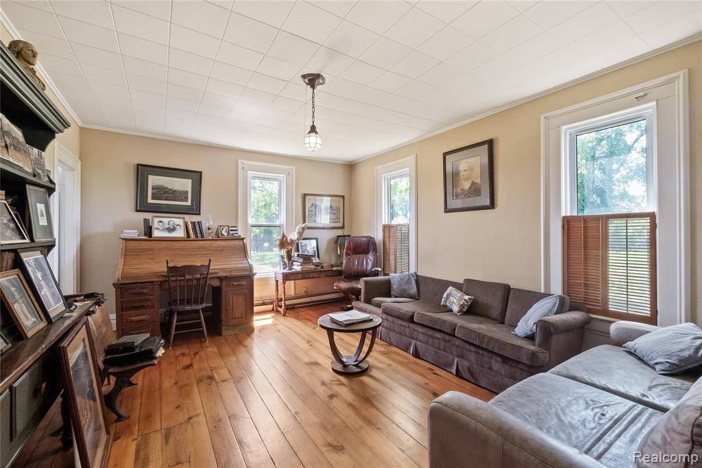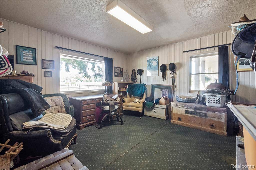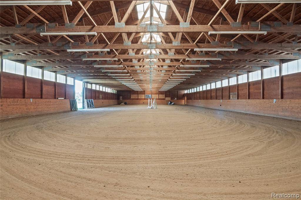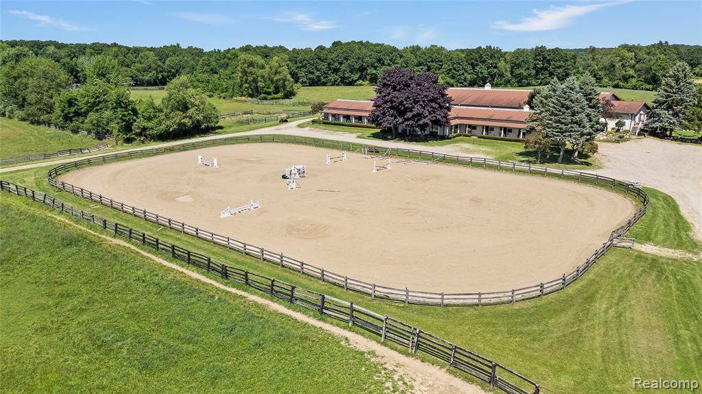 Seize the opportunity to acquire the well known 116 acre Interlaken Farm. Perfectly situated in the Metamora Hunt Country in Oxford, this grand equine facility is on one of the largest parcels of land currently available in Oakland County. Experience the diverse topography of this amazing piece of land with rolling meadows, 7 pastures, a small paddock, woods, trails and frontage on a small lake. Approximately 20 acres is currently in hay. Through the front entrance of the main barn is a large heated tackroom and office, both have dark stained tongue and groove paneling and picture windows overlooking the 150x240 outdoor arena and front pasture. A 1/2 bath and lounge complete this area. The 12 ft. main aisleway has 25 matted stalls (12X12), a double grooming area, wash rack with hot and cold water, a laundry room / workshop and feed room. The attached indoor arena is 70x180 and has an observation room that is currently being utilized as an apartment. Barn #2 (22x65) once a historic grainery was converted to a 5 stall barn with overhead hay storage and a 14x48 attached run-in shed. Barn #3 (40x85) is used for equipment storage has a workshop. Barn #4 (44x45), next to the 10x9 potting shed is used for storage. The 100+ year old farmhouse has 4 bedrooms and 2 full baths. A bright 4 season room overlooks the pasture and small apple orchard and leads to country kitchen and main floor laundry room. Some of the original hardwood floors remain. The farm has 2 wells, 2 septic's and is zoned agricultural. So much potential, bring your creativity, update this amazing property and make it your own. 24 hr. notice to show. All showings shall be accompanied by the listing agent.