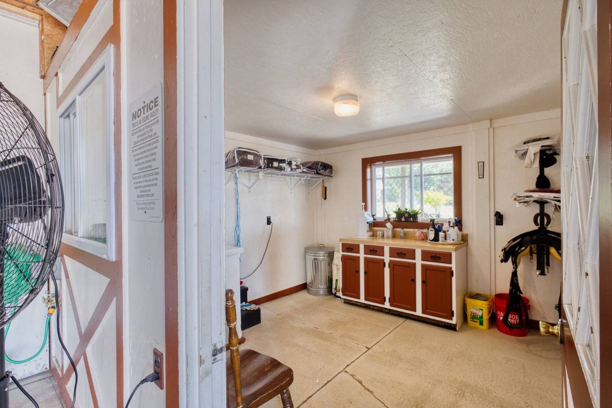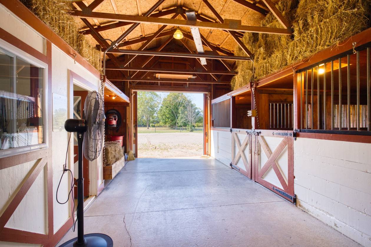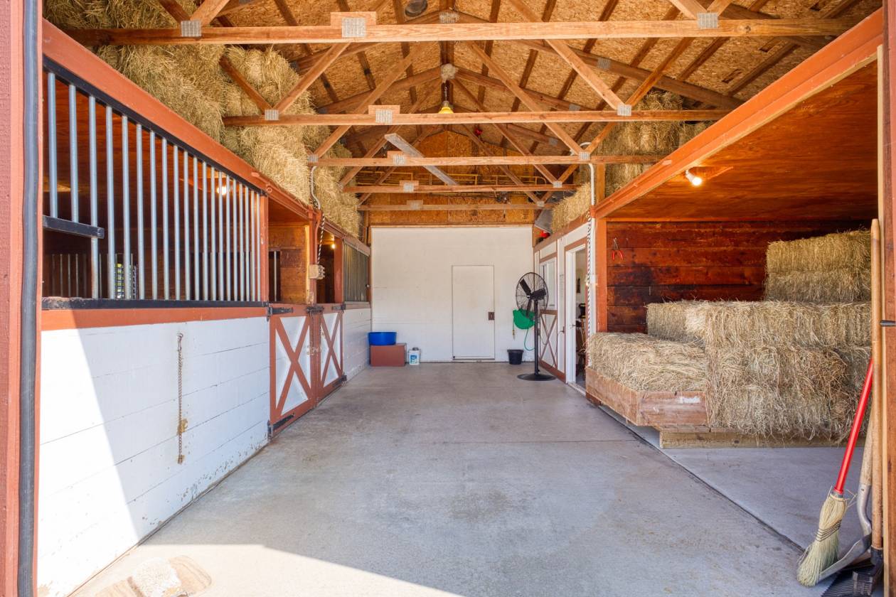 - Equestrian facilities are ready for immediate use, featuring a well-built barn with two 12’x12’ matted stalls, feed and overhead storage, hot and cold water, tack room, and wash rack. The setup allows for easy care and management, with thoughtful details throughout for efficiency and safety. Fenced pastures provide turnout space, and the layout allows for expansion if desired.