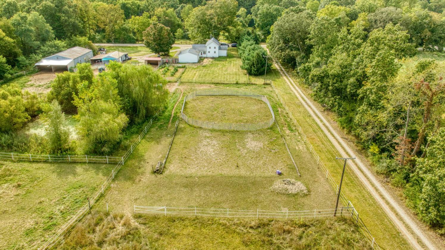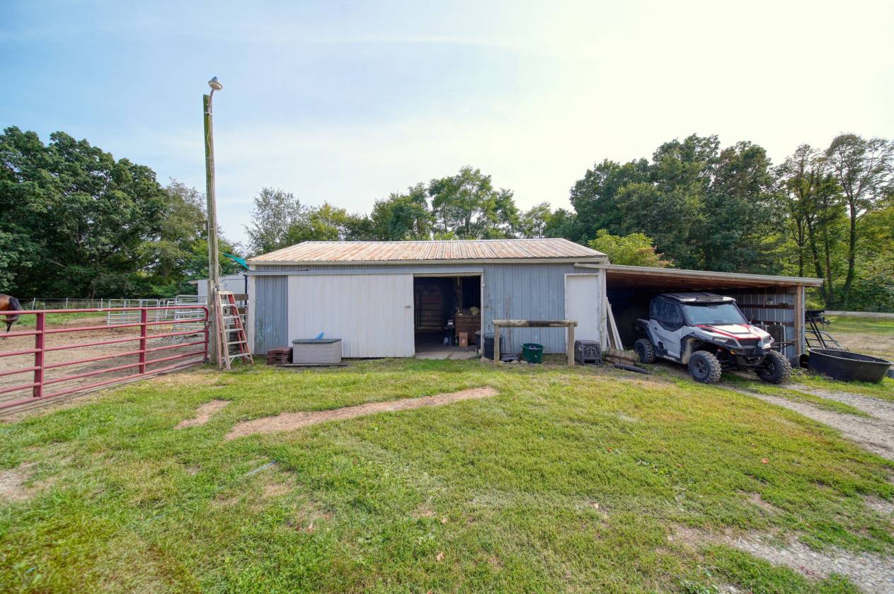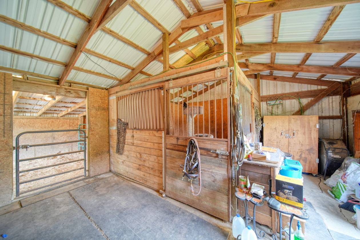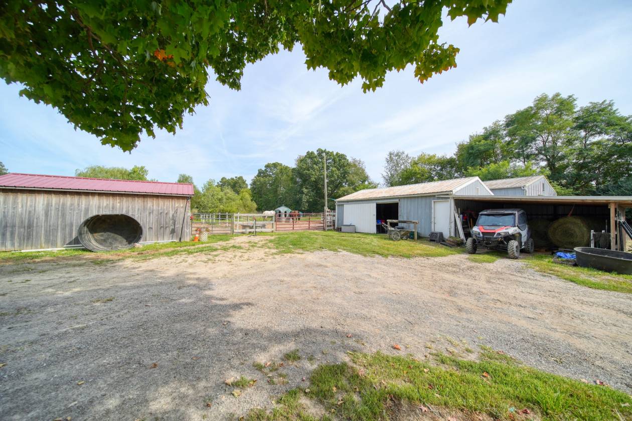 Horse lovers' dream! This 5.1-acre horse-ready farm is equipped with everything you need. The 2-stall horse barn includes one 12x12 stall, one 10x12 stall, a center aisle, feed area, large cedar tack storage, and an attached run-in. An additional lean-to provides hay storage. The property offers 3 grass pastures with poly hot tape and PVC post covers for added safety, plus 2 winter paddocks with compacted limestone for mud management—Paddock 1 features a 20x40 run-in with center divider, mats, kick boards, and fans on both sides; Paddock 2 includes a 12x20 run-in with mats, kick boards, and a fan. A 70x100 outdoor sand riding arena was professionally built and graded for proper drainage. All located in a popular horse community.