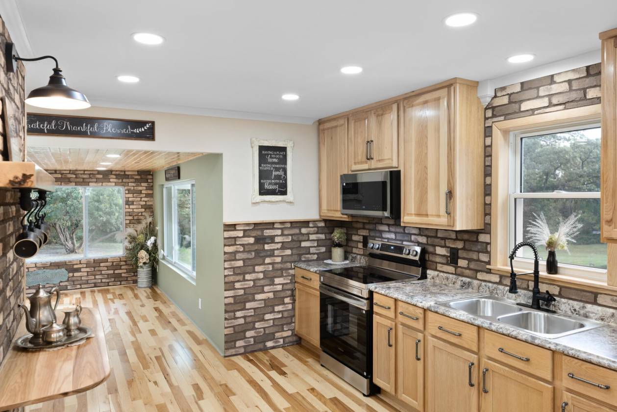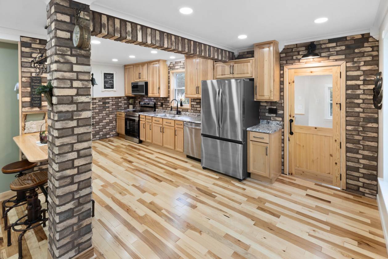 - Beautifully remodeled 1900’s farmhouse situated on 12 private acres. This one-of-a-kind home combines timeless craftsmanship with modern convenience. Thoughtful details include custom knotty pine doors with galvanized hardware, hickory floors, and grouted Koni tile accents that add both warmth and character. An open-concept kitchen flows seamlessly into the living area, complete with a cozy fireplace surrounded by natural finishes—perfect for gatherings.