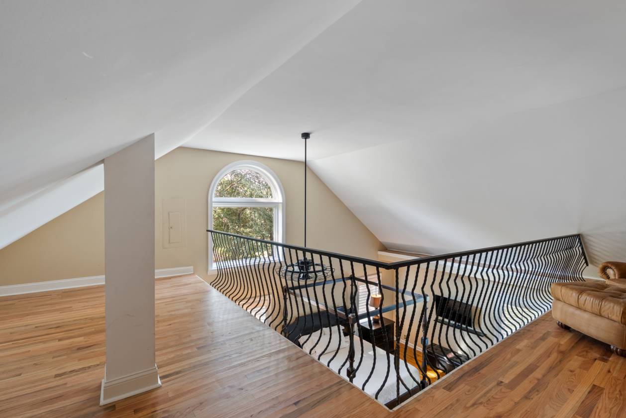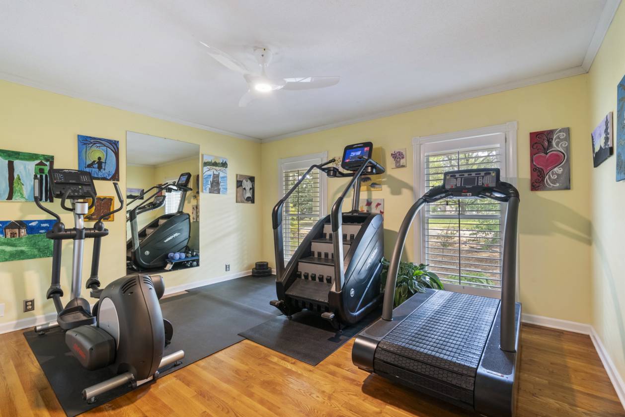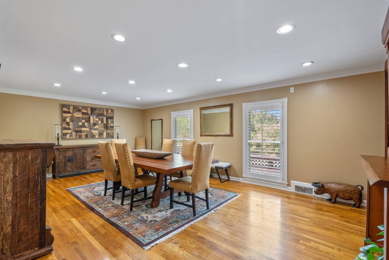 - Built in the 1960s, the home retains its original hardwood floors and features a central staircase illuminated by a modern chandelier. The kitchen is equipped with dark granite countertops, custom cabinetry, an electric cooktop, double ovens, and generous prep space. A formal dining room offers a refined setting, while a den with fireplace creates a casual retreat. An expansive living area, currently used as a dining room, includes built-in shelving. The main-level primary suite features a vaulted sitting area, walk-in closet, and full bath, while a remodeled marble-tiled bathroom connects to a versatile space suitable as a bedroom, office, or gym. Upstairs, two large bedrooms are joined by a redesigned Jack-and-Jill bath, with new hardwood flooring throughout. Renovations and upgrades over the years include fresh paint, built-in cabinets, replaced windows, plantation shutters, septic treatment system, Generac generator, water heater, and two fully renovated bathrooms.