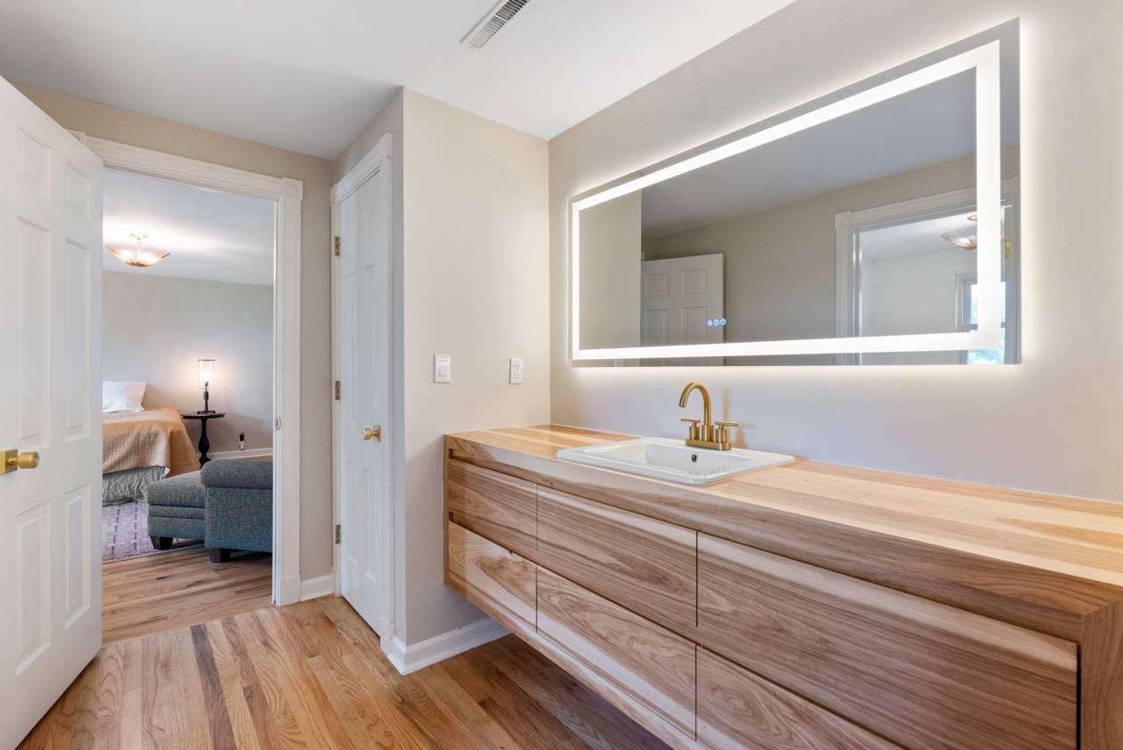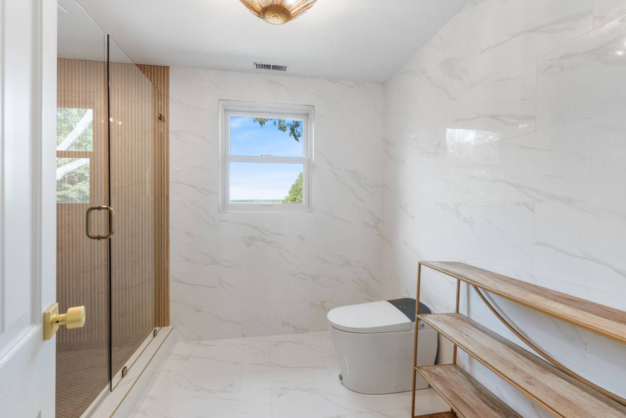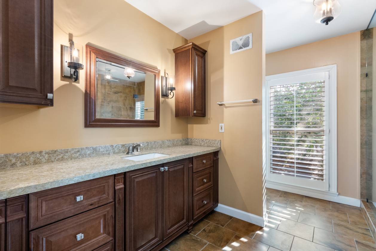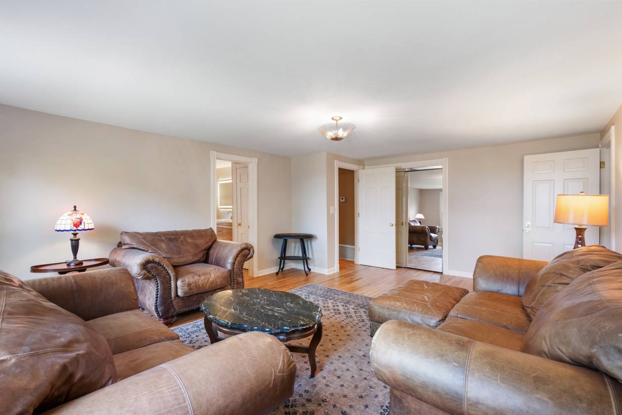 - Built in the 1960s, the home retains its original hardwood floors and features a central staircase illuminated by a modern chandelier. The kitchen is equipped with dark granite countertops, custom cabinetry, an electric cooktop, double ovens, and generous prep space. A formal dining room offers a refined setting, while a den with fireplace creates a casual retreat. An expansive living area, currently used as a dining room, includes built-in shelving. The main-level primary suite features a vaulted sitting area, walk-in closet, and full bath, while a remodeled marble-tiled bathroom connects to a versatile space suitable as a bedroom, office, or gym. Upstairs, two large bedrooms are joined by a redesigned Jack-and-Jill bath, with new hardwood flooring throughout. Renovations and upgrades over the years include fresh paint, built-in cabinets, replaced windows, plantation shutters, septic treatment system, Generac generator, water heater, and two fully renovated bathrooms.