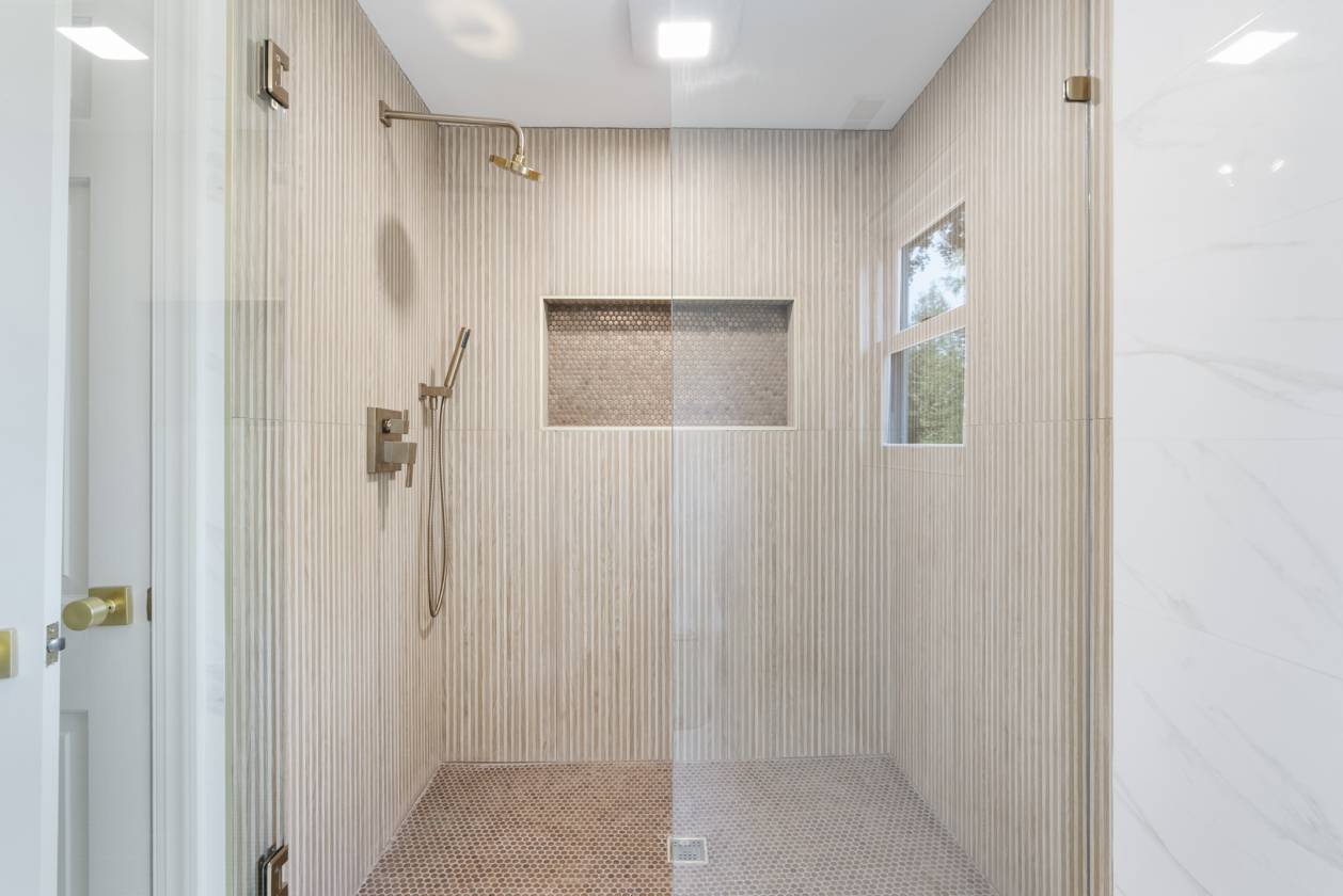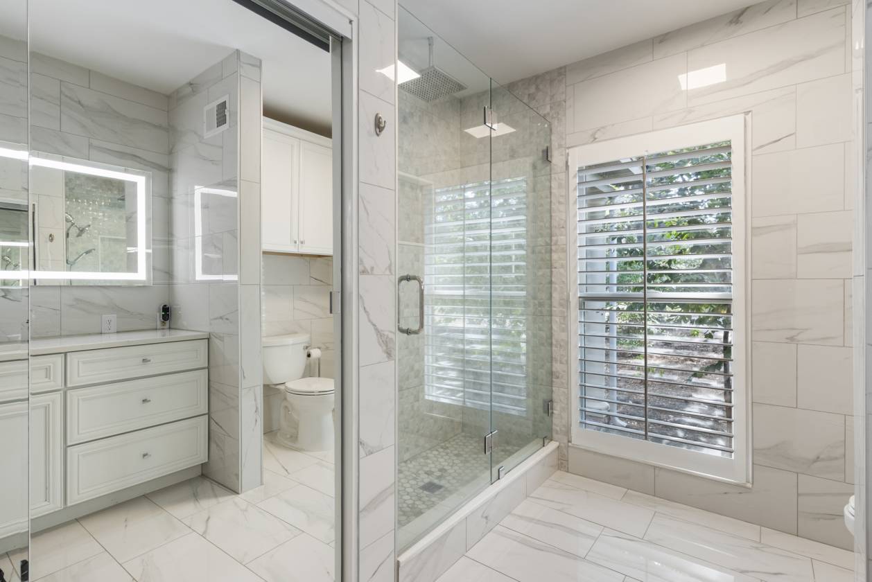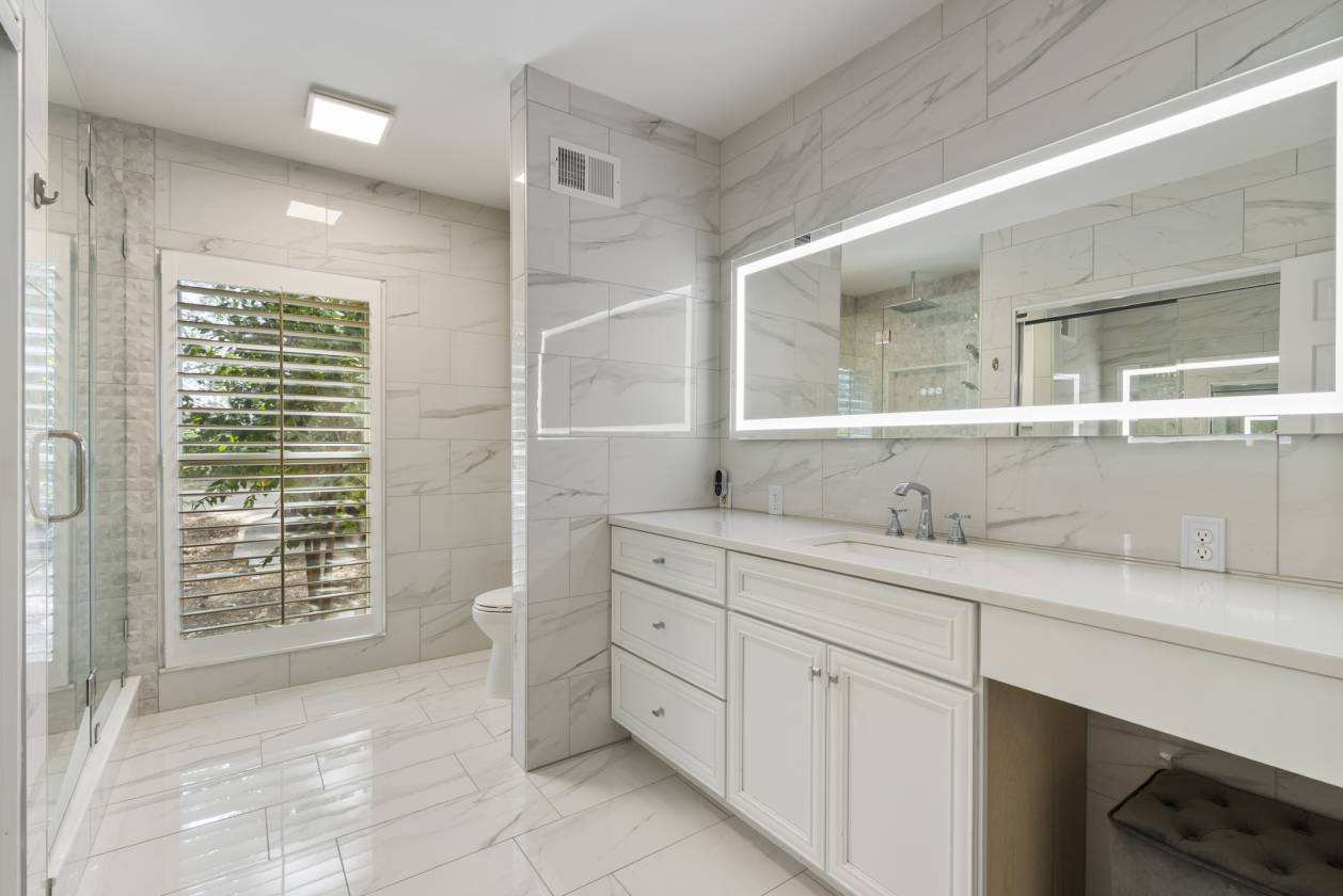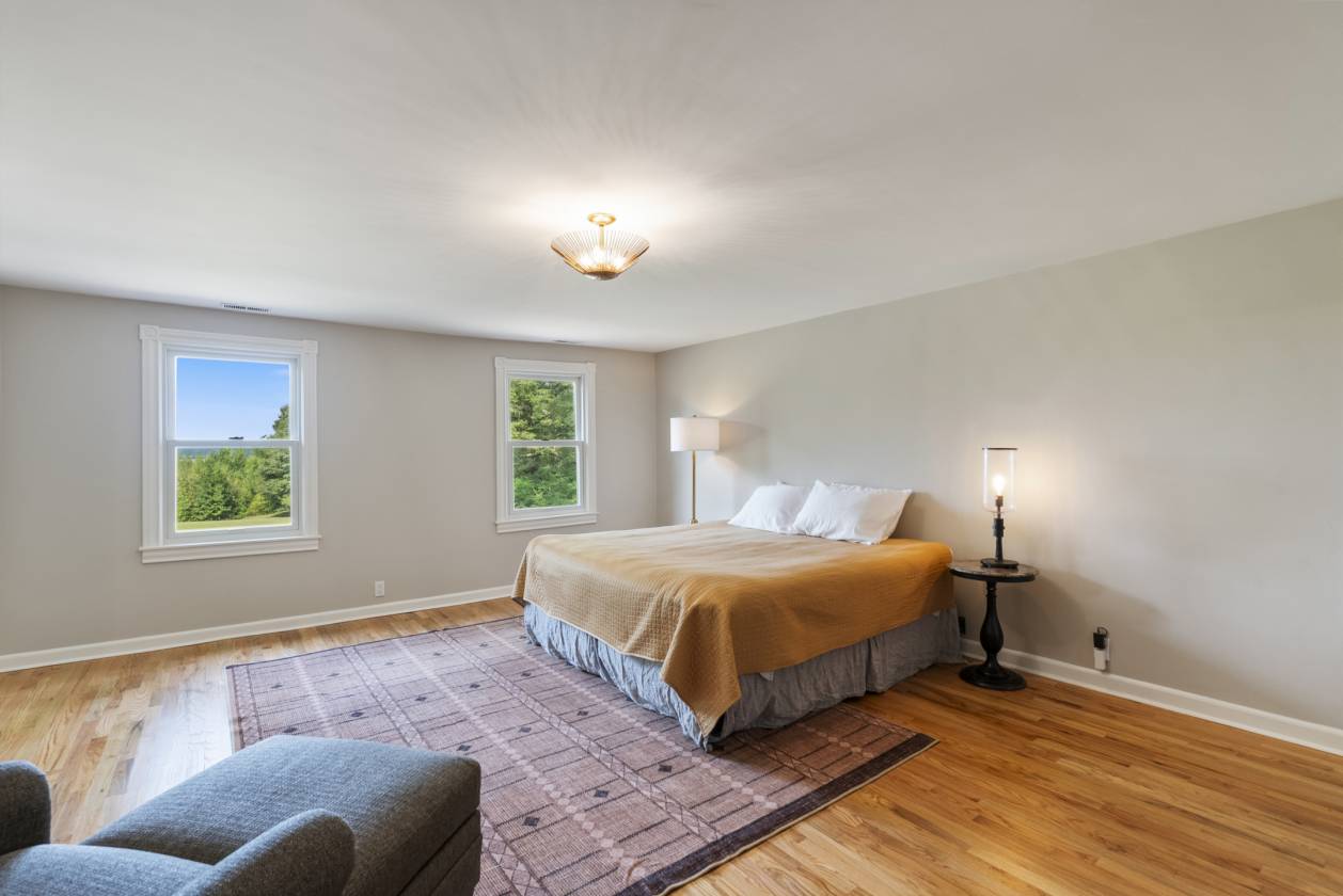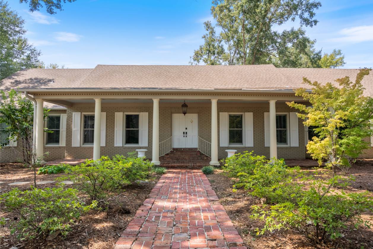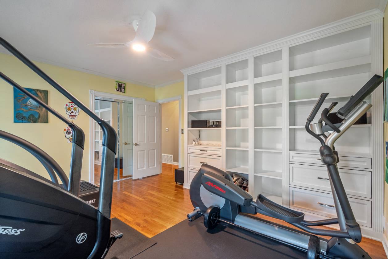 - Built in the 1960s, the home retains its original hardwood floors and features a central staircase illuminated by a modern chandelier. The kitchen is equipped with dark granite countertops, custom cabinetry, an electric cooktop, double ovens, and generous prep space. A formal dining room offers a refined setting, while a den with fireplace creates a casual retreat. An expansive living area, currently used as a dining room, includes built-in shelving. The main-level primary suite features a vaulted sitting area, walk-in closet, and full bath, while a remodeled marble-tiled bathroom connects to a versatile space suitable as a bedroom, office, or gym. Upstairs, two large bedrooms are joined by a redesigned Jack-and-Jill bath, with new hardwood flooring throughout. Renovations and upgrades over the years include fresh paint, built-in cabinets, replaced windows, plantation shutters, septic treatment system, Generac generator, water heater, and two fully renovated bathrooms.