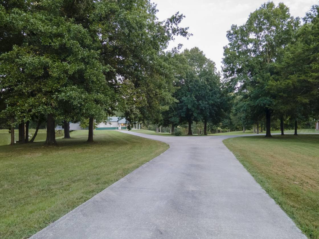 • Gravel entrance gives way to concrete drive leading to both residences