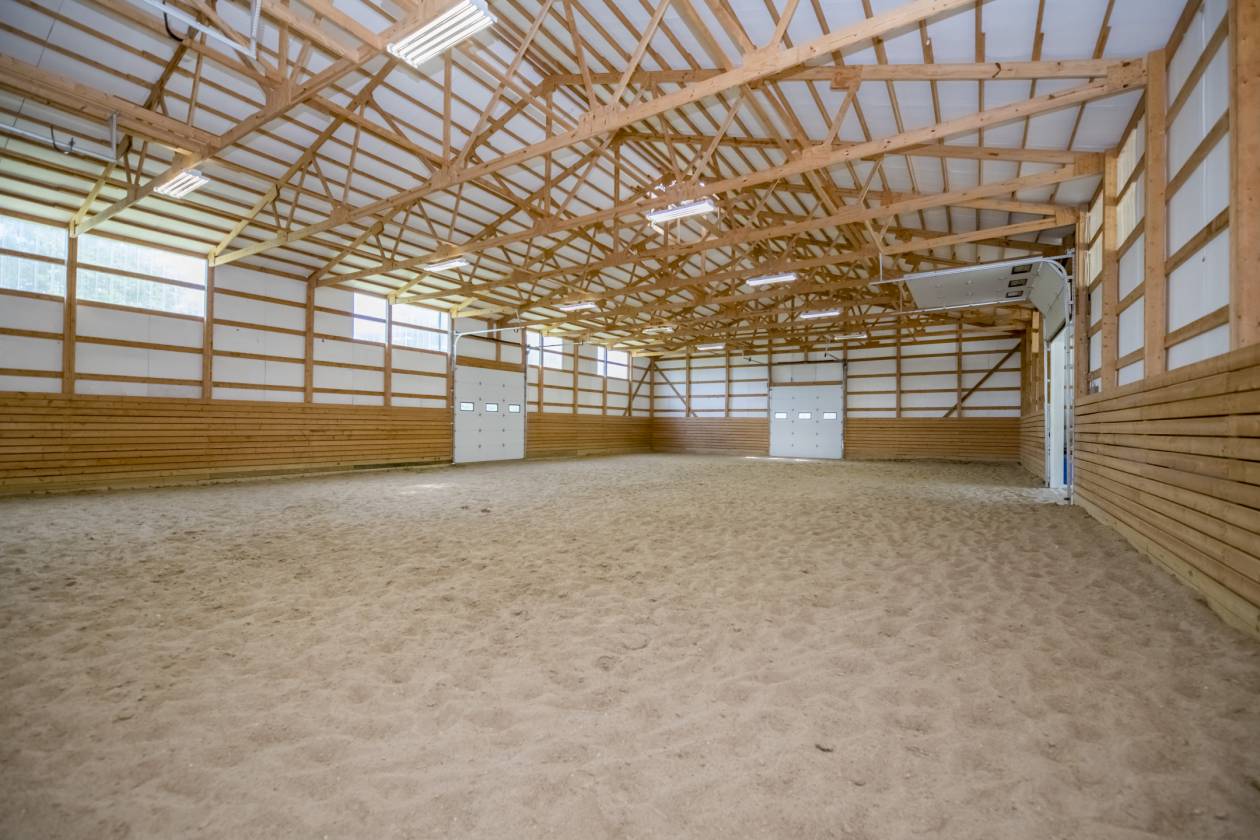 • Slatted wood “kick wall” surrounds the entire perimeter for safety of horse and rider