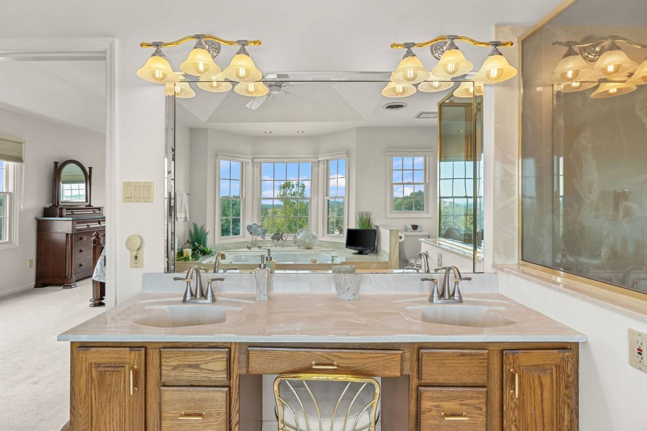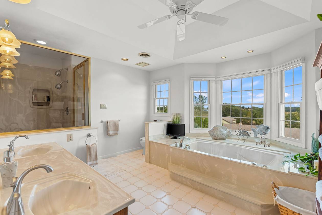 • Upstairs, the expansive primary suite features a fireplace, huge walk-in closet, and spa-like ensuite with jacuzzi tub, double vanity, and walk-in shower. Four additional bedrooms down the hall, all with ample space and large windows that allow for natural lighting.