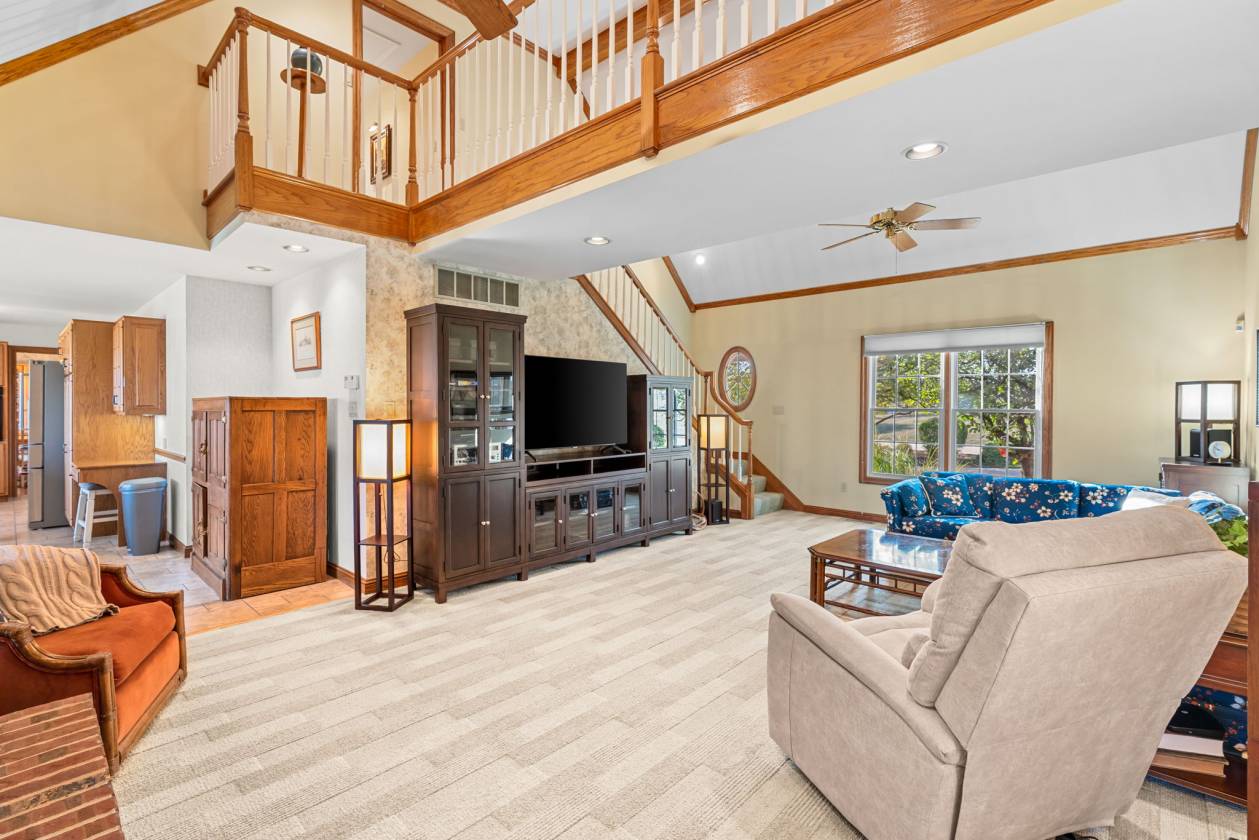 • The stunning residence offers 5 spacious bedrooms and 5 full bathrooms, spread out over 4,800+ square feet of living space—ideal for a growing family or multi-generational living. The gourmet kitchen features custom cabinetry, granite countertops, and stainless steel appliances, opening to a dedicated dining area. The vaulted-ceiling living room centers around a gorgeous brick fireplace, perfect for cozy evenings.