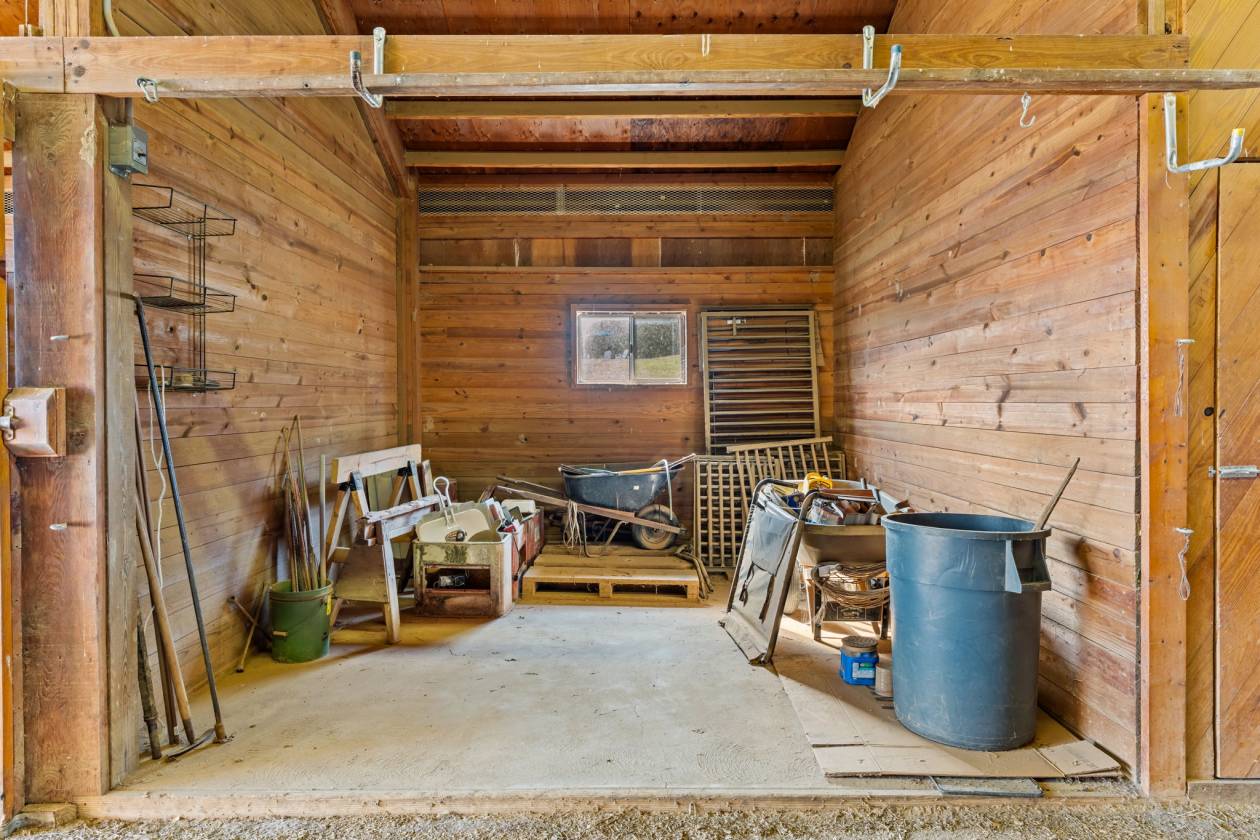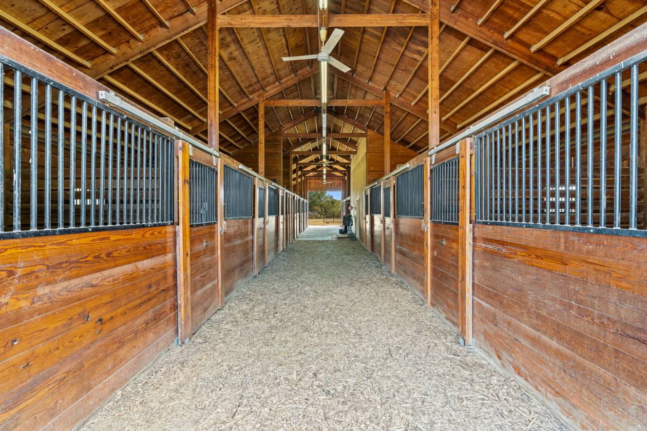 • The centerpiece for equine enthusiasts is the 10-12 stall Morton horse barn, thoughtfully equipped with a tack room featuring a kitchenette and bathroom, wash rack, heated water system, and frost-free faucets. Each stall is crafted with 4-inch thick exterior walls up to the windows for added durability. The fenced turnout pastures include automatic waterers and shelters, ready for your horses from day one. A second 32x72 outbuilding provides ample space for equipment and hay storage.