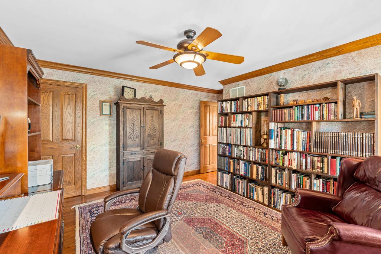 • The main level also has a private, executive office space with built in bookshelves. Step outside onto the screened-in deck just off the kitchen—your new favorite place to relax while taking in panoramic views of the surrounding land and pastures. Main floor laundry with additional storage and direct access to the 3-car garage.