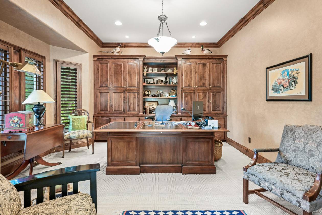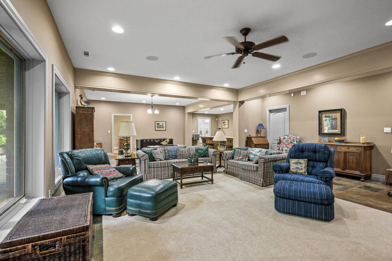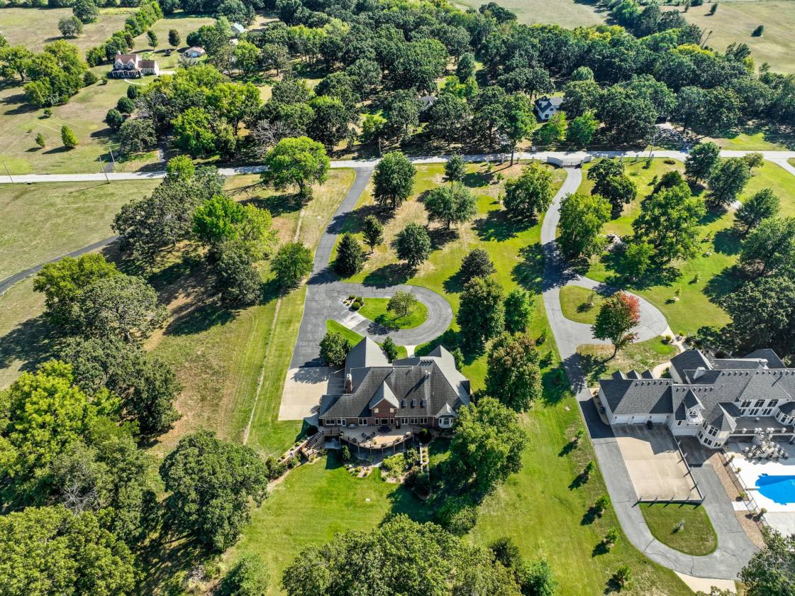 Timeless French-Inspired Estate on 6.5 Pristine Acres Welcome to an extraordinary custom-built residence where stately elegance meets warm, inviting, comfort—a rare combination that makes this Carthage home the perfect backdrop for both intimate family gatherings and grand-scale entertaining. With a grand first impression, this all-brick, two-story home offers a sweeping circle driveway which frames the property's distinguished façade along with a sculpted bay window crowned with a flared copper roof and a beautifully arched front door, all hinting at the refined craftsmanship within. Formal Spaces with Heart- Step into the cathedral foyer, where a motorized chandelier sets an impressive tone. The formal dining room and private study flank the entry, offering spaces for special occasions and quiet work alike. The study's pocket doors and custom built-ins create the ultimate home office sanctuary, while gleaming maple and stone floors flow into the dining room, connecting these gracious formal areas. The living room captivates with soaring cathedral ceilings, dramatic arched windows, and skylights that bathe the space in natural light. A fireplace anchored by tasteful built-ins provides both beauty and function—this is a room that feels as comfortable hosting holiday celebrations as it does quiet Sunday afternoons with family. The Heart of the Home -The kitchen and great room form an open, inviting hub where life naturally gathers. Granite countertops offer abundant prep space and casual seating at the breakfast bar, while top-tier appliances—make meal preparation a joy. Custom Alderwood cabinets provide stunning beauty paired with exceptional functionality. The adjoining hearth room draws everyone together around the gas fireplace, with peaceful views of the wooded grounds. A convenient butler's pantry and utility room with utility sink, second refrigerator, and washer/dryer keep entertaining effortless. Indoor-Outdoor Living at Its Finest -The three-season porch is pure serenity—windows on three sides flood the space with light, while a brick fireplace creates ambiance year-round. Step out to the generous lit deck with metal railings and dual staircases, extending your entertaining space into the natural beauty beyond. The main-level primary bedroom is a true retreat, featuring crown molding, tray ceilings, plantation shutters, and two spacious walk-in closets. The ensuite bath is resort-worthy: separate vanities, walk-in steam shower, air-jet tub, vanity seating with built-ins, linen storage, and even a built-in dresser and ironing board. Ornate metalwork guides you up the staircase to a dramatic skywalk overlooking the foyer and living room. Four generous bedrooms await—two with private ensuite baths featuring walk-in showers, and two sharing a well-appointed Jack-and-Jill bath with dual vanities, tub shower, and abundant storage. The walkout lower level living space offers large windows and French doors that open to a covered patio, seamlessly extending your entertaining outdoors. Custom built-ins surround an exposed brick fireplace and a wet bar offers seating and storage to make hosting effortless. A sixth bedroom with ensuite bath provides flexibility for guests or multigenerational living. The unfinished portion offers tremendous potential, with mechanical systems (water softener, Trane HVAC units, three hot water heaters, CAT 5 termination), storage areas, and framing/electrical already in place for future expansion. Beyond the manicured lawns lies wooded acres with trails leading to a seasonal creek bed. Wildlife abounds, creating a peaceful, private setting that feels worlds away yet located just outside Carthage. This Nantucket Trace-inspired estate balances formality with livability, creating a home where memories are made and traditions are born. From quiet mornings in the sun-drenched living room to joyful gatherings that spill from kitchen to deck to patio, every moment here feels special.