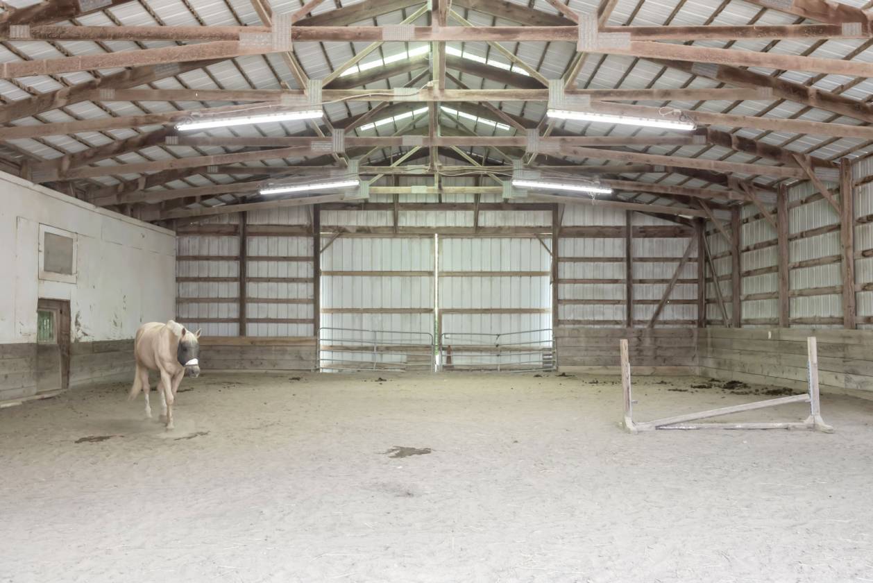 - o Indoor arena is attached to barn and has viewing room