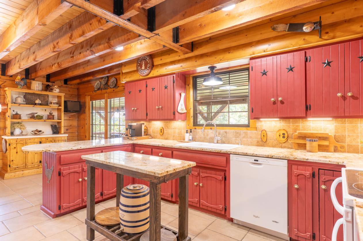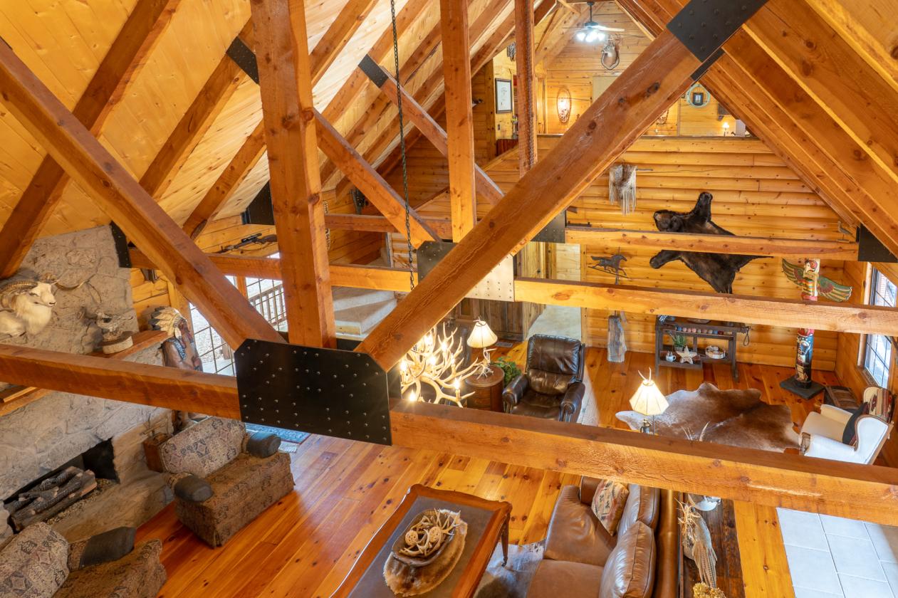 - Big Cedar Lodge Style vibe w/ 20ft Sky High Beamed/Tongue Groove Ceiling & Exceptional Craftsmanship w/ Solid Wood Crossbark Doors
