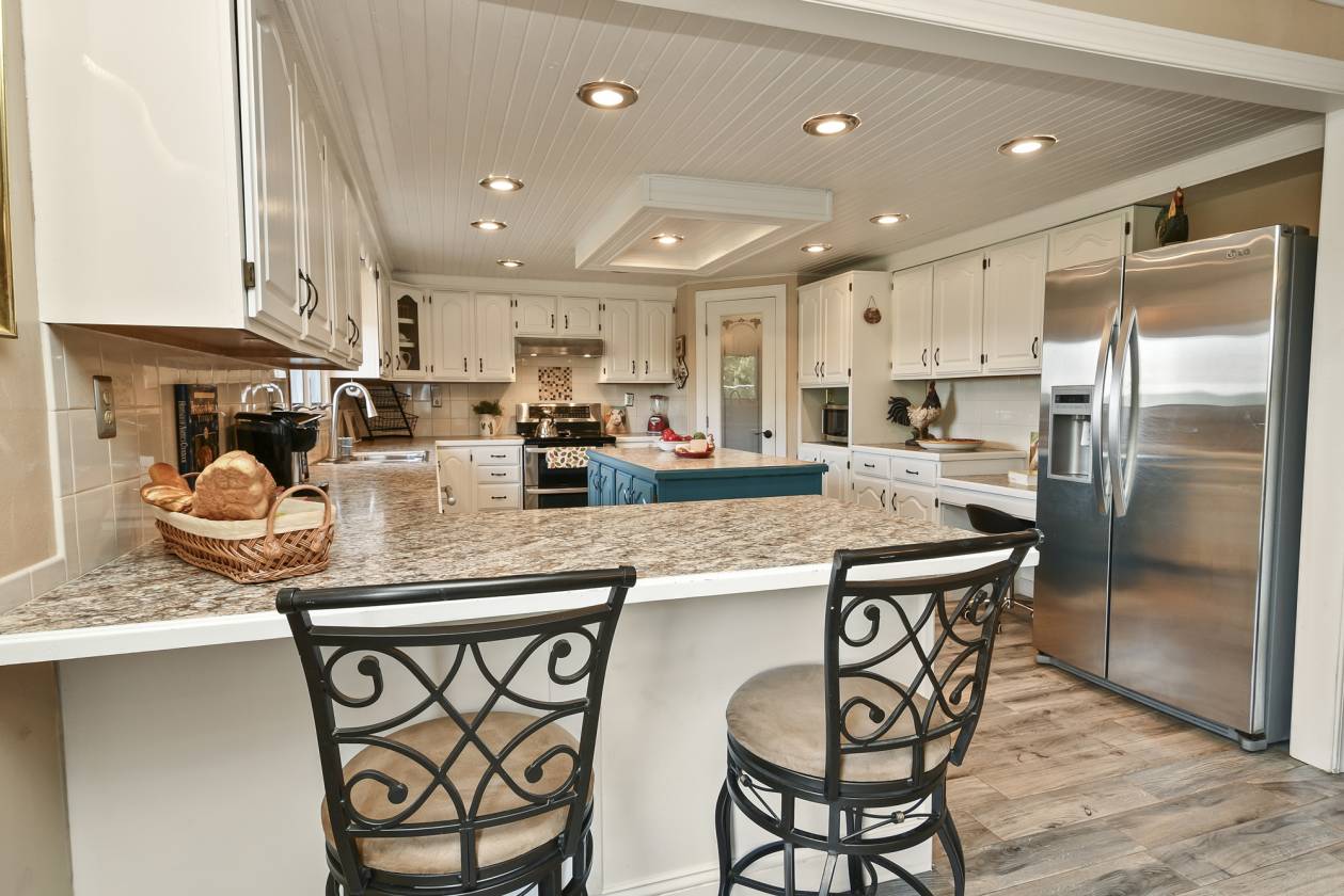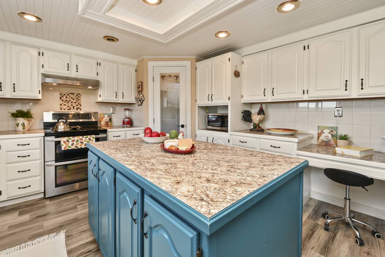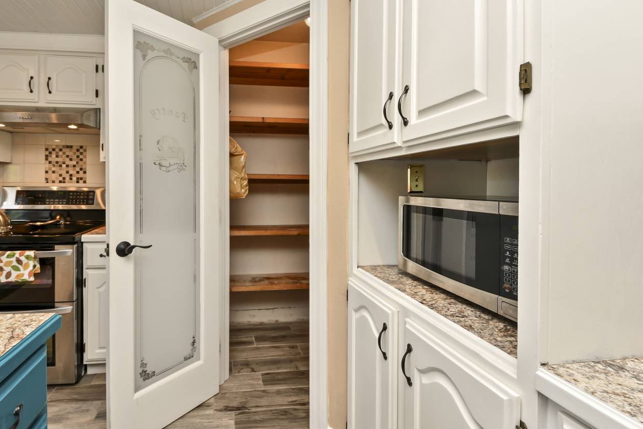 - Updated kitchen with white cabinetry, center island, pantry, and stainless steel appliances (fridge included)