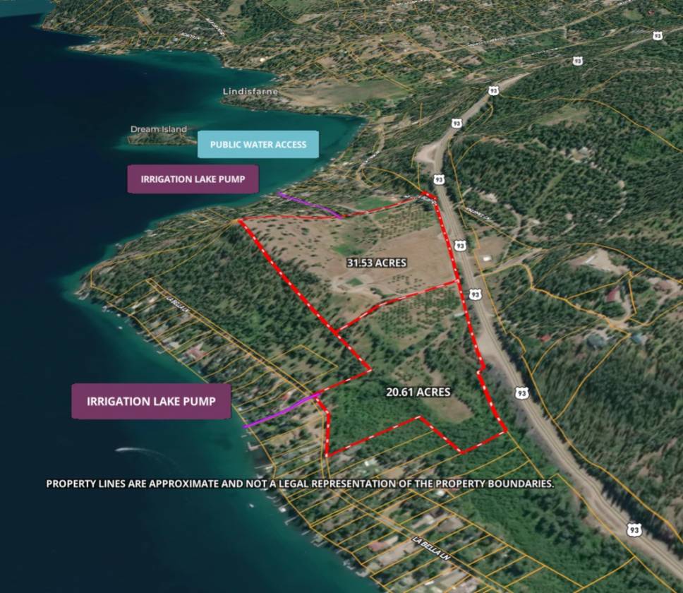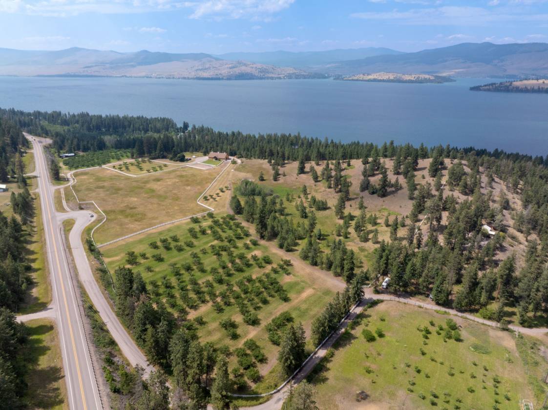 • This is a rare gem offering endless possibilities for those seeking a luxurious rural lifestyle with the opportunity to raise your own fruit and livestock, ride the trails in equine splendor and stroll into private sanctuaries. Divided into two parcels, there are no covenants or zoning on the majority of the property (a piece on the northern edge is in the Melita Island zoning district), and the land provides flexibility, whether you envision a private estate, equestrian facility, or agricultural venture, or a combination of all of these. The elevated knoll in the northeast corner offers a premier building site with jaw-dropping 360-degree views of Flathead Lake and the surrounding Mission and Swan Mountain ranges, creating a stunning backdrop for your custom home. The established orchard is a highlight, featuring 350+cherry trees (Lambert & Van varieties), 2 dozen apple trees (Red Delicious, Macintosh, and Wealthy), and an apricot tree, all supported by irrigation from two lake pumps with water right Statements of Claim dating back to 1954 (100 GPM) and 1971 (85 GPM).
