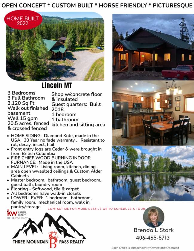 Escape to the Mossy Antler Ranch, a custom-built, horse-friendly haven nestled on 20.5 picturesque acres! This stunning property boasts a 3-bedroom, 3-full-bath home meticulously designed with quality and comfort in mind. But the true magic lies in its unparalleled location, bordering 7,000+ acres of Block Management land and just 10 miles from the breathtaking Scape Goat Wilderness. Imagine owning the most idyllic horse property imaginable, complete with crossed fenced pastures, corrals, and a convenient hitching rail. Willow Creek gracefully meanders through the landscape, enhancing the natural beauty alongside tranquil trout ponds. Heated shop, Two Post Frame buildings, 24' x 49' & 24' x 36', suitable for storage, equipment housing or open-air animal shelters. 3,440 sq ft home, you'll find premium features like durable Diamond Kote siding, a FIRE CHIEF wood-burning whole-home heating solution, a propane furnace, and elegant quartz countertops. Relax and soak in the stunning views from the beautiful covered front deck or the charming back balcony overlooking the pasture, mountains and abundant wildlife. As an added bonus, a separate 600 sq ft guest house offers comfortable accommodations for visitors. Meticulously designed by a national award-winning landscape architect, Mossy Antler Ranch is more than just a property; it's a lifestyle.