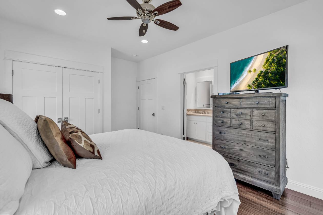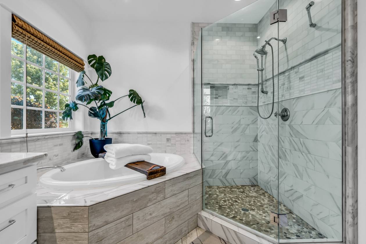 - The luxurious primary suite offers a spa inspired bath with dual marble vanities, a walk in shower, and a jetted soaking tub. A second primary suite provides its own walk in shower, dual vanities, and granite countertops making it ideal for multigenerational living or private guest quarters.