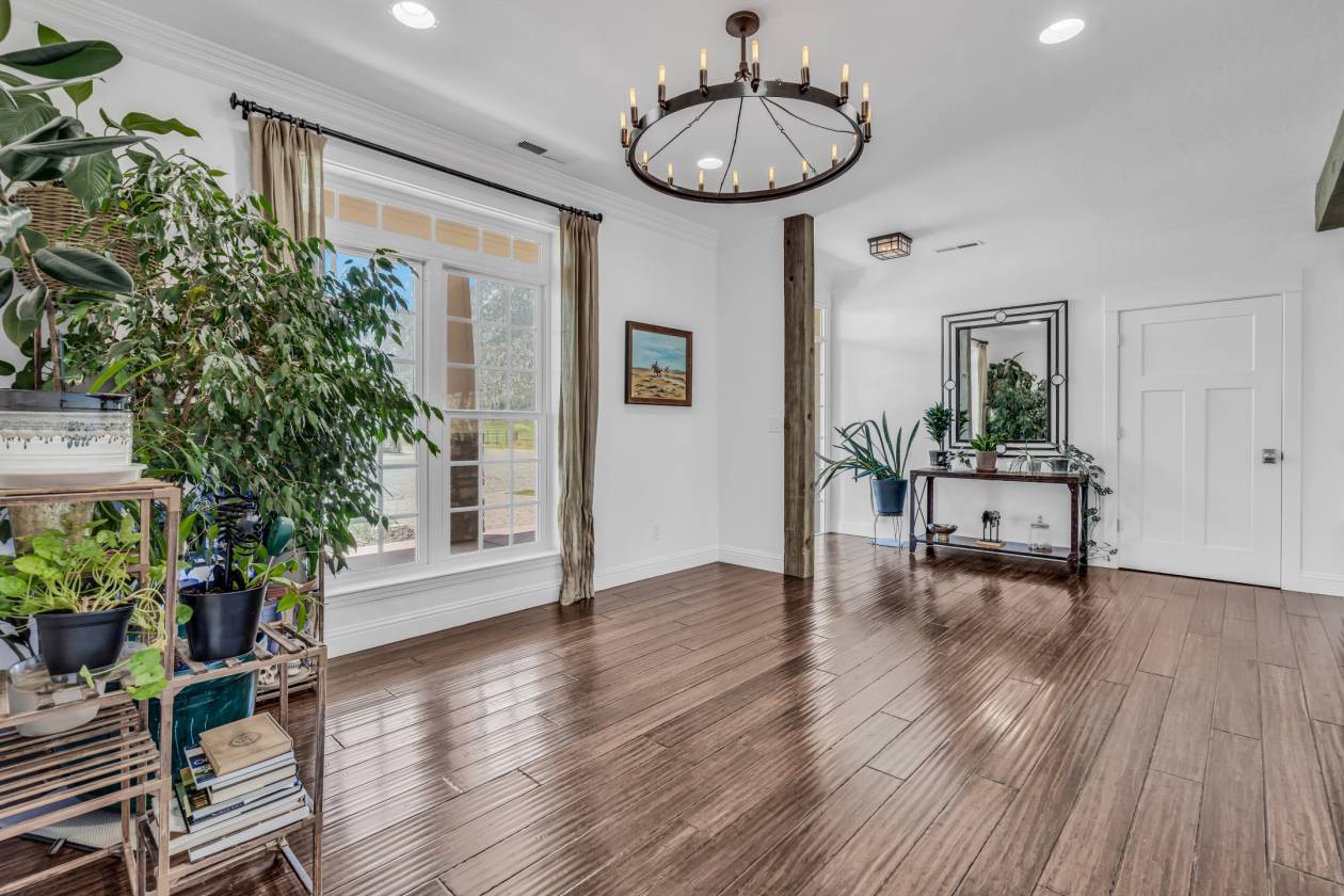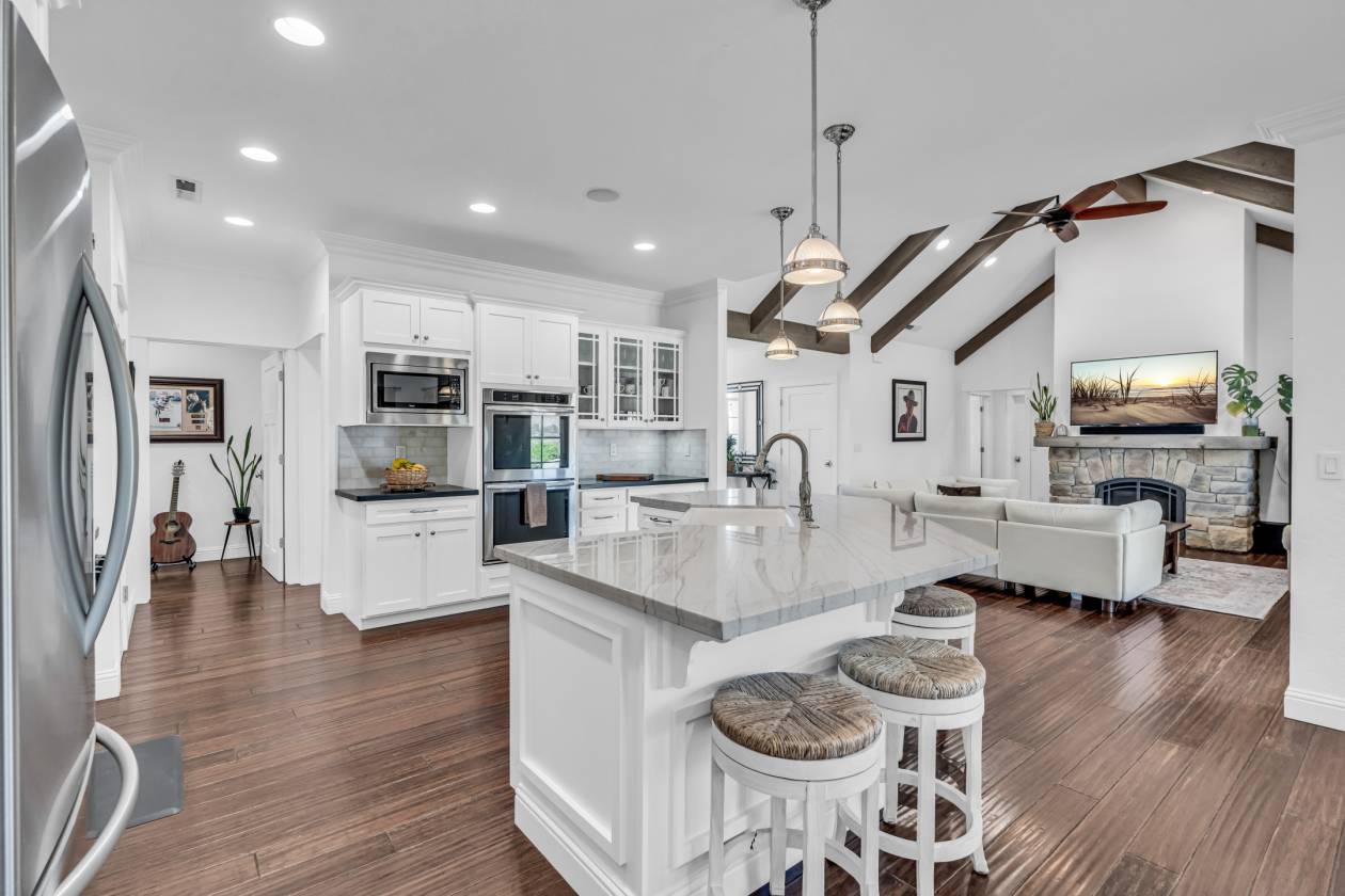 - Experience elevated mountain living in this stunning 4 bedroom 3.5 bathroom home with sweeping views of the Sierra Nevada Mountains from nearly every room. Step inside to discover rich bamboo flooring and a vaulted great room that floods with natural light. The great room and kitchen both feature built in speakers for an enhanced living and entertaining experience. The chef’s kitchen is a showstopper, featuring a marble island, sleek black leathered granite countertops, and a spacious breakfast nook. A separate formal dining room provides an elegant space for gatherings away from the kitchen.
