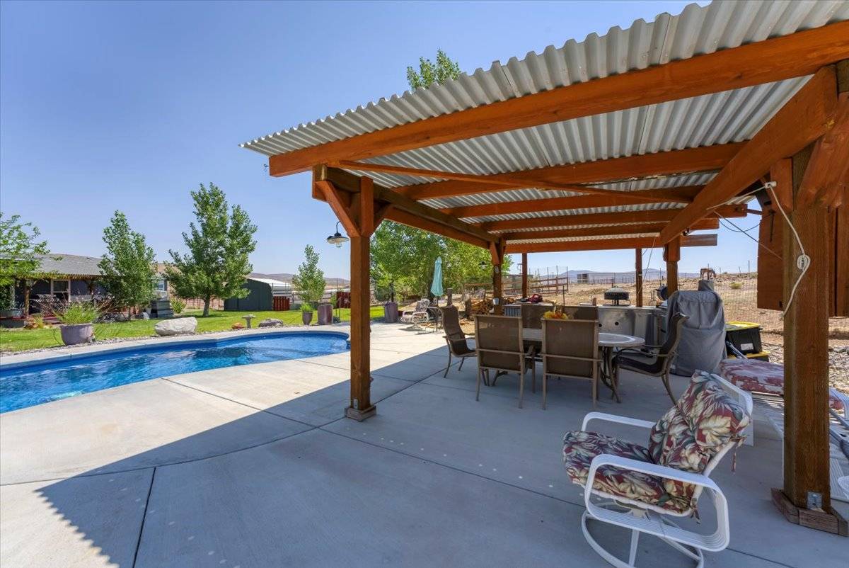 Welcome to peaceful equestrian country living with a rural setting and plenty of space for horse riding, swimming, gardening, and much more. This amazing property has had many new features and amenities added over the last several years. The owners have put in a great horse area for training and horse boarding. This includes a barn, 11 horse boarding shelters, arena and wash rack, agility course, round pen, patience pole, riding trails, tack room, large hay storage, van trailer, and a caretaker 5th wheel quarters. Some of the other outdoor features on this property include an in ground Solar heated fiberglass pool with salt water option, hot tub, outdoor kitchen with smart stove and mounted TV's, bathroom, solar shower, concrete patio and decks, Bacci Ball and Corn Hole court, large lawn, fruit orchard, garden area, 30 x 40 work shop, 30 x 20 garage, RV hookup with small dump station, green house, chicken coop, pump house, plants and trees, and new irrigation.