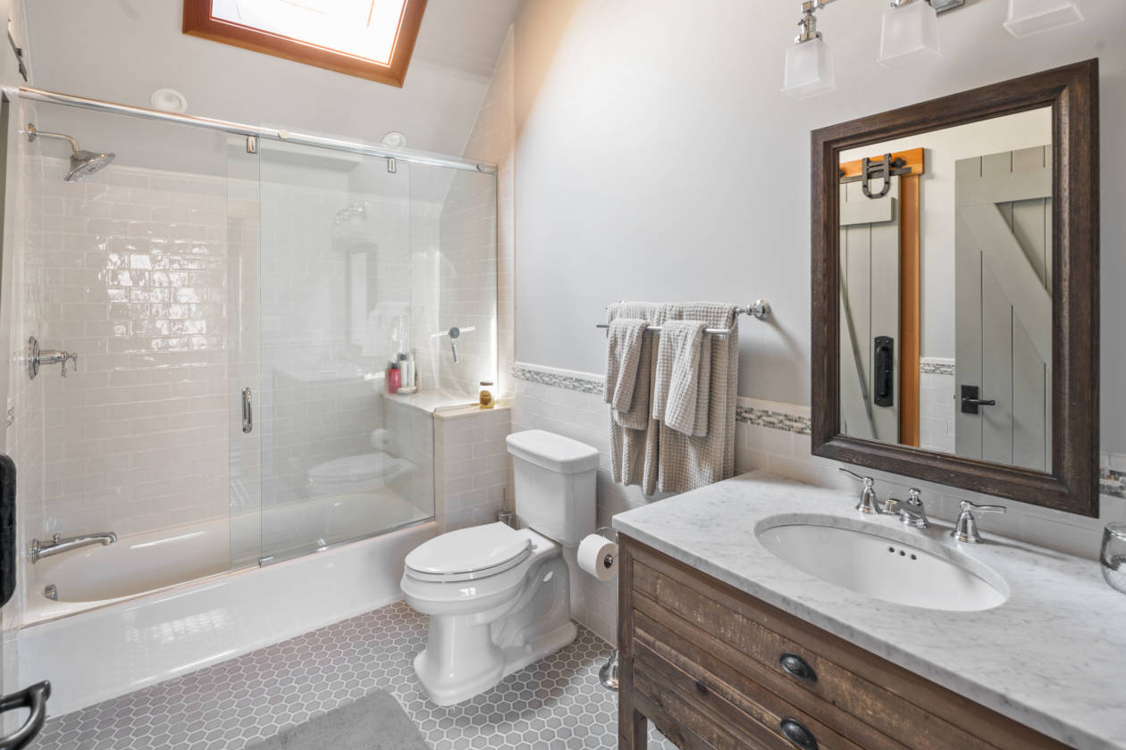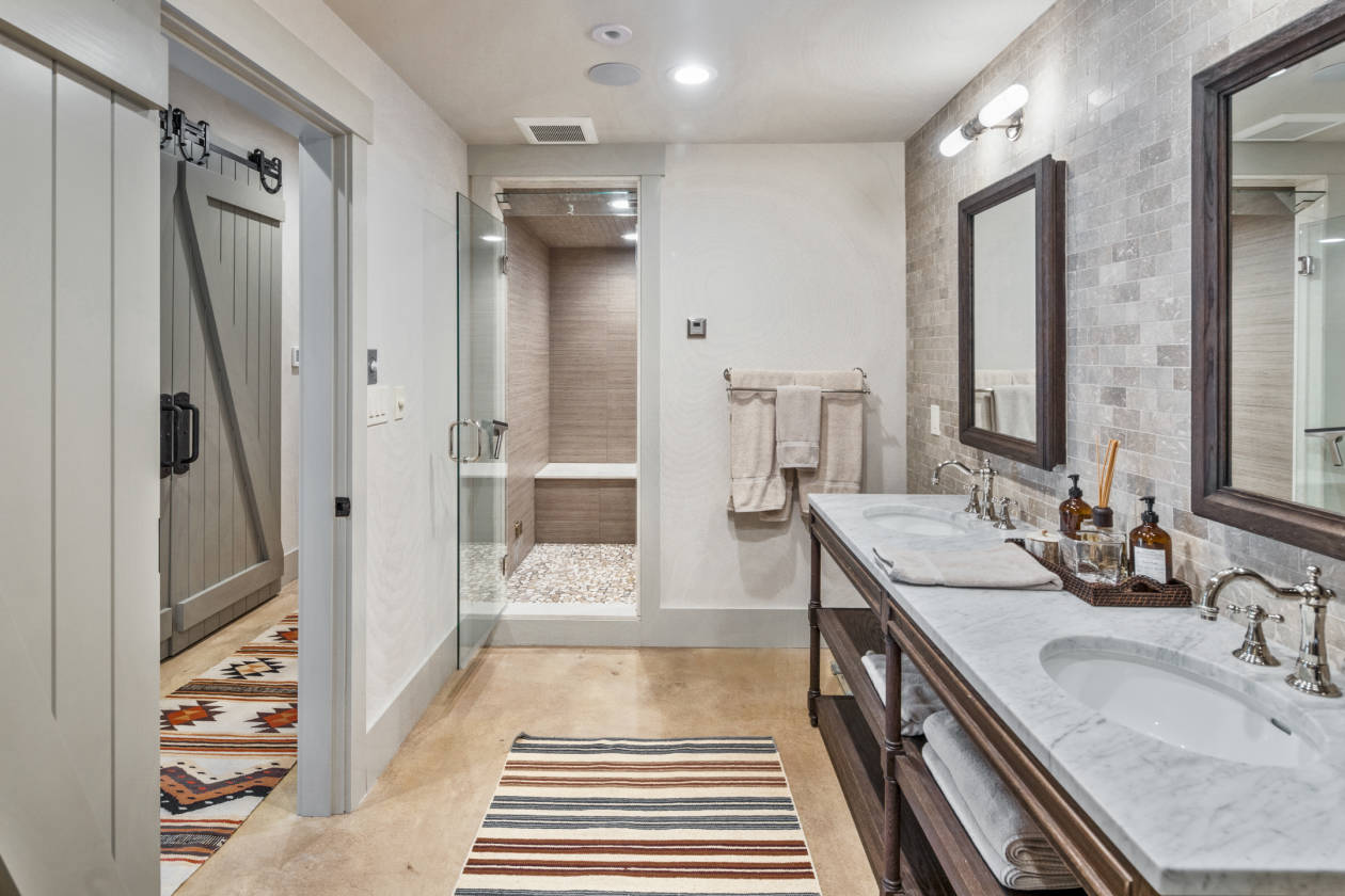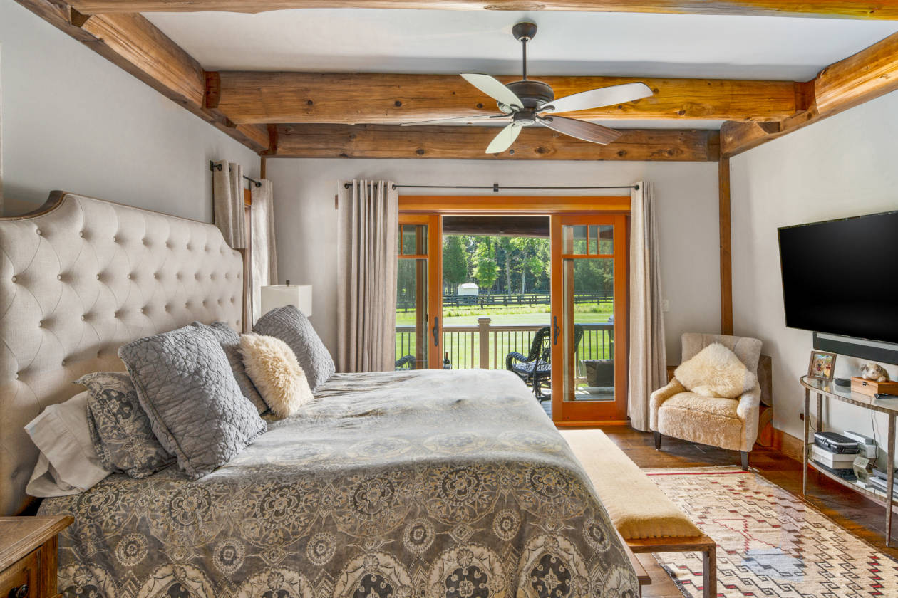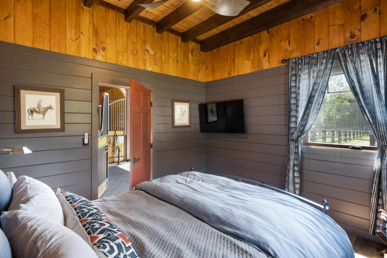- Head outside to the picturesque Amish built post & beam barn with standing-seam metal roof and copper gutters. Featuring 5 oversized stalls with rubber mats, fans, cameras to monitor horses, center aisle with pavers, wash stall, tack room with lockers, kitchenette with full-sized refrigerator, sink, dishwasher, stone countertops, epoxy floors. A guest suite and full bathroom with seamless glass shower. The upper level offers an expansive loft space for entertaining. All aluminum-clad casement windows throughout, vintage water hydrants, a separate well for barn, wi-fi irrigation, Sonos sound system, 100 Amp sub-panel. Round pen 60', 5-6 turnouts, outdoor wash stall, wooded riding trails. 8 acres of fenced pastures with solar-powered electric fencing and water, 100' x 180' riding ring with irrigation system. Whole-house & barn generator. HVAC: 4 zones house, 1 zone barn. Smart switch exterior lighting. Timer for exterior barn lights. Central Vac, Cat 5 & cable throughout. Wi-fi irrigation for lawn & beds. Farm Assessed.