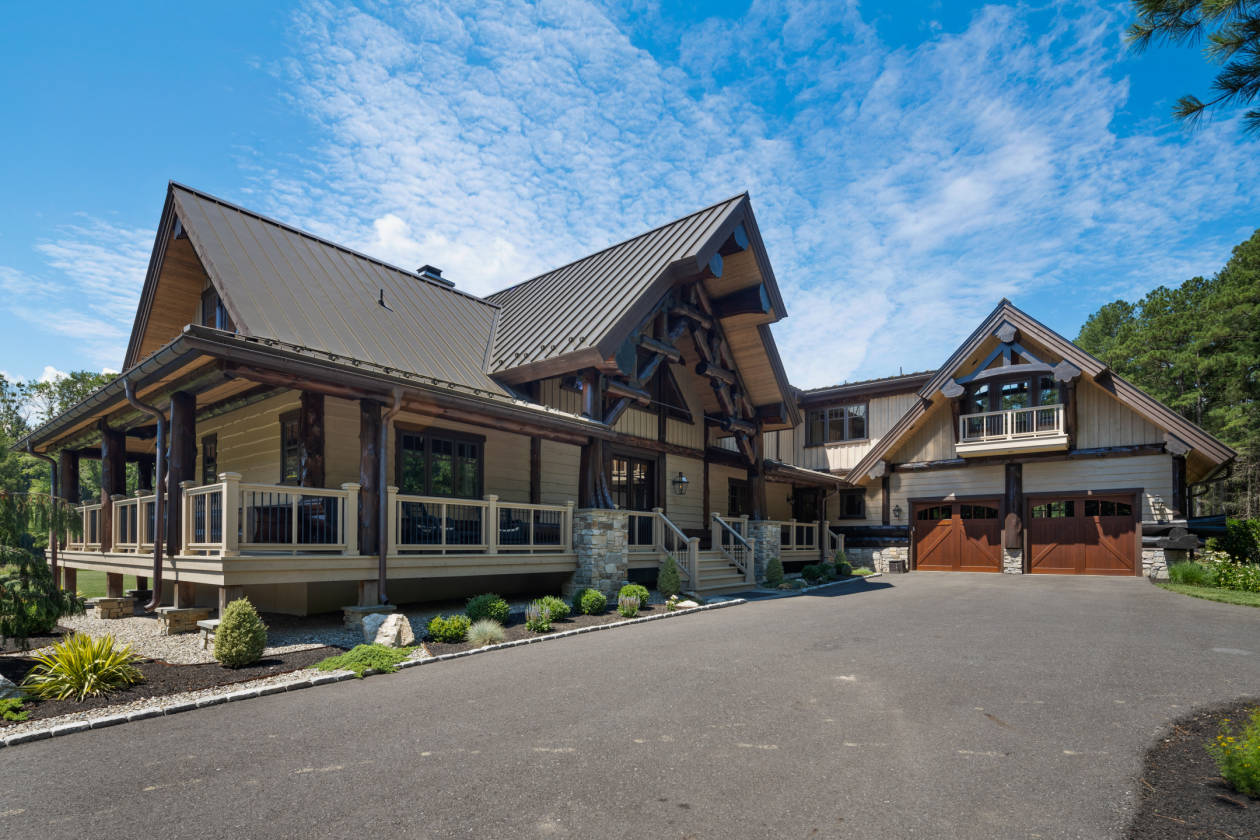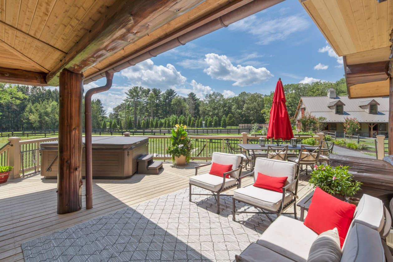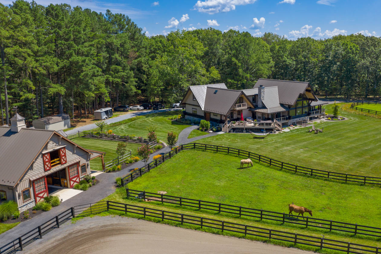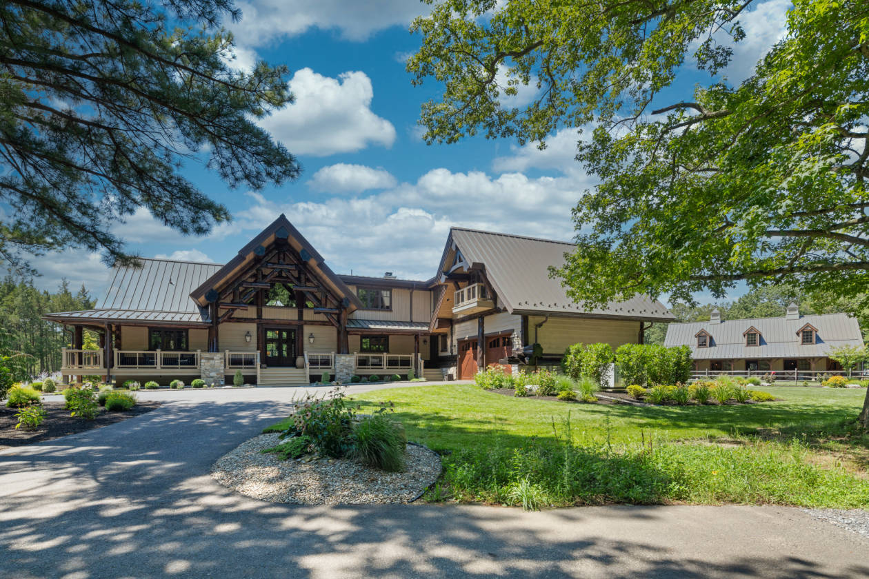 - Extraordinary, one-of-a-kind, handcrafted, hybrid-fusion log home that was custom built with Western Red Cedar logs from British Columbia. This pristine and private retreat is unparalleled in architecture and quality craftsmanship with cedar timbers, decking and siding with standing seam metal roof systems, copper gutters and snow guards. Stone foundation and chimneys with blue stone caps. Handmade, Amish-built, solid doors with Ashley Norton hardware throughout. The meandering drive leads to your own slice of heaven, set back on 31 acres of pure tranquility. Whether you're looking for a country retreat or an equestrian paradise, this property will be sure to suit all of your needs. A covered front porch and entryway flanked by gas lanterns invites you into a gorgeous reception area, paneled in 200-year-old reclaimed barn boards. The dramatic great room boasts an A-frame wall of windows, a floor-to-ceiling stone fireplace and English oak wood floors. Rich in natural elements, textures inherent in the logs, the house provides great scale and livability with an open-concept floor plan for daily living and entertaining. The gourmet kitchen features subway tile, Blue Star gas range with a custom-made ventilation hood, pot filler, leathered granite countertops, Quartz-topped island, Thermador refrigeration, farmhouse sink, cabinetry by StarMark and a walk-in pantry. Fantastic integration of indoor and outdoor spaces that flow seamlessly. Access a lovely veranda from the main entertaining area to enjoy the outdoor stone, wood-burning fireplace and hot tub as you overlook the expansive backyard and pastures. The first-floor main bedroom suite with French doors to a covered porch, an exquisite master bathroom with Carrara marble, an oversized seamless glass rainfall shower, polished nickel fixtures, cast iron footed soaking tub, double vanity and a walk-in closet with custom built-ins. The main level also offers a guest suite/home office with Hunter Douglas electric shades, access to the rear deck and an additional full bathroom. The laundry room is outfitted with storage, leathered granite countertops, tile backsplash, Shaws Original farmhouse sink; access to the front porch and oversized, climate controlled two-car garage with commercial-grade epoxy floors, custom cedar garage doors. A stunning stairwell with a custom hand-hammered wrought-iron railing leads to the upper level with a fabulous loft lounge area that overlooks the great room, three spacious bedrooms with custom closet organization systems and balconies. A full bathroom finished in polished hexagonal tile, tub/shower and marble top vanity. The finished lower level offers a second kitchen with Thermador steam oven, island with reclaimed barn boards and leathered granite. TV/media room with barn board walls. A gym with walkout access, a full bath with oversized steam shower, double vanity with marble top and tile backsplash. A second laundry room and storage.