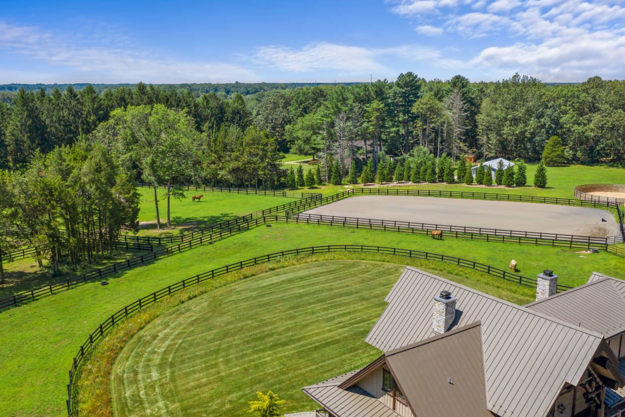 Extraordinary, one-of-a-kind, handcrafted, hybrid-fusion log home that was custom built with Western Red Cedar logs from British Columbia. This pristine and private retreat is unparalleled in architecture and quality craftsmanship with cedar timbers, decking and siding with standing seam metal roof systems, copper gutters and snow guards. Stone foundation and chimneys with blue stone caps. Handmade, Amish-built, solid doors with Ashley Norton hardware throughout. The meandering drive leads to your own slice of heaven, set back on 31 acres of pure tranquility. Whether you're looking for a country retreat or an equestrian paradise, this property will be sure to suit all of your needs. A covered front porch and entryway flanked by gas lanterns invites you into a gorgeous reception area, paneled in 200-year-old reclaimed barn boards. The dramatic great room boasts an A-frame wall of windows, a floor-to-ceiling stone fireplace and English oak wood floors. Rich in natural elements, textures inherent in the logs, the house provides great scale and livability with an open-concept floor plan for daily living and entertaining. The gourmet kitchen features subway tile, Blue Star gas range with a custom-made ventilation hood, pot filler, leathered granite countertops, Quartz-topped island, Thermador refrigeration, farmhouse sink, cabinetry by StarMark and a walk-in pantry. Fantastic integration of indoor and outdoor spaces that flow seamlessly. Access a lovely veranda from the main entertaining area to enjoy the outdoor stone, wood-burning fireplace and hot tub as you overlook the expansive backyard and pastures. The first-floor main bedroom suite with French doors to a covered porch, an exquisite master bathroom with Carrara marble, an oversized seamless glass rainfall shower, polished nickel fixtures, cast iron footed soaking tub, double vanity and a walk-in closet with custom built-ins. The main level also offers a guest suite/home office with Hunter Douglas electric shades, access to the rear deck and an additional full bathroom. The laundry room is outfitted with storage, leathered granite countertops, tile backsplash, Shaws Original farmhouse sink; access to the front porch and oversized, climate controlled two-car garage with commercial-grade epoxy floors, custom cedar garage doors. A stunning stairwell with a custom hand-hammered wrought-iron railing leads to the upper level with a fabulous loft lounge area that overlooks the great room, three spacious bedrooms with custom closet organization systems and balconies. A full bathroom finished in polished hexagonal tile, tub/shower and marble top vanity. The finished lower level offers a second kitchen with Thermador steam oven, island with reclaimed barn boards and leathered granite. TV/media room with barn board walls. A gym with walkout access, a full bath with oversized steam shower, double vanity with marble top and tile backsplash. A second laundry room and storage. Head outside to the picturesque Amish built post & beam barn with standing-seam metal roof and copper gutters. Featuring 5 oversized stalls with rubber mats, fans, cameras to monitor horses, center aisle with pavers, wash stall, tack room with lockers, kitchenette with full-sized refrigerator, sink, dishwasher, stone countertops, epoxy floors. A guest suite and full bathroom with seamless glass shower. The upper level offers an expansive loft space for entertaining. All aluminum-clad casement windows throughout, vintage water hydrants, a separate well for barn, wi-fi irrigation, Sonos sound system, 100 Amp sub-panel. Round pen, 5-6 turnouts, outdoor wash stall, wooded riding trails. 8 acres of fenced pastures with solar-powered electric fencing and water, 60' riding ring with irrigation system. Whole-house & barn generator. HVAC: 4 zones house, 1 zone barn. Smart switch exterior lighting. Timer for exterior barn lights. Central Vac, Cat 5 & cable throughout. Wi-fi irrigation for lawn & beds. Farm Assessed.