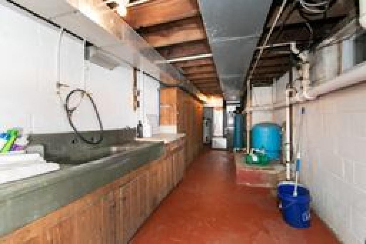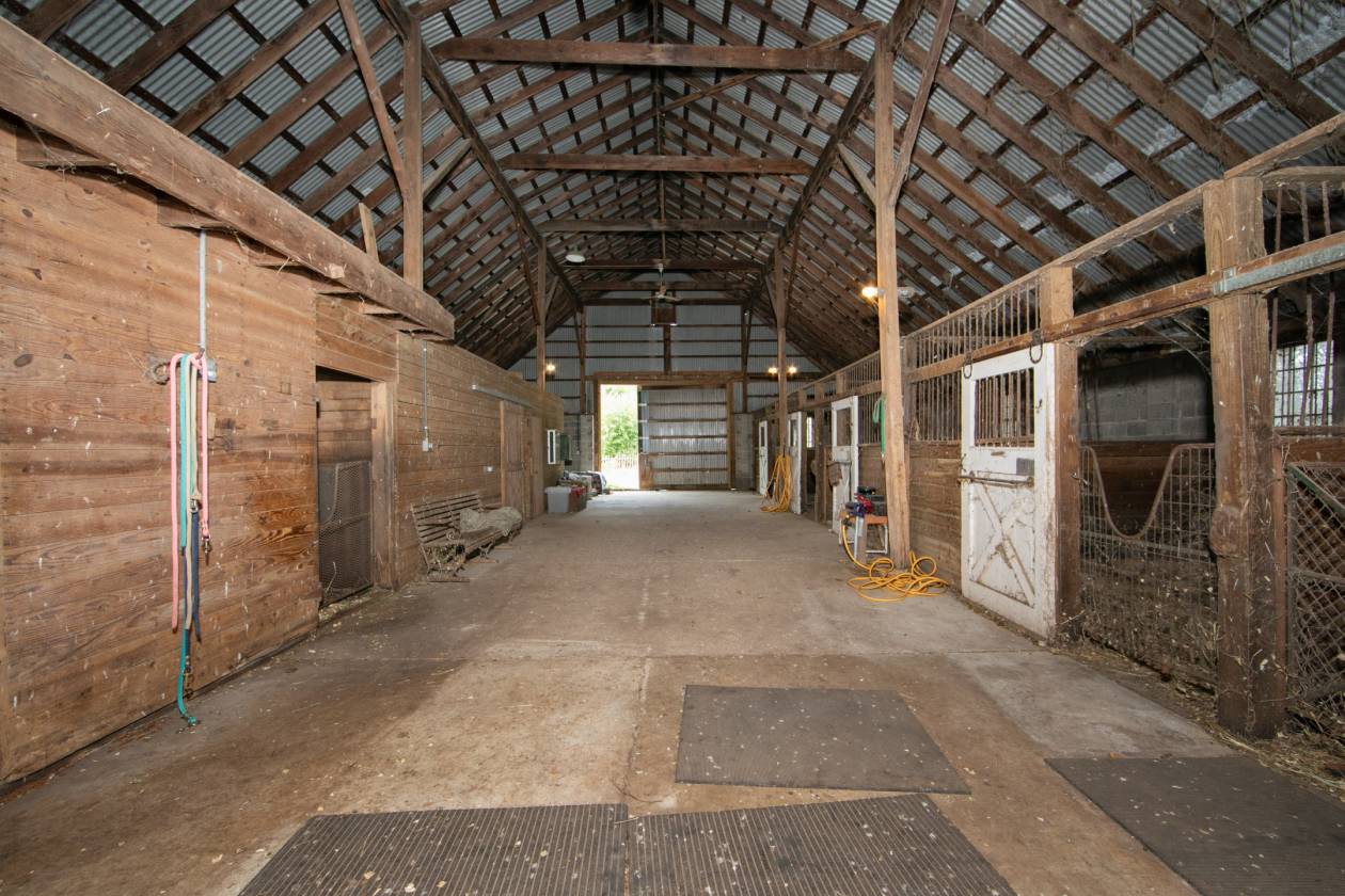 - 10 stall block barn with hay loft, tack room feed room, bathroom room with hot water heater and washer/dryer hookups. Wash stall with hot water. Concrete center Aisle . 2 frost free hydrants. Sliding stall doors.