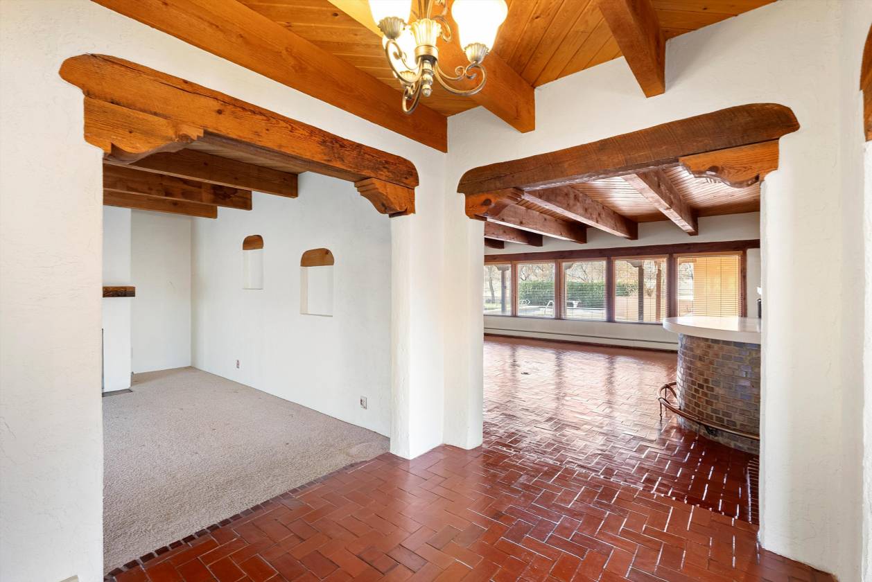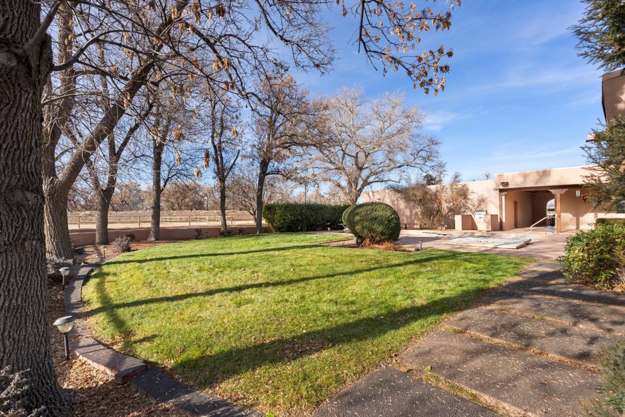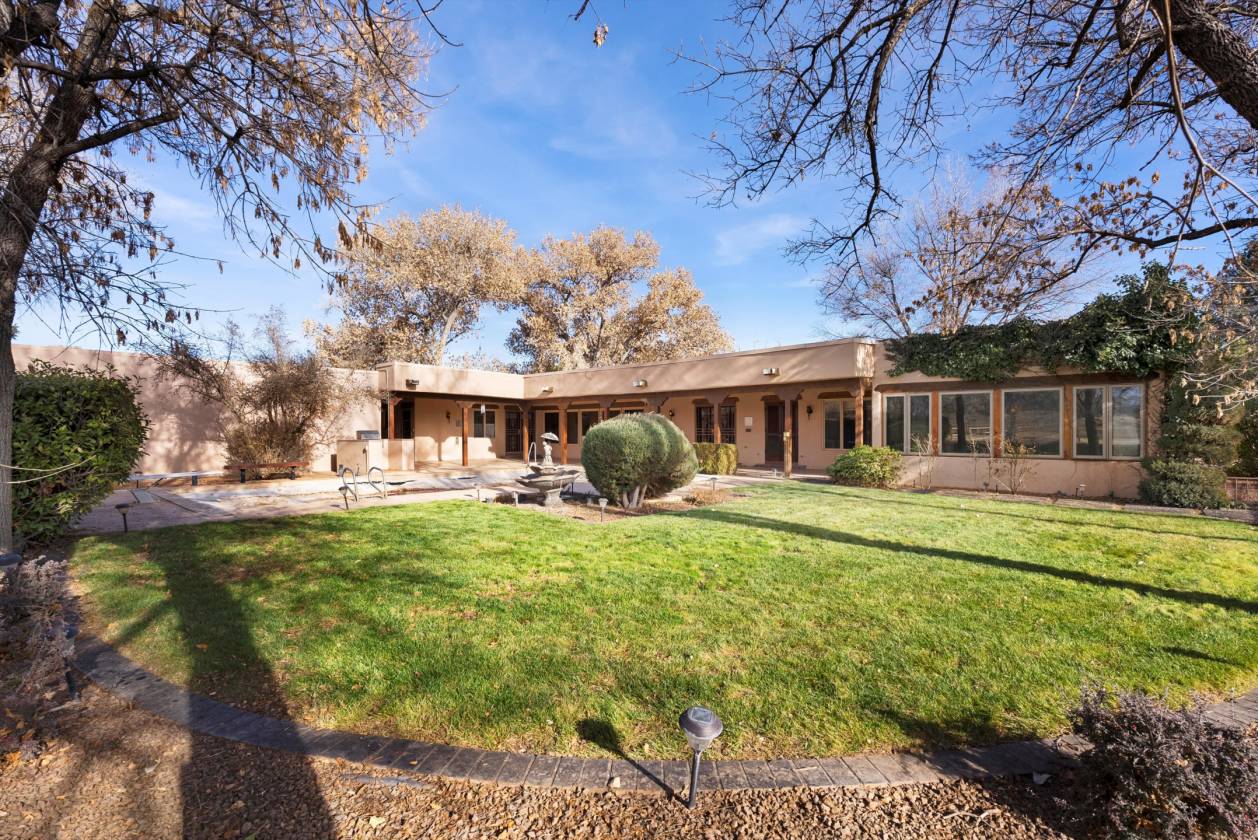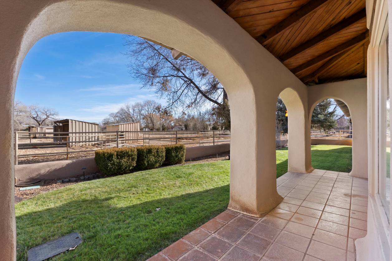 Welcome to this extraordinary 4,500-square-foot SW Pueblo-style estate, located in the prestigious Los Ranchos area in Albuquerque's picturesque North Valley. This single-level home is a rare find, set on 3.6 beautifully landscaped acres, offering endless possibilities. The home's exterior exudes timeless charm, with sprawling verandah, open fields, a pool and hot tub. Inside, you'll find authentic brick flooring, rough cut beams, and T&G ceilings that showcase the craftsmanship of a bygone era. A cozy in-law suite with a kitchenette, bedroom, and living area adds convenience and flexibility. Rarely does an opportunity like this come along. Experience the perfect blend of rustic elegance and functionality in one of Albuquerque's most sought-after locations.