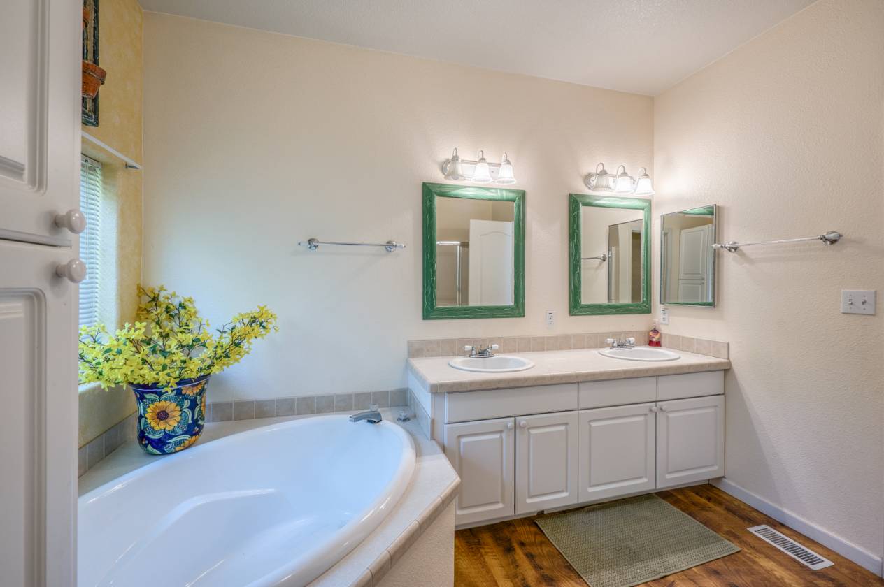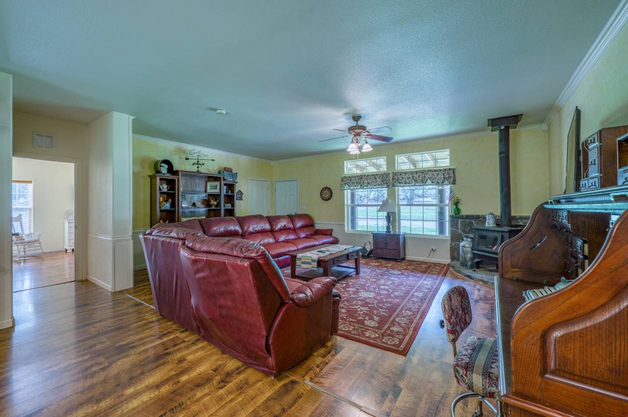 - On your furthest left is the ranch house. This beautiful log exterior ranch-style home, is approximately 2400 square feet with 4 bedrooms, 2 baths w/shower & 1 bathroom w/tub. It also includes a full kitchen & dining, large living room with wood stove and a mudroom with washer and dryer. The huge front porch looks directly towards the pond. With a garden area and chicken coop nearby this is the perfect spot to become one with nature surrounded by giant oak trees.