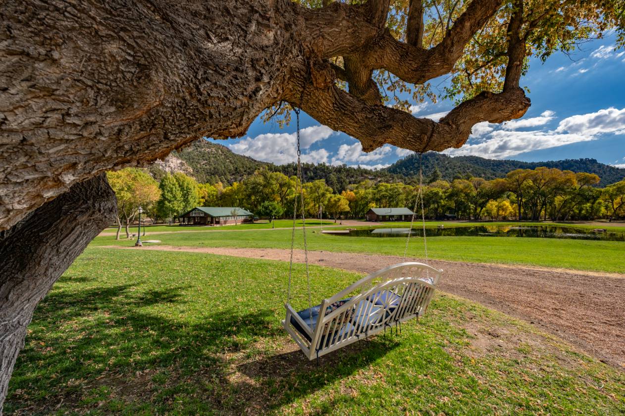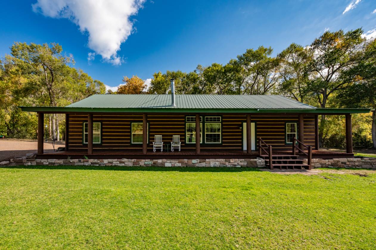 - Just a short 65 yards from the pavement you will cross through the beautiful one-of-a-kind log entry and then cross the Apache creek and within another 100 yards will come upon the large 20 acre meadow with a half acre pond in the center with 2 homes on the left and a diner, 2 homes, a shop/barn and a cabin complex on your right.