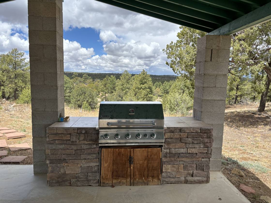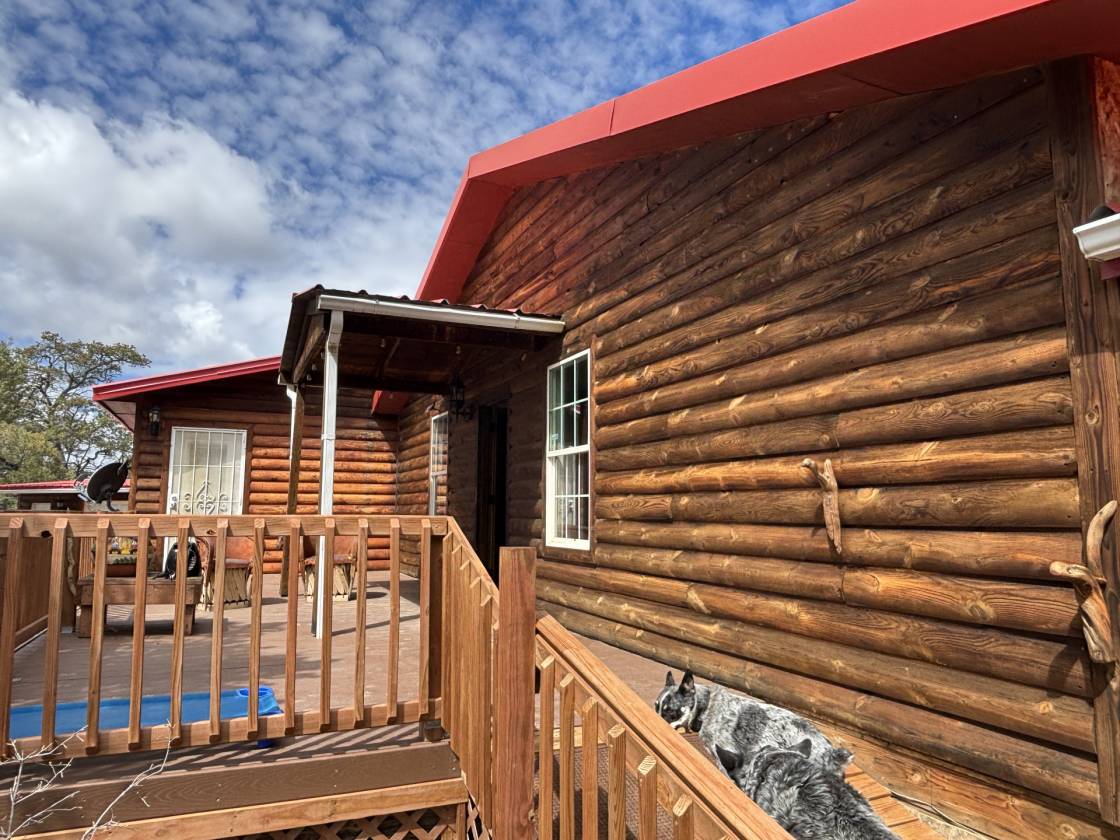 - Both houses are log sided and in excellent condition. Modern laminate floors throughout, majestic beams indoors, handicapped access ramp at main house, modern country kitchen, large bedrooms, game room can be used as a bedroom, ranch style fireplace in main and wood stove in guest house, quiet, excellent well provides 10 gallons/minute, shop/storage building, screened porch with amazing view, separate pergola has outdoor built-in bbq grill.