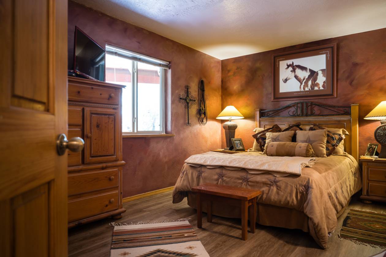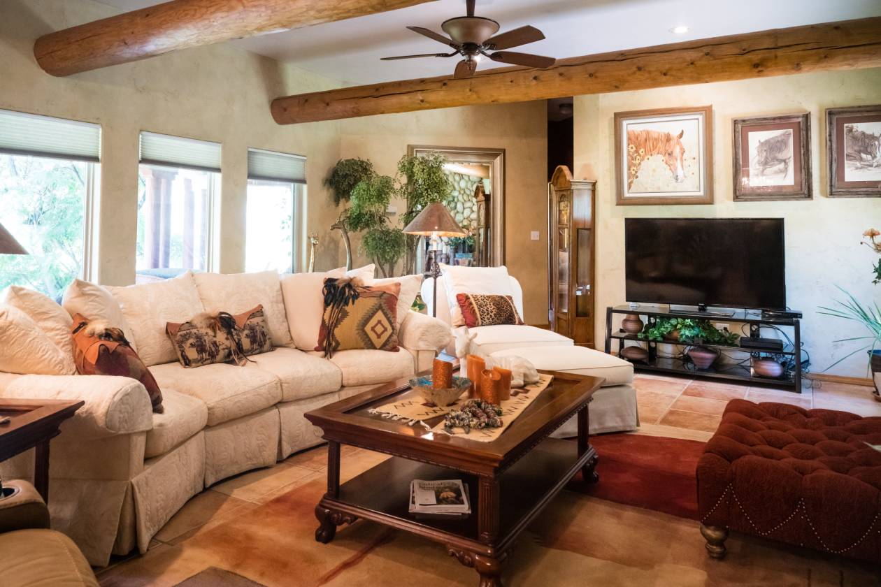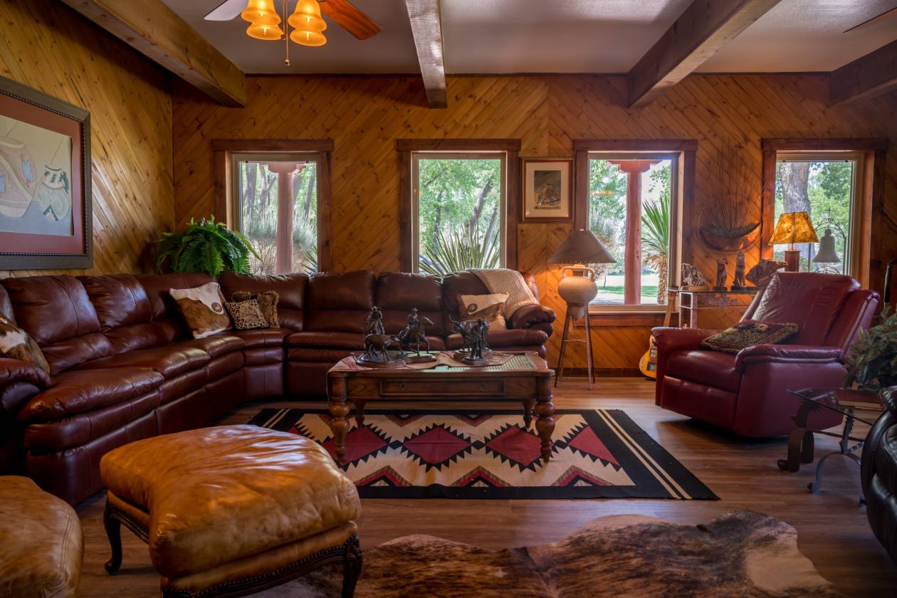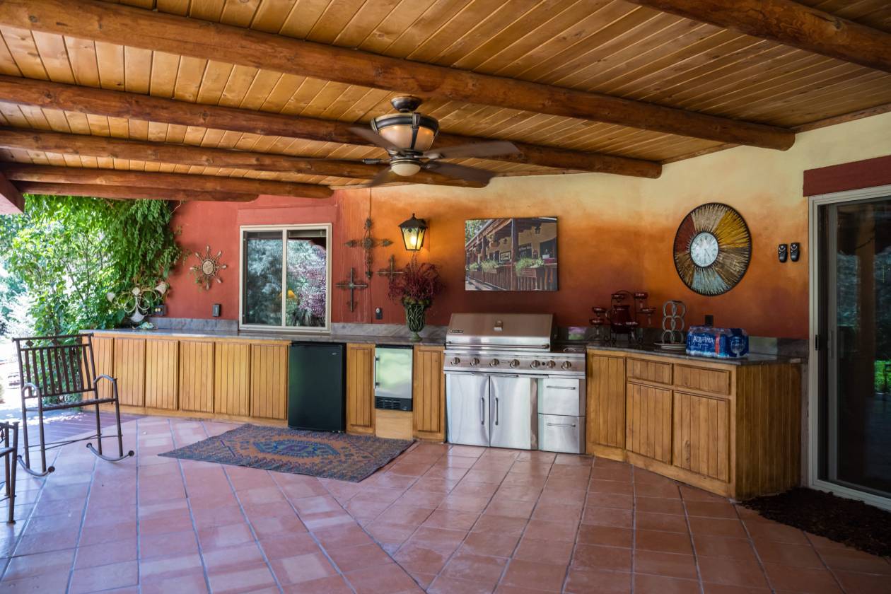 - The custom designed Santa Fe Style home was crafted and built for this exact property location, with the intention of balancing the hundreds of ft of river frontage, ponds, manicured pastures, and the gorgeous stand of cotton woods. With its spacious and tastefully designed open floor plan, this magnificent residence includes a polished and well-crafted office which has inside and outside. The large island gourmet kitchen, containing a massive walk-in pantry, definitely compliments the large great room with its welcoming fireplace. It’s almost as if the home has three master bedrooms due to the way each one a has its own wing designed for privacy. Two huge walk-in closets compliment the master suite. A huge 3.5 bay garage attached by a breezeway could house even the largest 3500 long-bed dually! And without a doubt, one of the homes most impressive features is the incredible front and rear veranda’s, which include an outdoor kitchen to entertain while enjoying the southwest’s phenomenal climate with family and friends.