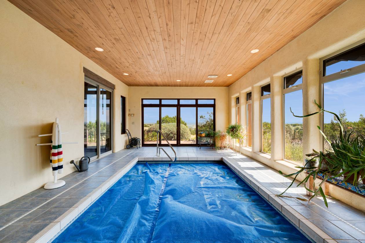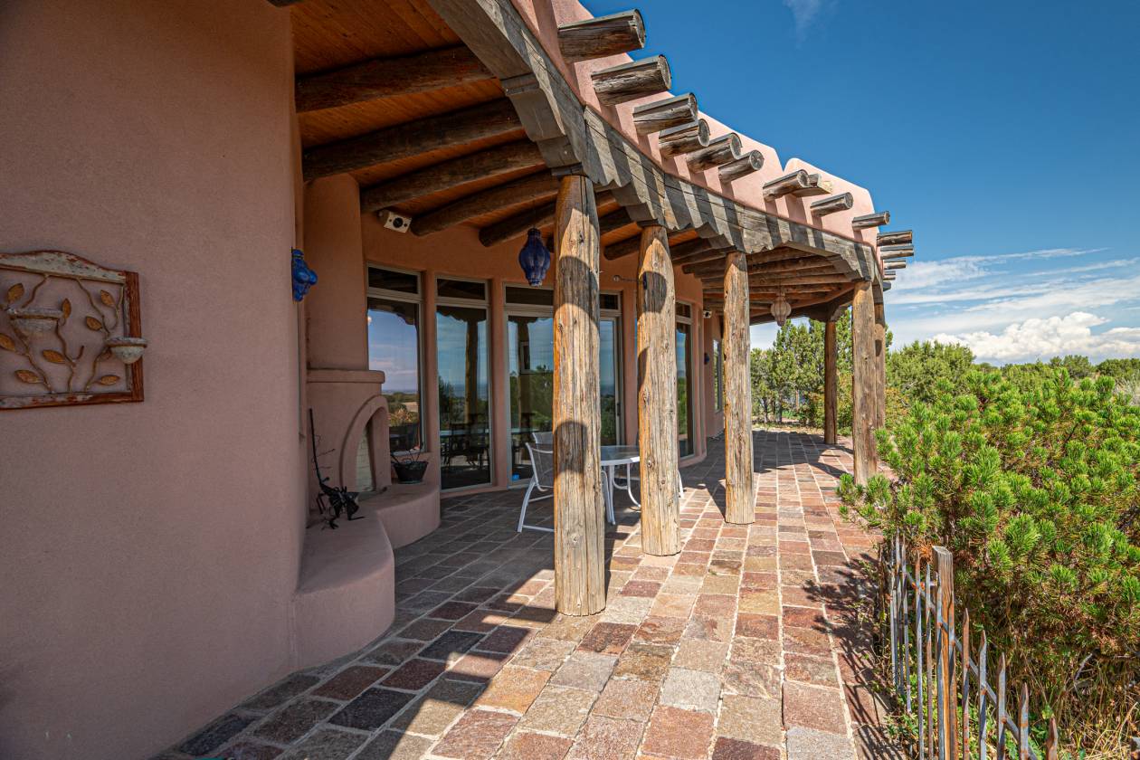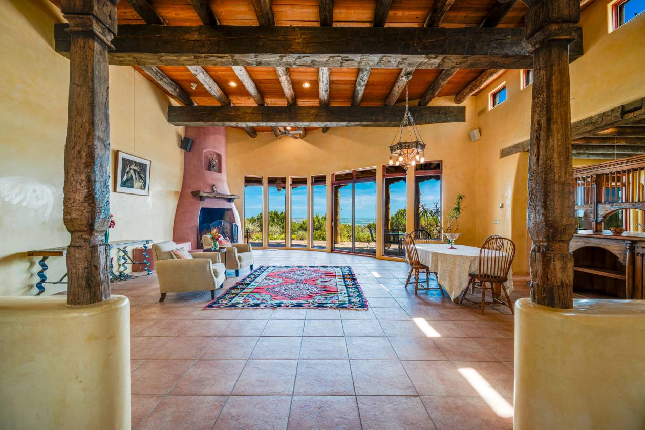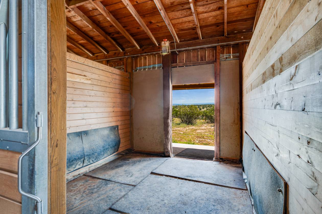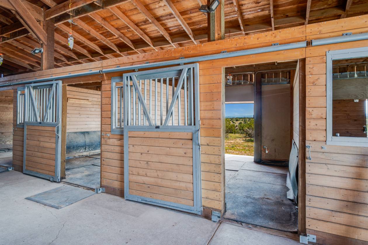 Oro Viejo Ranch is a timeless sanctuary on 106 acres. A harmonious blend of natural splendor, meticulous craftsmanship, and modern convenience. There are breathtaking panoramic views of the Sangre de Cristo, Ortiz Mountains, Cerrillos Hills, and the iconic Lone Butte. Horse enthusiasts will appreciate the six-stall, barn, tack room, workshop, covered hay storage, electric, and hot water, and protected outdoor runs. A insulated chicken coop provides the perfect setup for fresh eggs, while a private well with a large storage tank ensures a reliable water source. A convenient RV hookup is also available on the property.