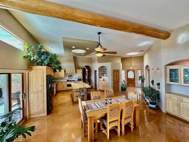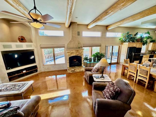 - With ‘Old World’ Pueblo charm & open floor plan, this home has stained concrete floors, high ceilings, vigas,