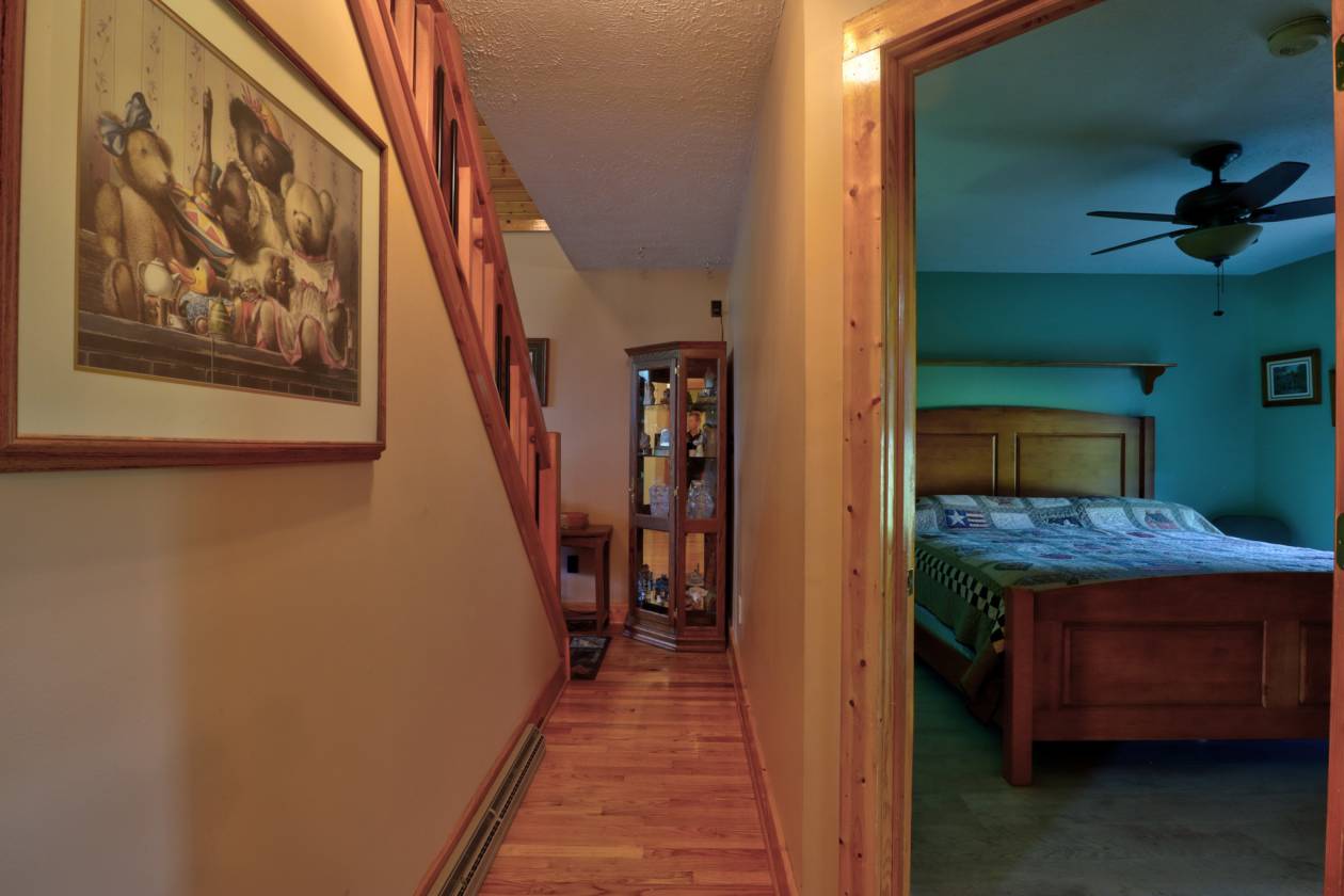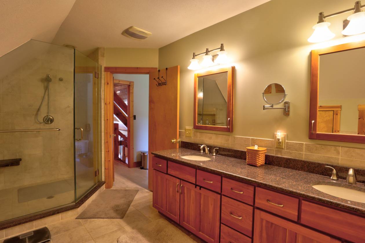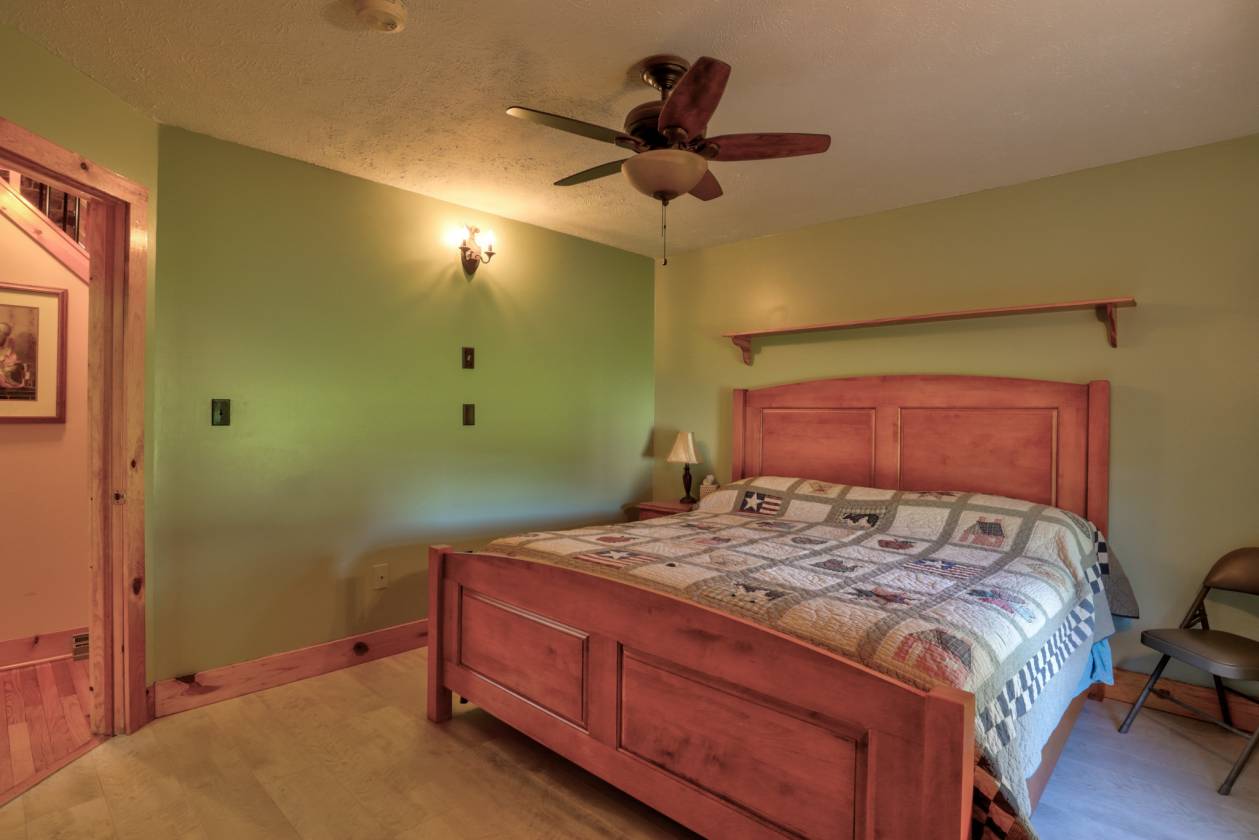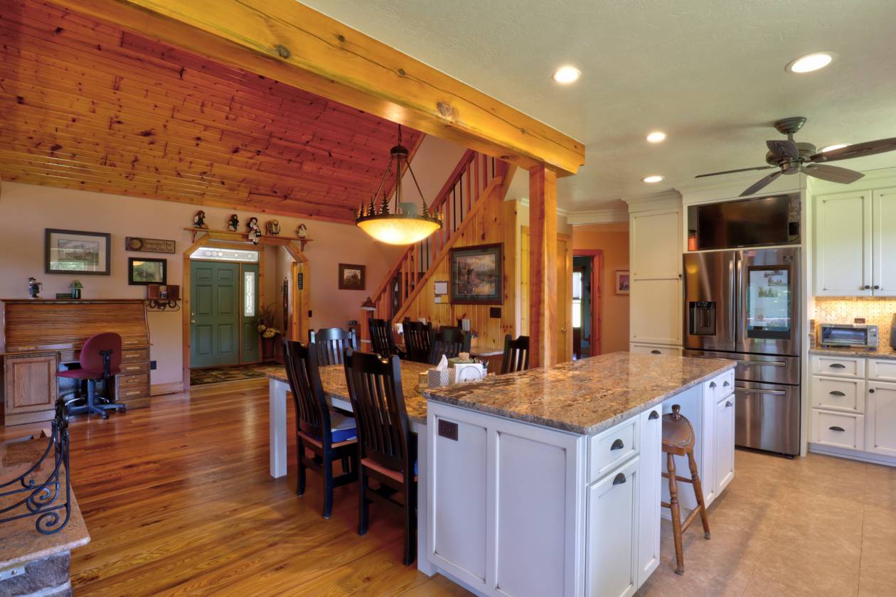 - The main residence (originally built in 97 w/ 08 living room addition) boasts 4 bedrooms and 3 baths, a beautiful kitchen with granite counter, and beautifully handcrafted woodwork throughout the interior, double sided stone fireplace with timber frame cathedral ceilings.