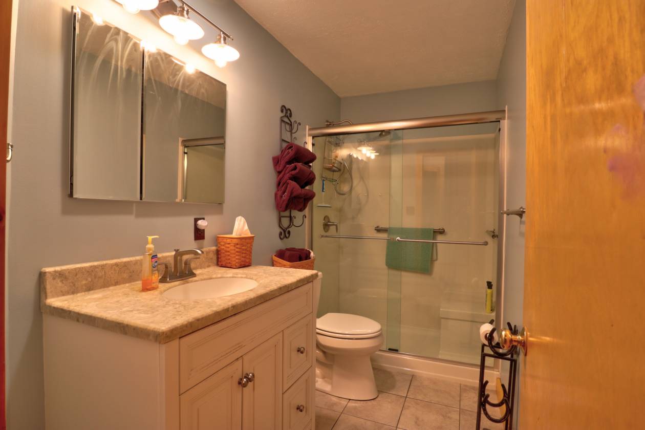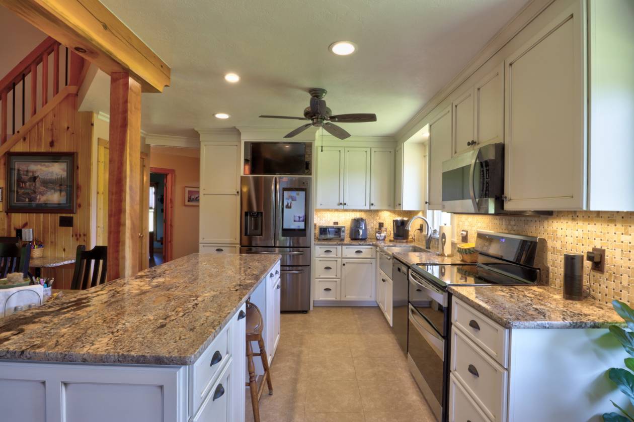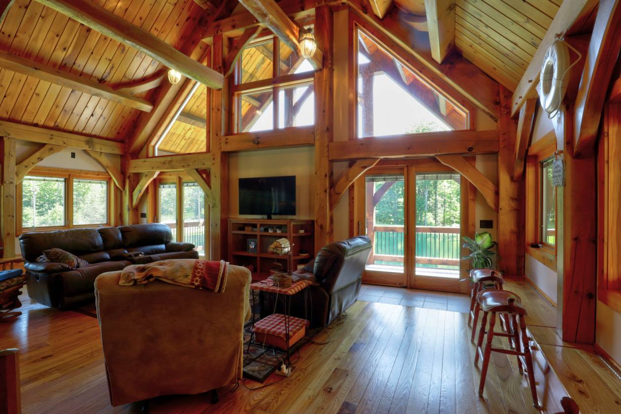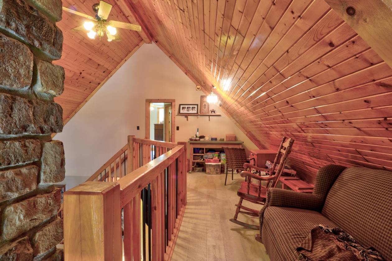 - The main residence (originally built in 97 w/ 08 living room addition) boasts 4 bedrooms and 3 baths, a beautiful kitchen with granite counter, and beautifully handcrafted woodwork throughout the interior, double sided stone fireplace with timber frame cathedral ceilings.