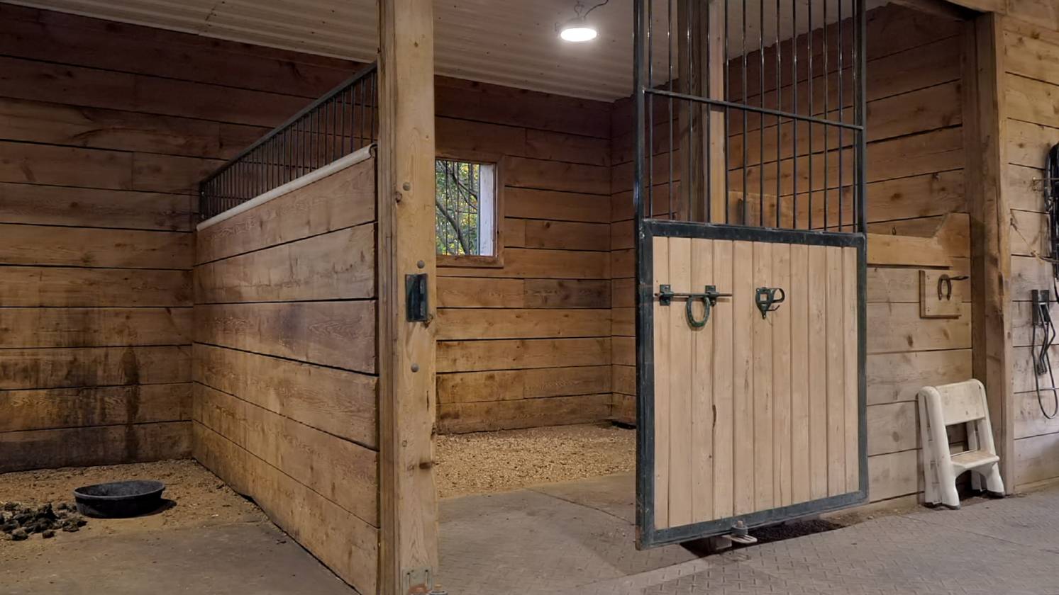• 9-stall barn is well-lit and fully equipped with a secure tack room, viewing area overlooking the 100x120 outdoor arena, and multiple well-drained pastures and paddocks. Additional features include a large storage barn and a 2,100 sqft workshop for hobbies or creative pursuits.