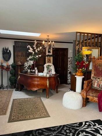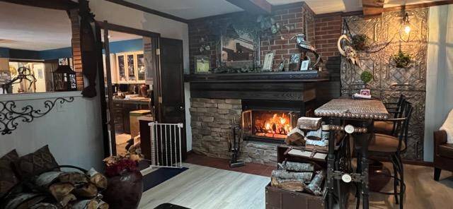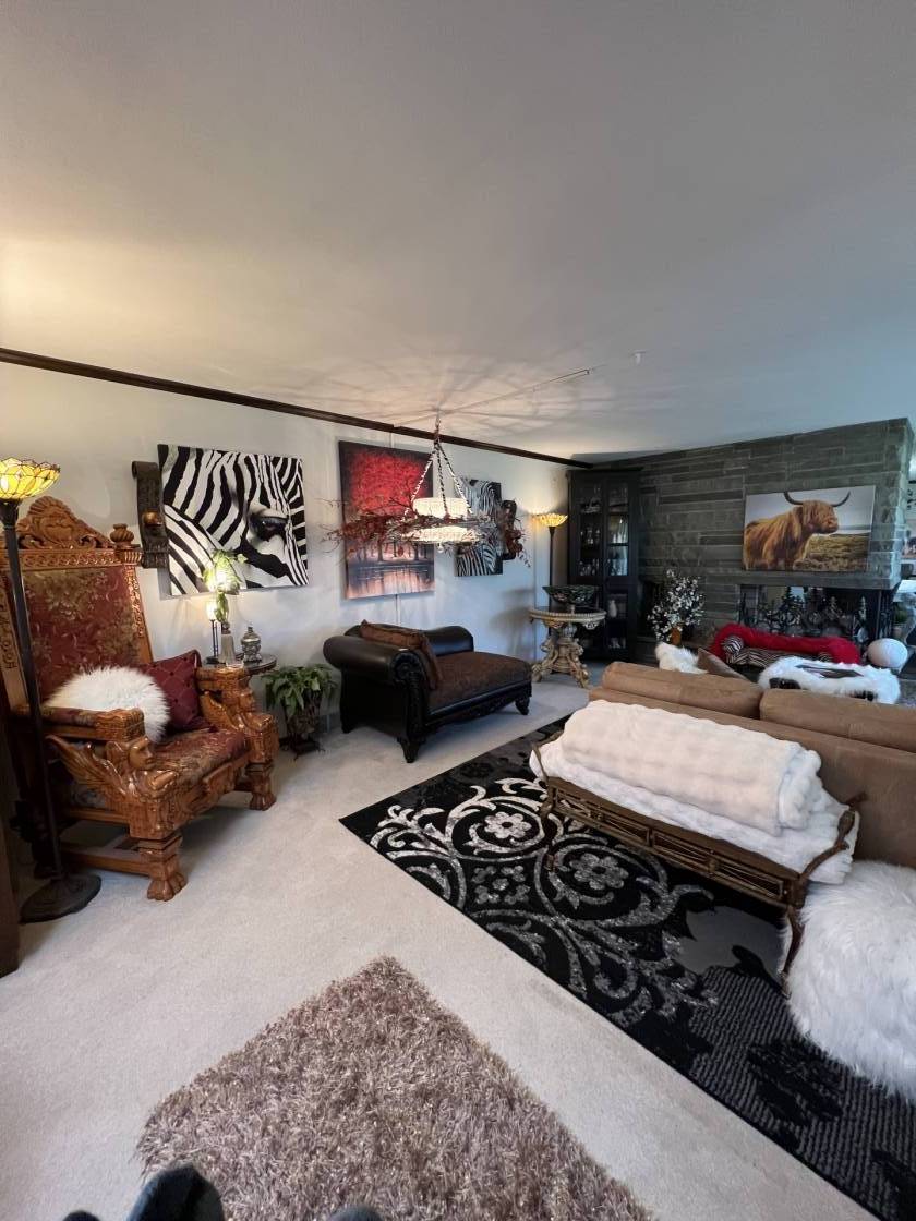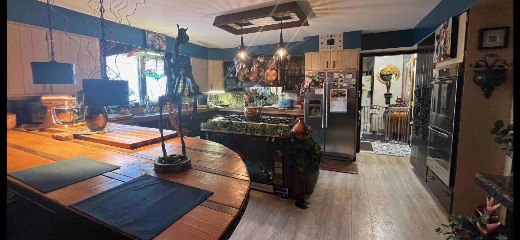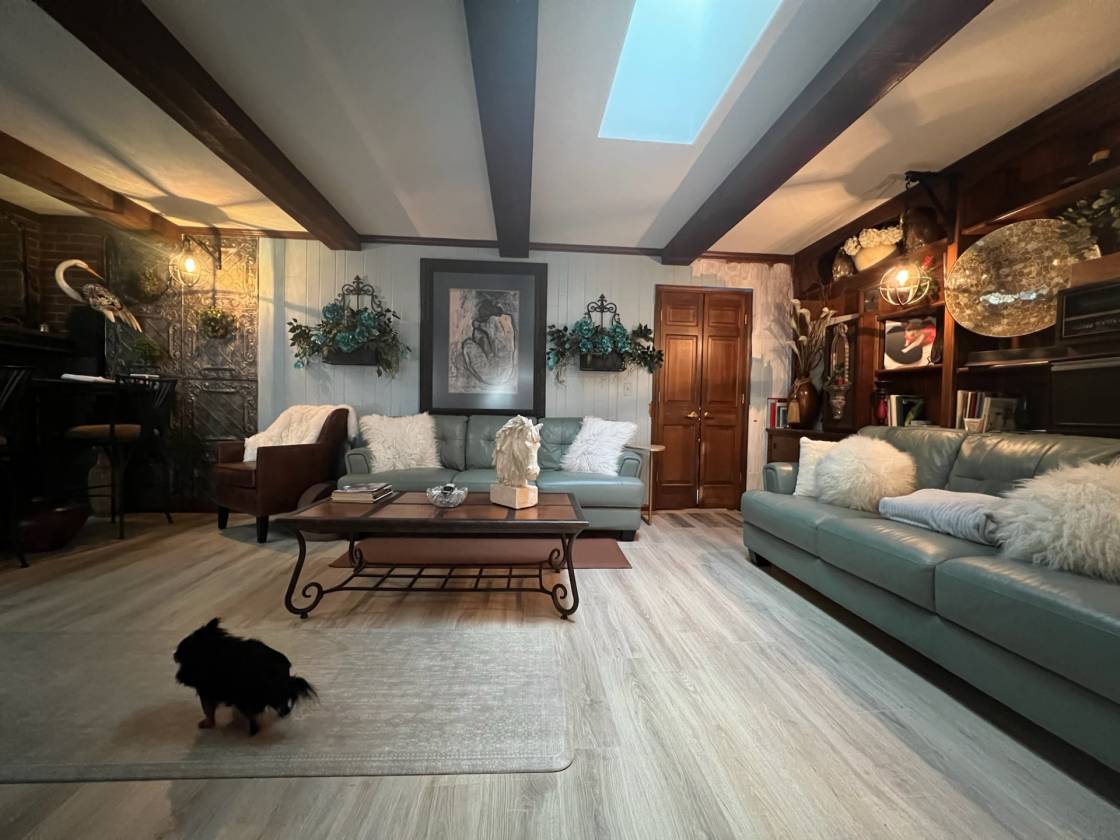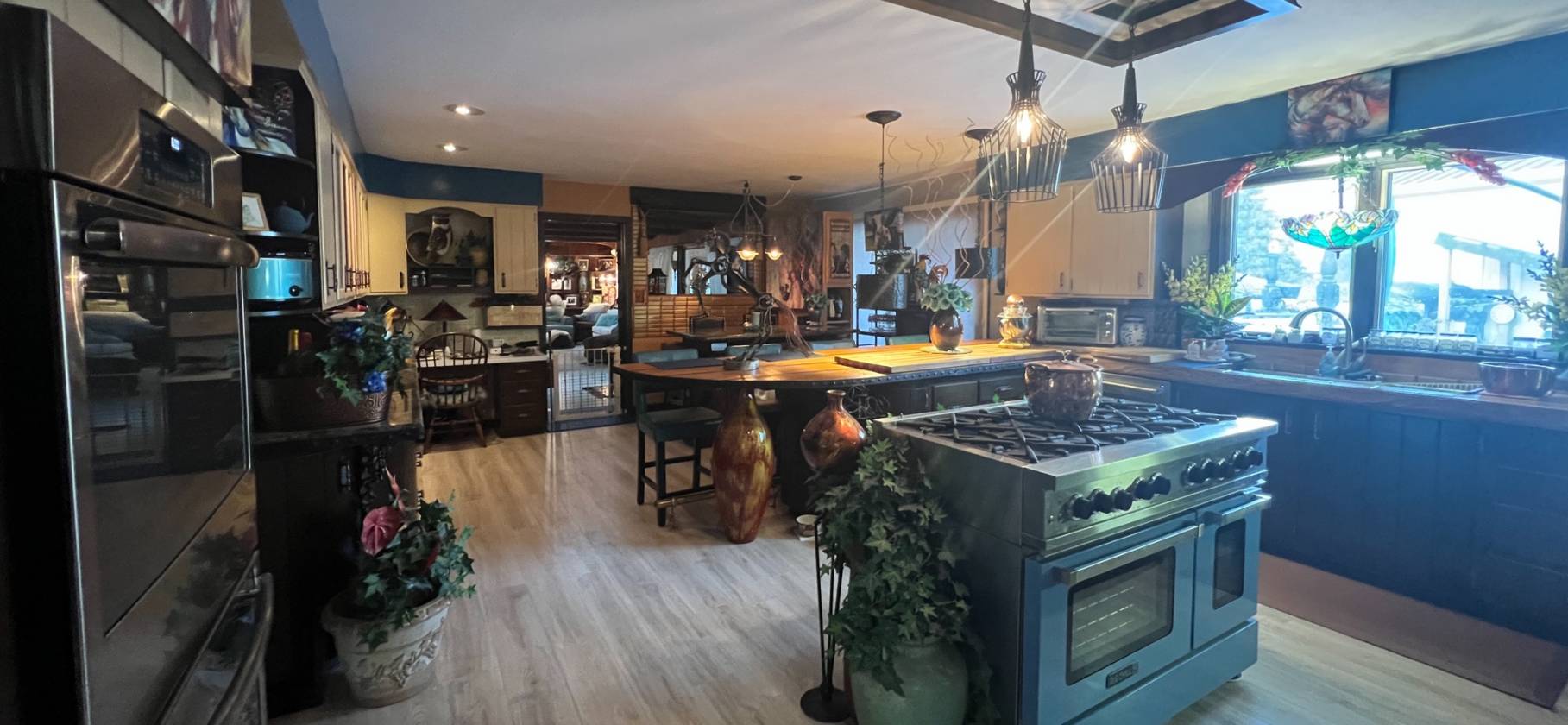 - Spacious one level living situated on 4.65 acres. This mid-century home has recently been updated while still reminiscent of that era's character and charm. Minutes from town @ located in sought after Fayetteville/Manlius school district. A dream kitchen awaits that serious cook or baker, boasting an 8 -burner gas range, or if you prefer a 5- burner electric cook-top along with 4 ovens! A massive kitchen encompasses 56 feet of counter space along with a 12- foot island. Top of the line appliances, triple bay sink, large pantry, complimented by granite and butcher block. Undoubtedly the heart of the home! An oversized great room impresses with wood beams, skylights, double sided wood burning fireplace and 16 feet of glass sliders. An attached sunroom currently being used for a second dining area will hold up to 20 guests for holiday gatherings. An additional dining and den area off kitchen includes wall of windows skylights, @ triple sided fireplace. Large primary bedroom with ensuite bath, walk-in closet @ sliding glass doors. There are 3 more large bedrooms with expansive closet space. Please do not drive into driveway without an appointment. 3% to buyers agent.