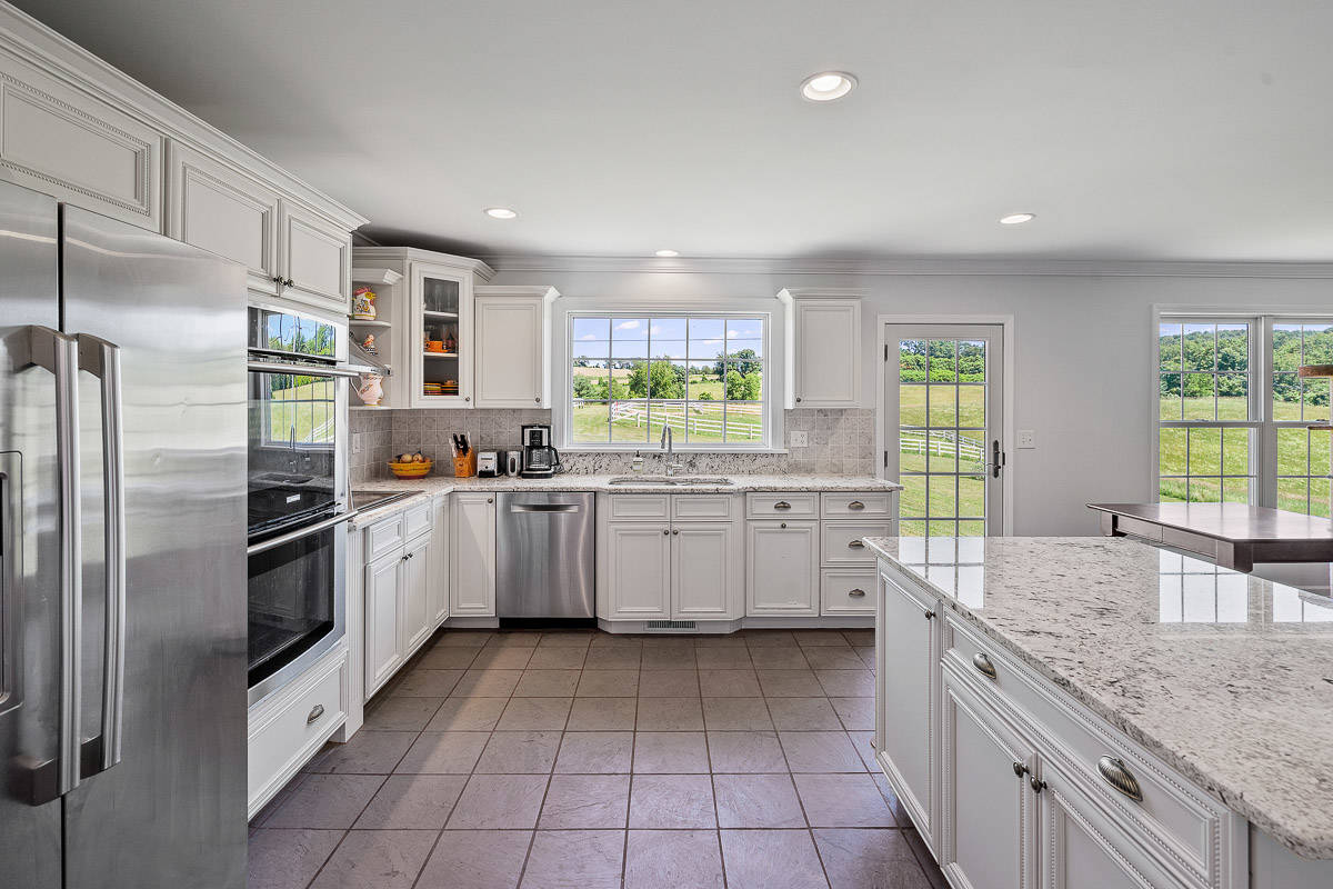 - -Gourmet Kitchen with granite countertops, Vermont Slate floor, ss appliances, double wall ovens, beadwork cabinetry, large walk in pantry with custom shelving