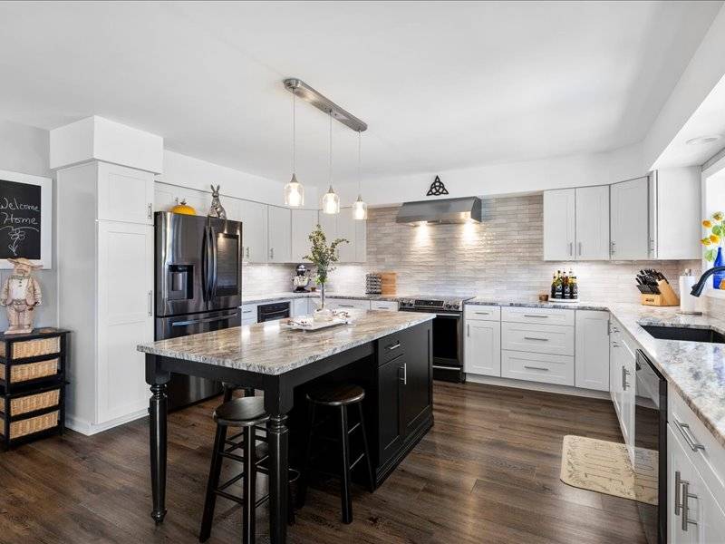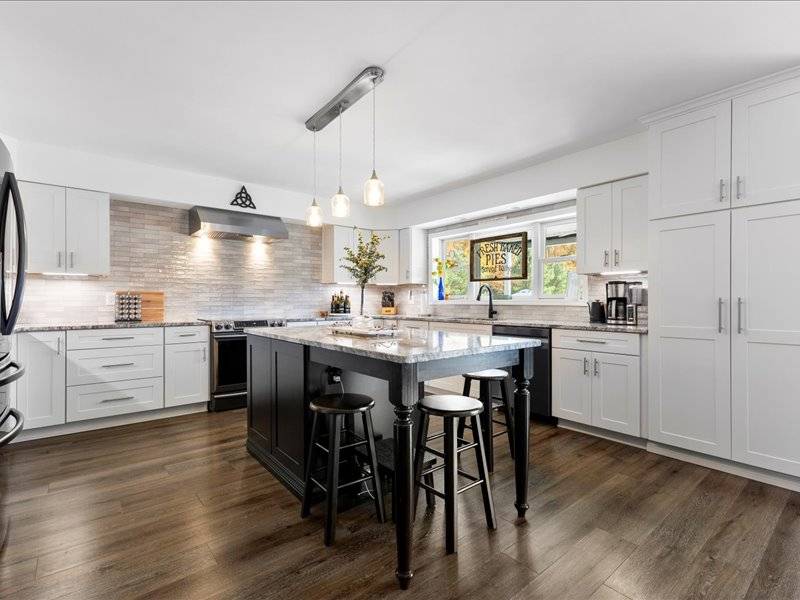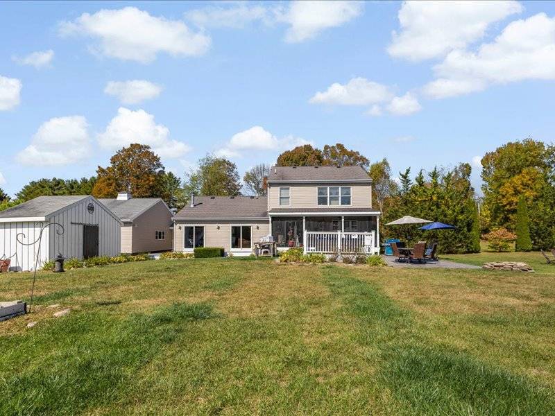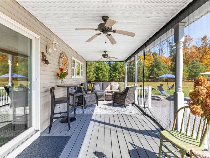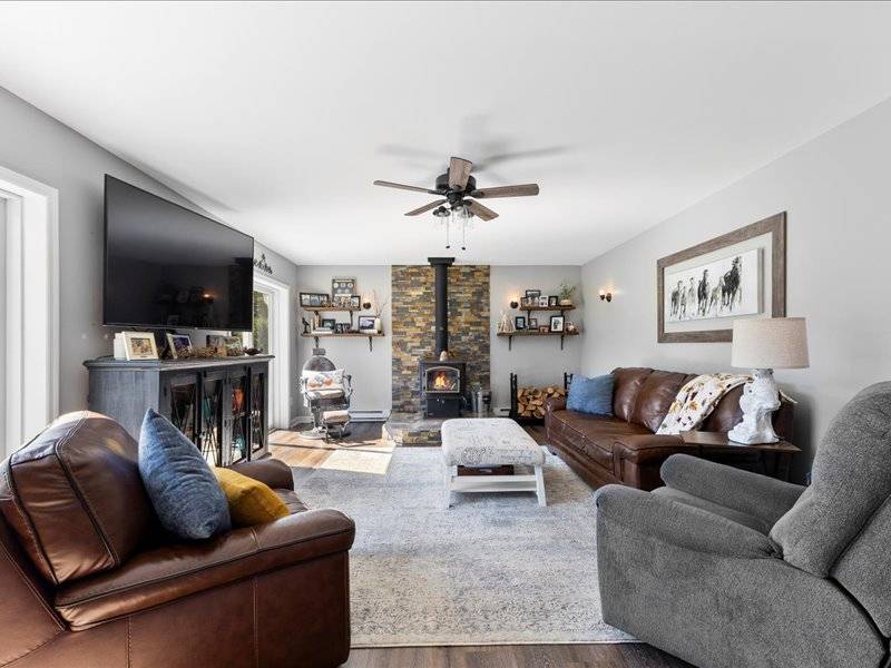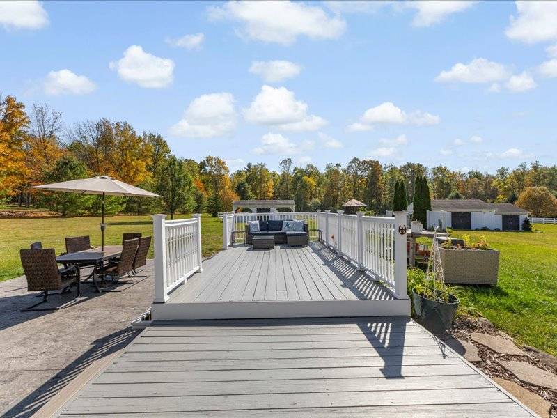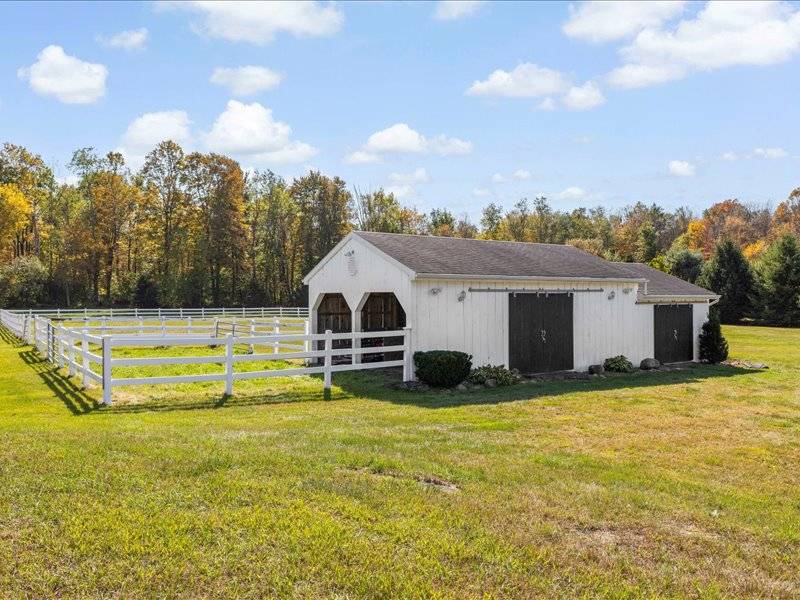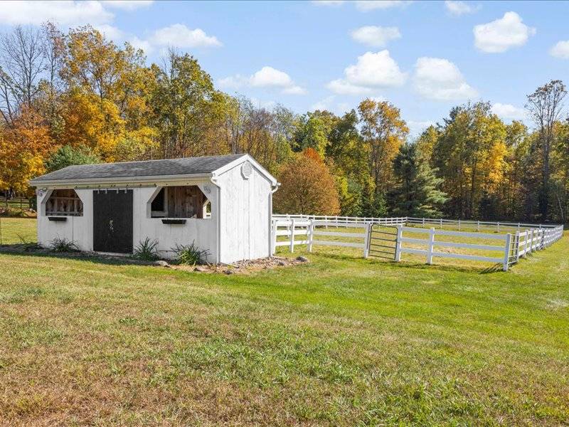 This home shows like a staged model with wide plank luxury vinyl flooring throughout the first floor. The open layout includes a sunken family room featuring a wood stove with a dramatic floor-to-ceiling stone surround. Bright and spacious, the home offers large windows overlooking the back property, barns, and paddocks—perfect for keeping an eye on a horse or two. The versatile property lends itself to many endeavors. Enjoy the multi-level back deck, stamped concrete patio, and fire pit. A screened-in deck with two paddle fans makes outdoor living comfortable day and night. The first floor also includes a laundry room and half bath, which could easily be converted to a full bath. The showcase kitchen offers an island, granite counters, abundant cabinet space, black stainless Samsung appliances, under-cabinet lighting, and a subway tile backsplash. An attached two-car garage is complemented by a detached garage currently used as a workshop and workout space. Additional outbuildings include a barn that could serve as a chicken coop or wood storage, plus two barns and paddocks suitable for horses.