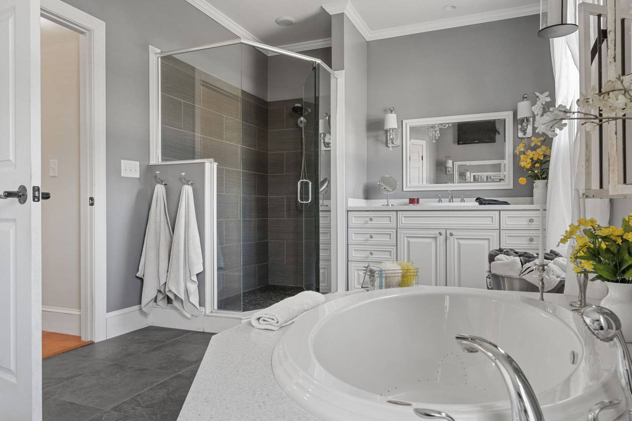 - • Primary bathroom with 2 sinks, jetted soaking tub, and tiled shower