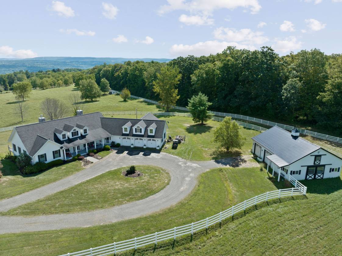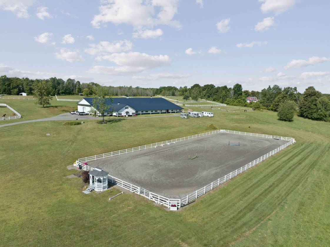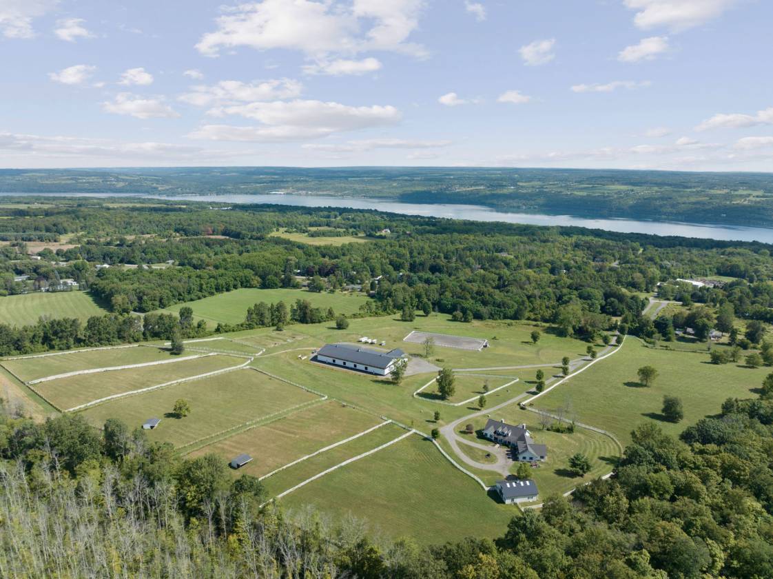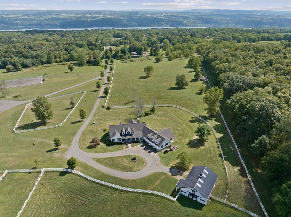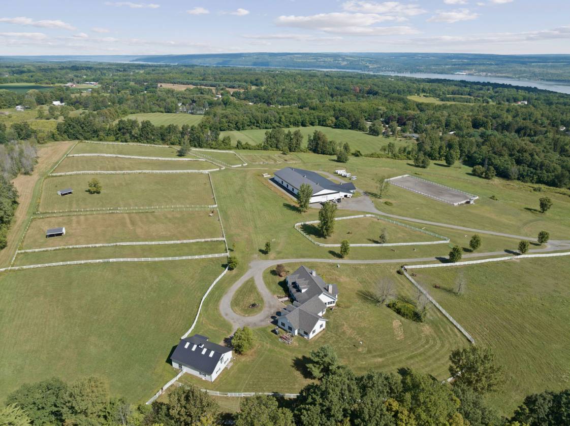 Hidden from view, yet just minutes from Cornell University, this gated equestrian estate offers a setting and opportunity unlike any other. Nestled on 72 terraced acres, a tree-lined lane bordered by classic white fencing leads to a premier horse facility that combines lifestyle, business, and beauty in one extraordinary package. Currently home to a thriving boarding operation, this elite center offers endless possibilities for the discerning equestrian. Whether boarding, training, lessons, showing, rehab, rescue, or personal enjoyment, any discipline will thrive here. The centerpiece is a 14-stall barn (room for 4 more) with automatic waterers, fans, wash and grooming stalls, plus a heated office, meeting space, and client bathroom with shower. Year-round riding is a pleasure in the attached 80x205 indoor arena, while summer shows shine in the 100x230 outdoor arena with judge’s gazebo. Eight flex-fenced pastures, four smaller paddocks, and an additional 2-stall barn with storage offer ideal accommodations for horses of every need. The custom 4-bedroom, 3-bath Cape-style home is designed for both comfort and elegance. A light-filled great room with living, dining, and cook’s kitchen opens to a wall of Pella windows and glass doors leading to a deck that overlooks the property. A tiled sunroom captures peaceful views of the pastures, while the lower level and spacious attic provide expansion opportunities. The attached 3-car garage with workshop adds convenience and function. The terraced terrain is perfect for conditioning, with space for cross-country jumps and a two-mile perimeter trail. Explore 14 acres of woods and a 10-acre mowed meadow, ideal for riding, walking, or simply soaking in the beauty of the land. This is more than an equestrian property, it’s an unparalleled opportunity to live your passion, run a successful business, and create the equestrian lifestyle you’ve always envisioned, all in a premier location near Ithaca, Cayuga Lake, and the best of the Finger Lakes.