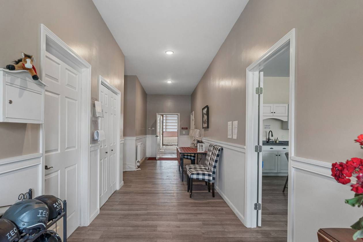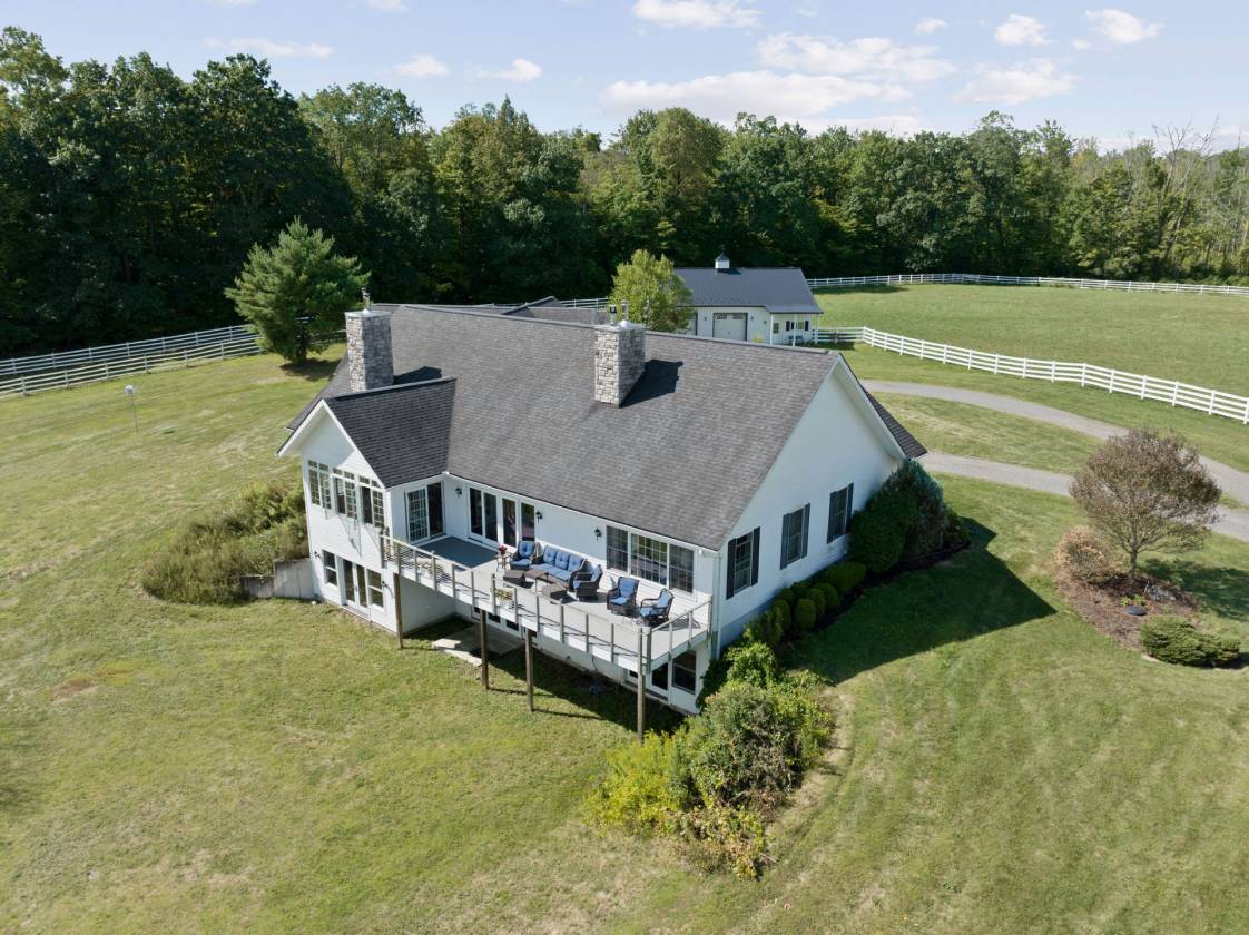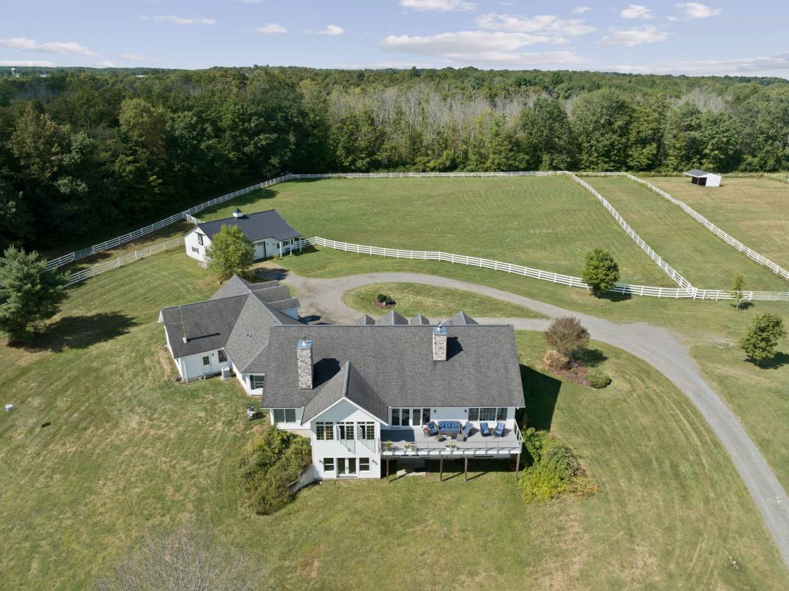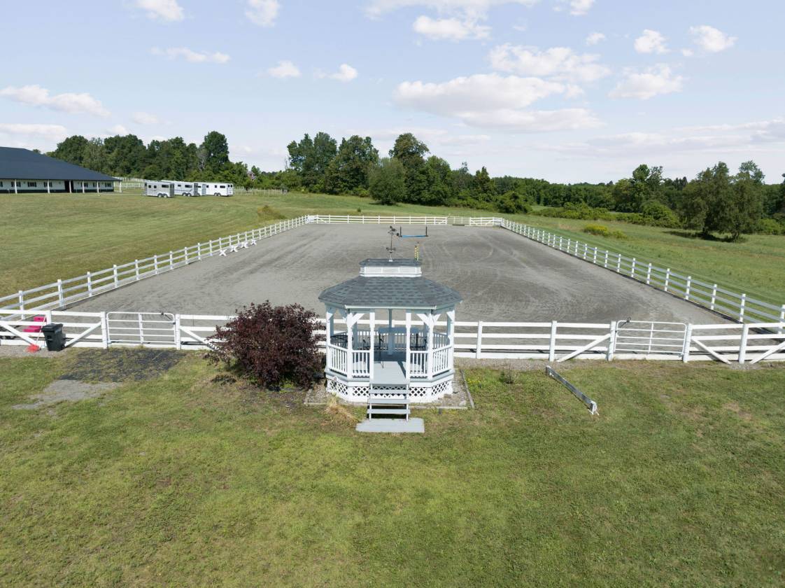 Hidden from view, yet just minutes from Cornell University, this gated equestrian estate offers a setting and opportunity unlike any other. Nestled on 72 terraced acres, a tree-lined lane bordered by classic white fencing leads to a premier horse facility that combines lifestyle, business, and beauty in one extraordinary package. Currently home to a thriving boarding operation, this elite center offers endless possibilities for the discerning equestrian. Whether boarding, training, lessons, showing, rehab, rescue, or personal enjoyment, any discipline will thrive here. The centerpiece is a 14-stall barn (room for 4 more) with automatic waterers, fans, wash and grooming stalls, plus a heated office, meeting space, and client bathroom with shower. Year-round riding is a pleasure in the attached 80x205 indoor arena, while summer shows shine in the 100x230 outdoor arena with judge’s gazebo. Eight flex-fenced pastures, four smaller paddocks, and an additional 2-stall barn with storage offer ideal accommodations for horses of every need. The custom 4-bedroom, 3-bath Cape-style home is designed for both comfort and elegance. A light-filled great room with living, dining, and cook’s kitchen opens to a wall of Pella windows and glass doors leading to a deck that overlooks the property. A tiled sunroom captures peaceful views of the pastures, while the lower level and spacious attic provide expansion opportunities. The attached 3-car garage with workshop adds convenience and function. The terraced terrain is perfect for conditioning, with space for cross-country jumps and a two-mile perimeter trail. Explore 14 acres of woods and a 10-acre mowed meadow, ideal for riding, walking, or simply soaking in the beauty of the land. This is more than an equestrian property, it’s an unparalleled opportunity to live your passion, run a successful business, and create the equestrian lifestyle you’ve always envisioned, all in a premier location near Ithaca, Cayuga Lake, and the best of the Finger Lakes.