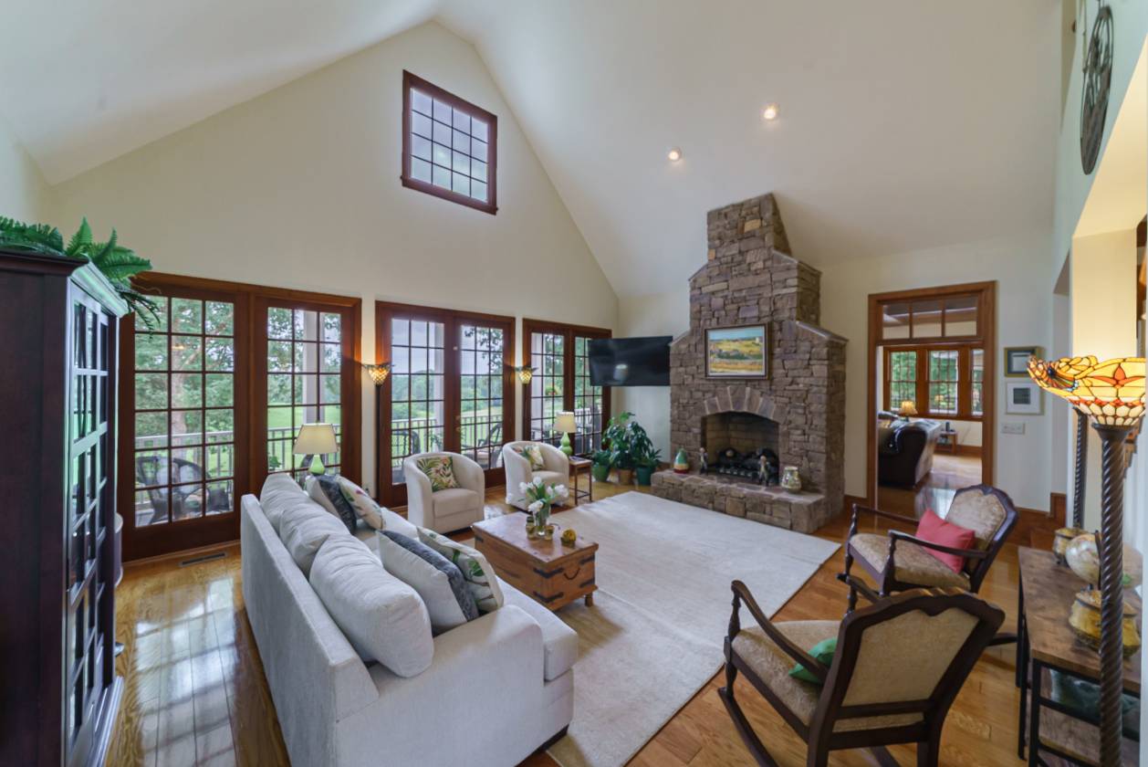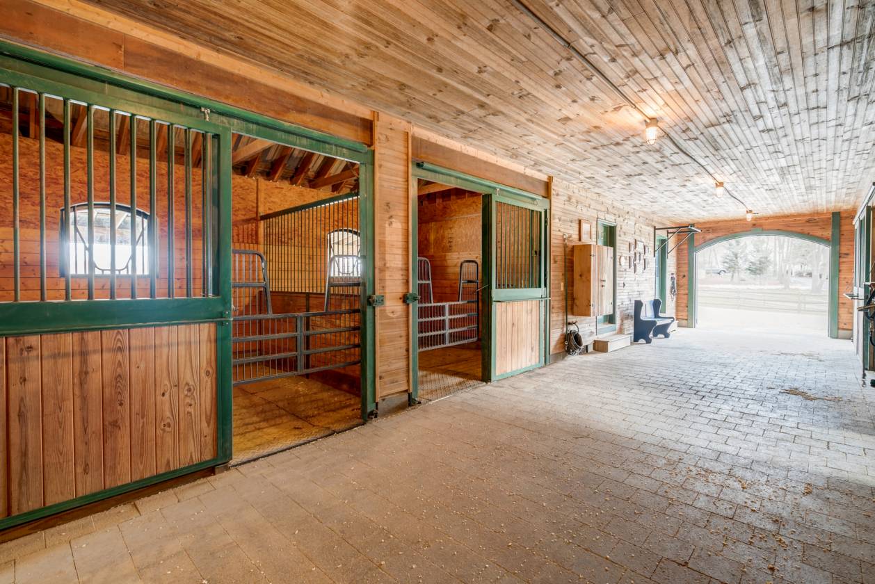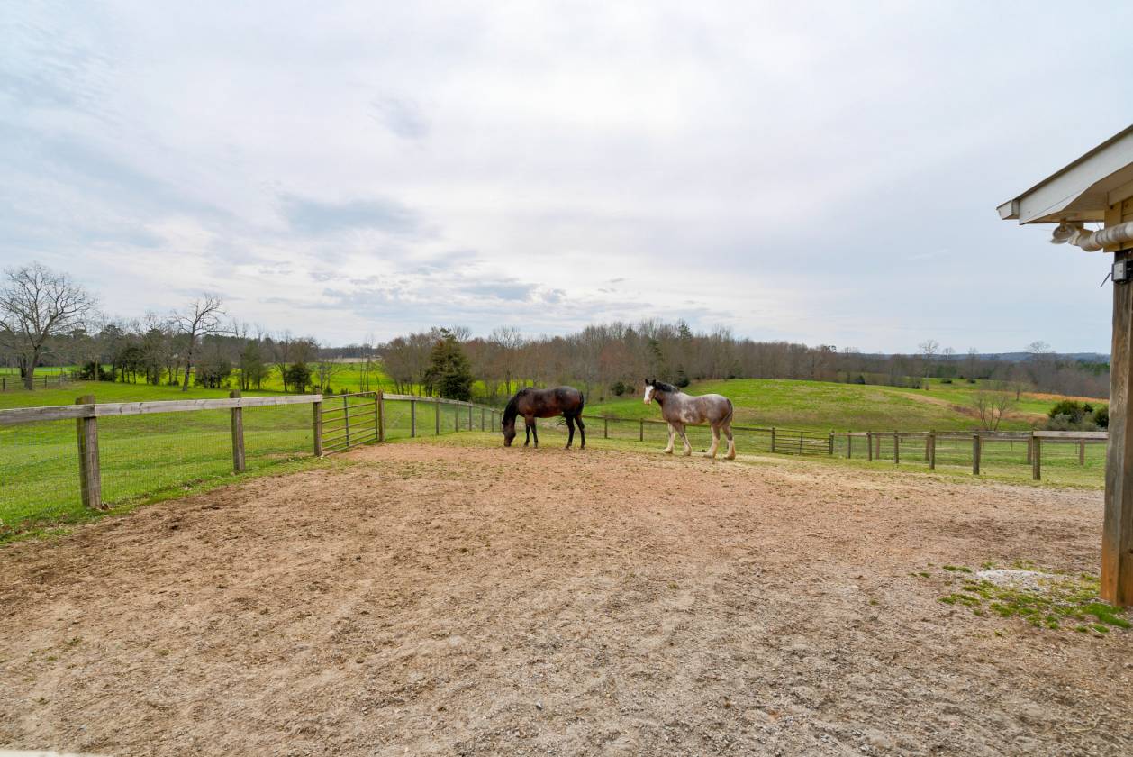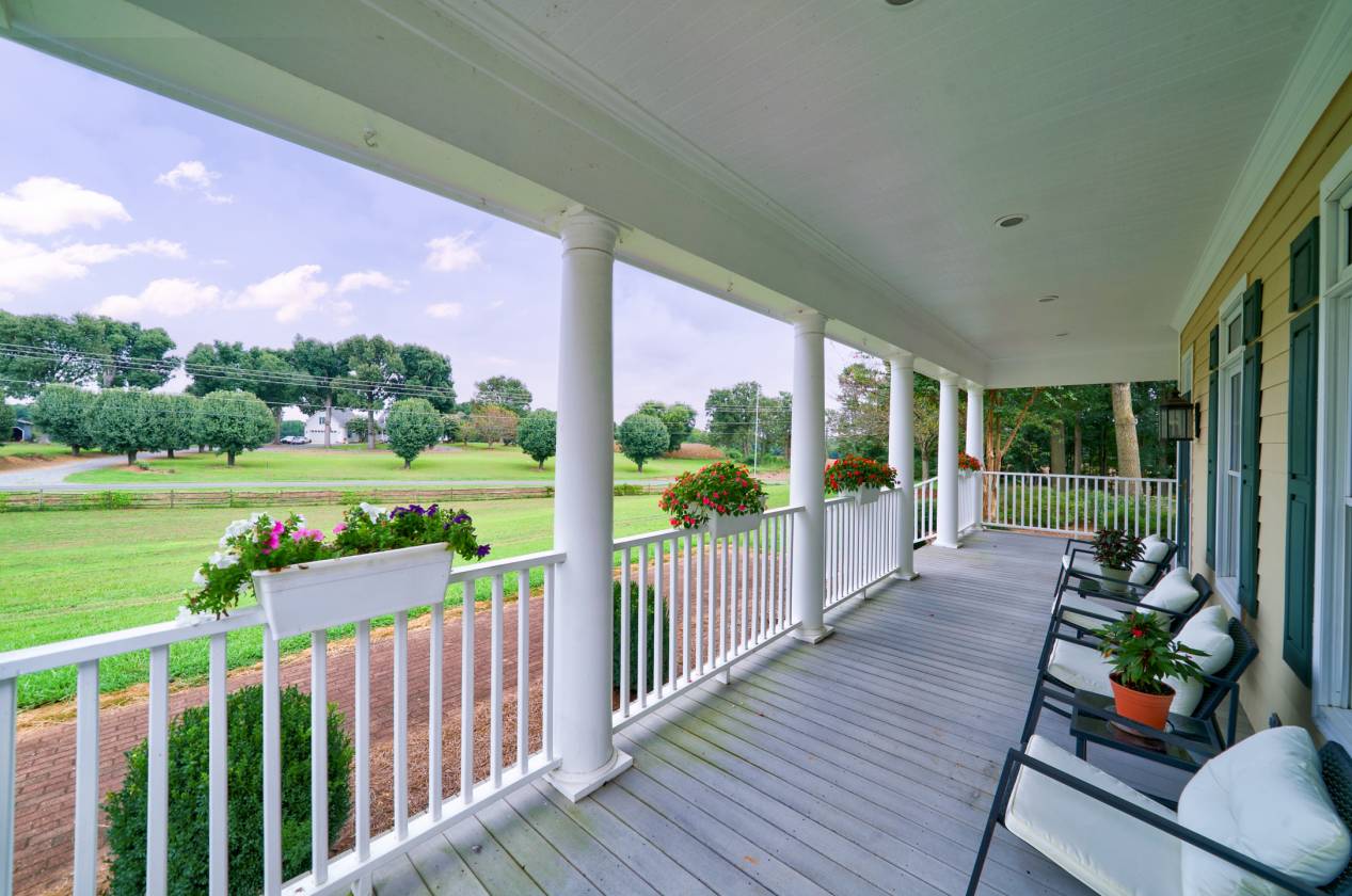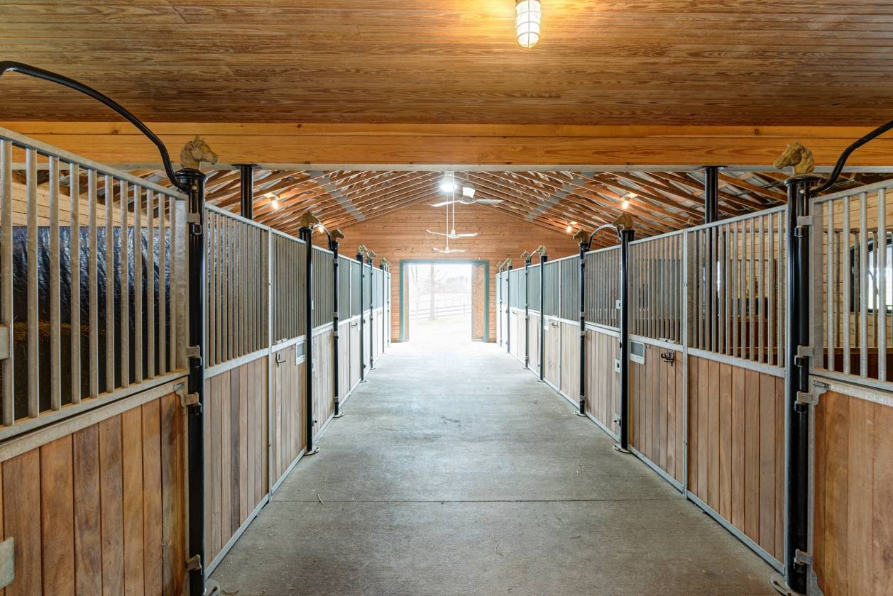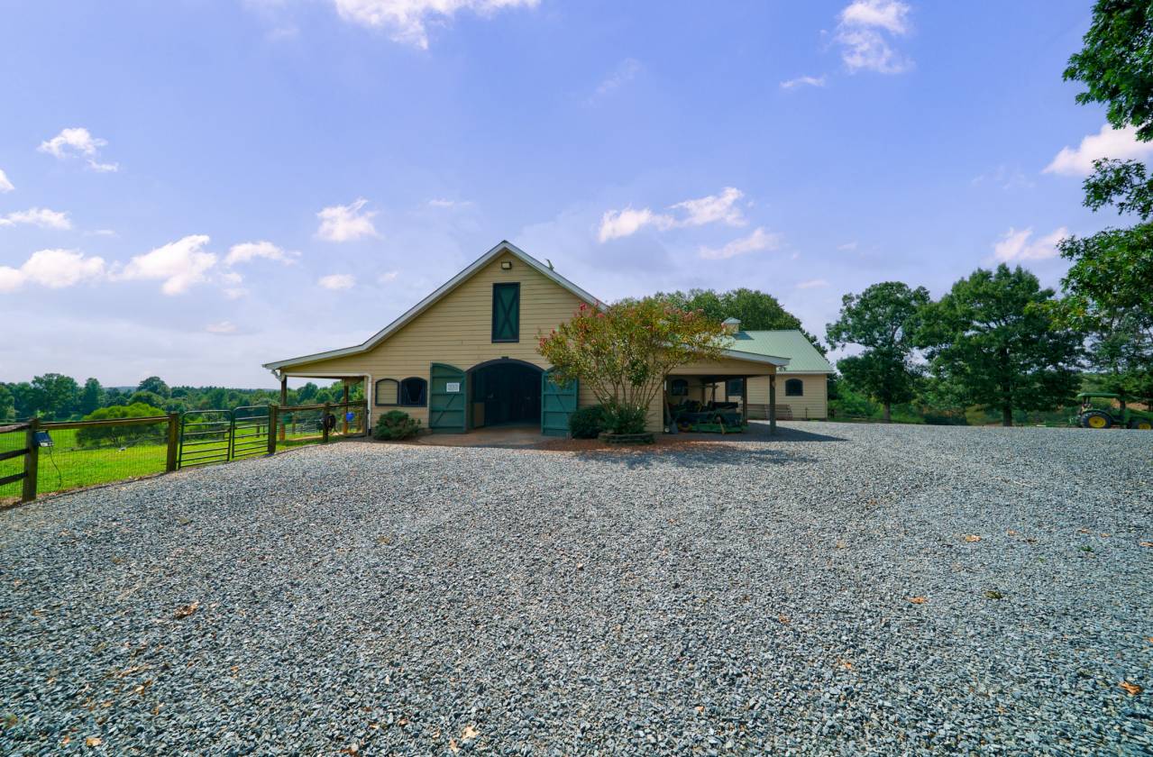 A remarkable equestrian estate on more than 29 acres, this Southern Living home reflects a thoughtful connection to land and lifestyle. Privately sited at the end of a gated drive, the residence features wraparound porches and expansive decking that embrace the surrounding farmland. The main house offers 10-foot ceilings, hardwood floors, custom trim, and abundant natural light through French doors and tall windows. A floor-to-ceiling stone fireplace anchors the cathedral-ceiling great room, with seamless flow into the keeping room, kitchen and breakfast area. The chef’s kitchen showcases knotty pine cabinetry, stainless-steel appliances, quartz countertops, a walk-in pantry, built-in desk and built-n bench with breakfast table. The main-level primary suite includes a spa-inspired bath, soaking tub, large frameless shower and oversized walk-in closet. Upstairs are two guest suites, private baths, walk-in closets and a flexible bonus room. Plenty of storage space. A breezeway connects the main home to a 2022 two-car garage with upper-level living space (was permitted as an office with bathroom). A separate gated drive leads to a European-style barn with 14 matted stalls, two convertible broodmare stalls, wash station, heated tack room, heat lamps for wash stall, feed room, office, and walk-up hayloft. Additional equestrian amenities include five fenced paddocks, a covered run-in w/storage, a round pen and a professional-grade 125’ by 225’ arena. RV hook up near the home, equipment storage attached to the barn, full house generator and a tall crawl space with dehumidifier are just a few of the additional features. Offering privacy, functionality and timeless charm, this estate is a rare opportunity for equestrian enthusiasts seeking a blend of tradition and modern comfort. Sunsets over the pastures will take your breath away will keep your camera clicking away.