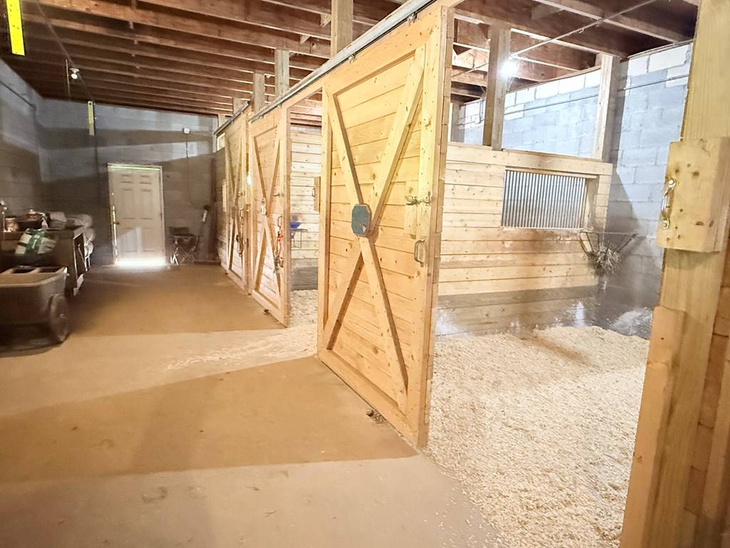 - Barn with 3 regular stalls, hay stall, shoeing area, front and back entry, large covered lean too for horses to get out of weather. Very nice trotting arena