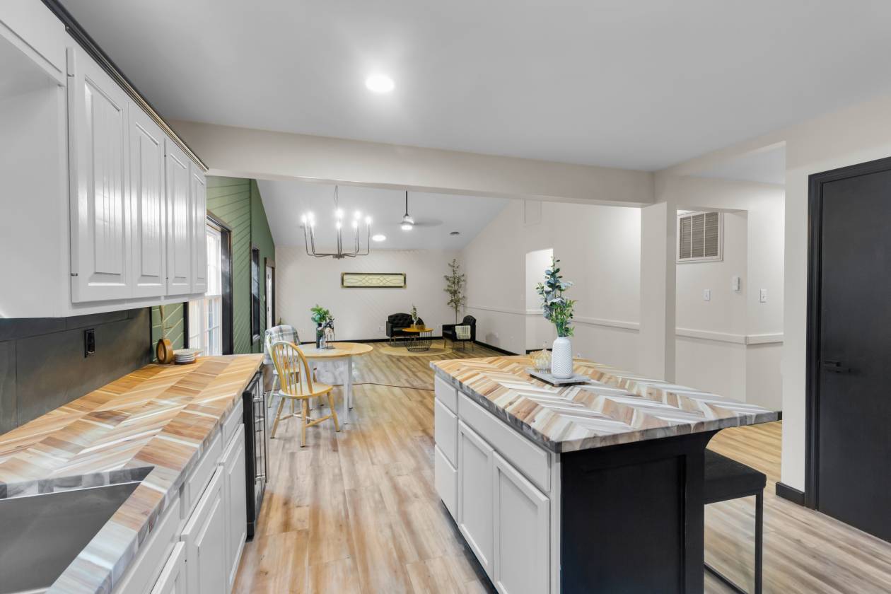 - Step inside to discover an inviting open floor plan filled with natural light and spacious living areas. This 5-bedroom, 2-bathroom home features all-new fixtures and luxury vinyl plank (LVP) flooring throughout, giving it a fresh, modern feel. The kitchen is a true highlight, boasting butcher block countertops, modern cabinetry, and stainless-steel appliances, with plenty of space for gathering around the large island or enjoying family meals. The cozy living room offers the perfect spot to unwind while overlooking the serene backyard, and the primary suite provides a relaxing retreat with an updated bathroom that complements the home’s thoughtful upgrades.