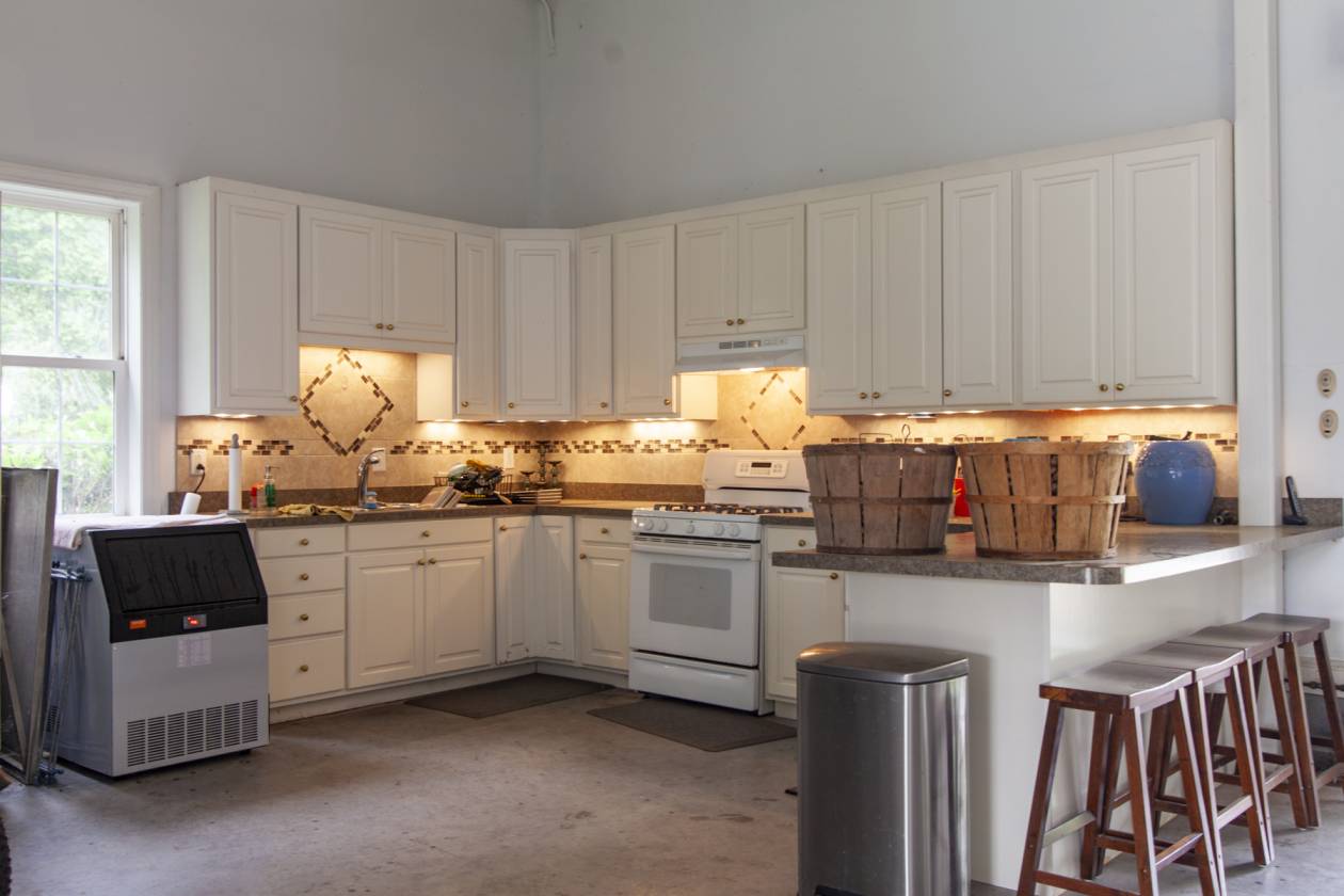 Just inside the adjacent oversize 4 car garage, is a second kitchen with double stainless-steel sink, gas stove and island with additional seating. This is also an ideal space for preparing and preserving your garden harvest.